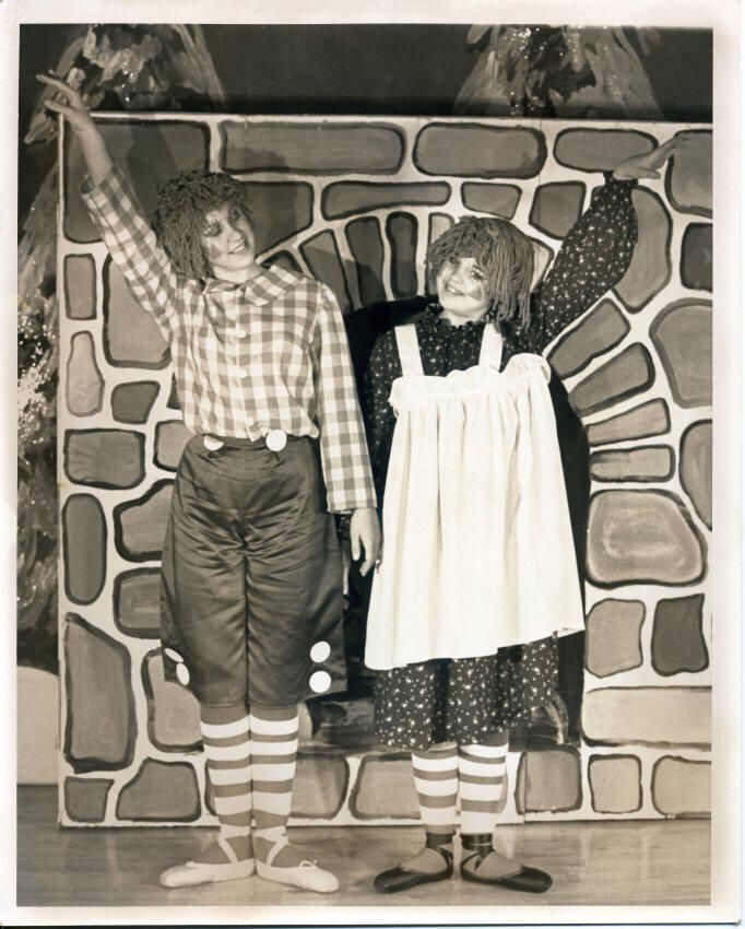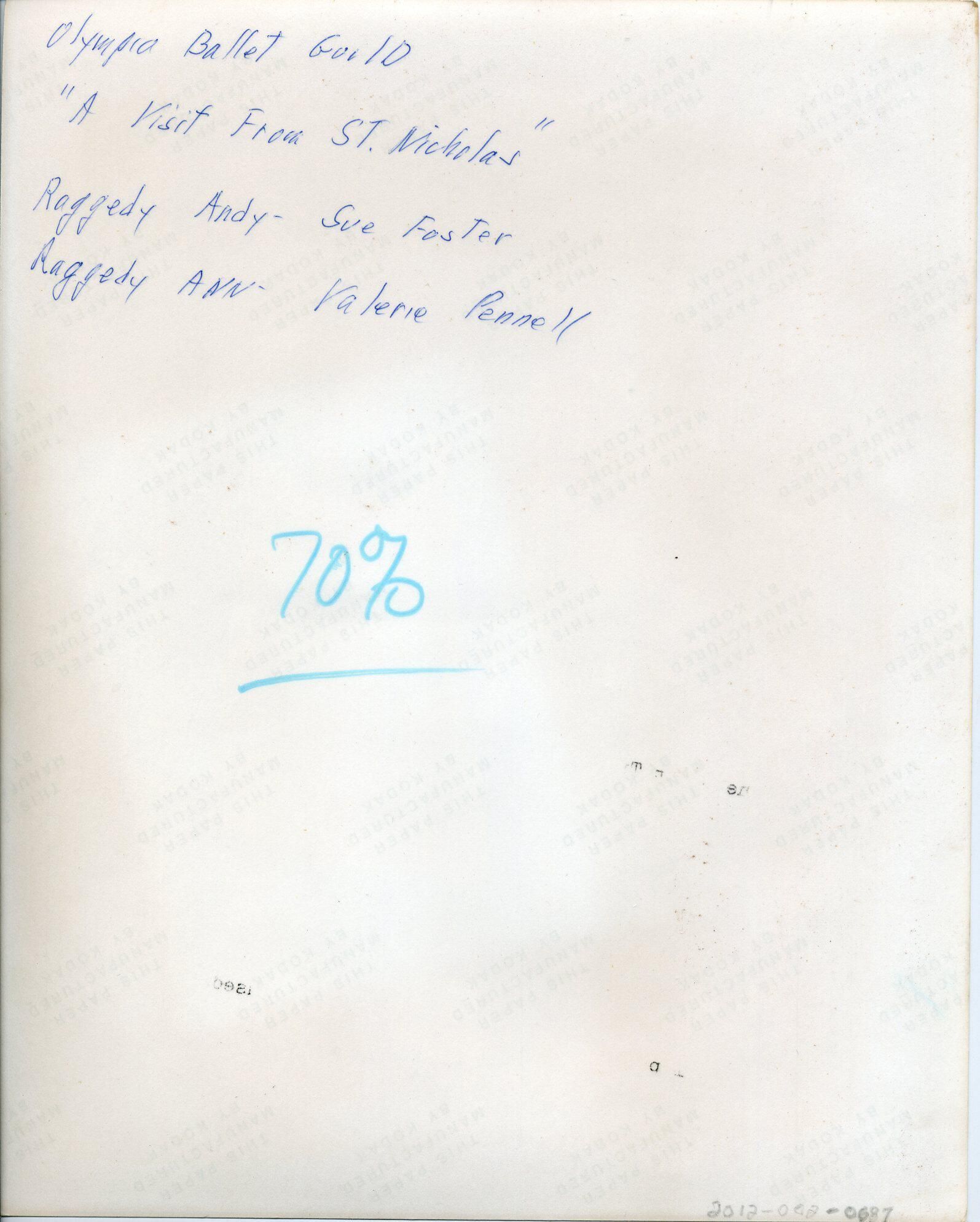 Black and white photo of two girls dressed as Raggedy Ann and Raggedy Andy. Both girls have on medium dark wigs. The girl on the left has a checkered shirt over dark trousers and horizontally striped socks and ballet slippers. Her right arm is extended over her head. The girl on the right has a white apron over a polka dotted dress. She also has striped socks and ballet slippers. Her left arm is extended above her head. Behind them is a scenery flat decorated with stylized stones around a fireplace. In the background is part of a wall with what might be trees painted on it. There is a white border on all sides. On the back in green felt pen is "70%" and in ink "Olympia Ballet Guild 'A visit From St. Nicholas' Raggedy Andy - Sue foster Raggedy Ann - Valerie Pennell".