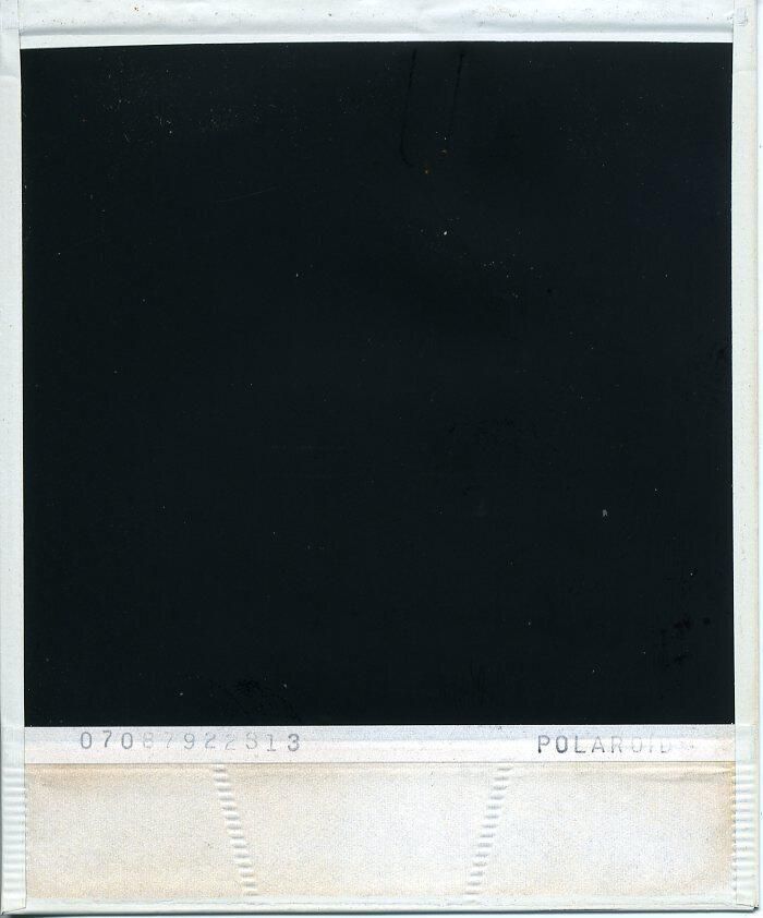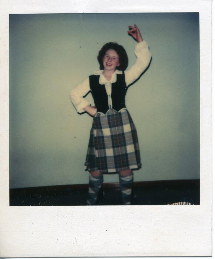 Color Polaroid photo of a girl dressed in Scotish clothes, a white blouse, a black vest, and a plaid skirt. She has dark hair and has one arm raised There is a blue wall behind her. There is a white border on all sides with the bottom border being larger. On the back is a series of numbers and the word "polaroid".