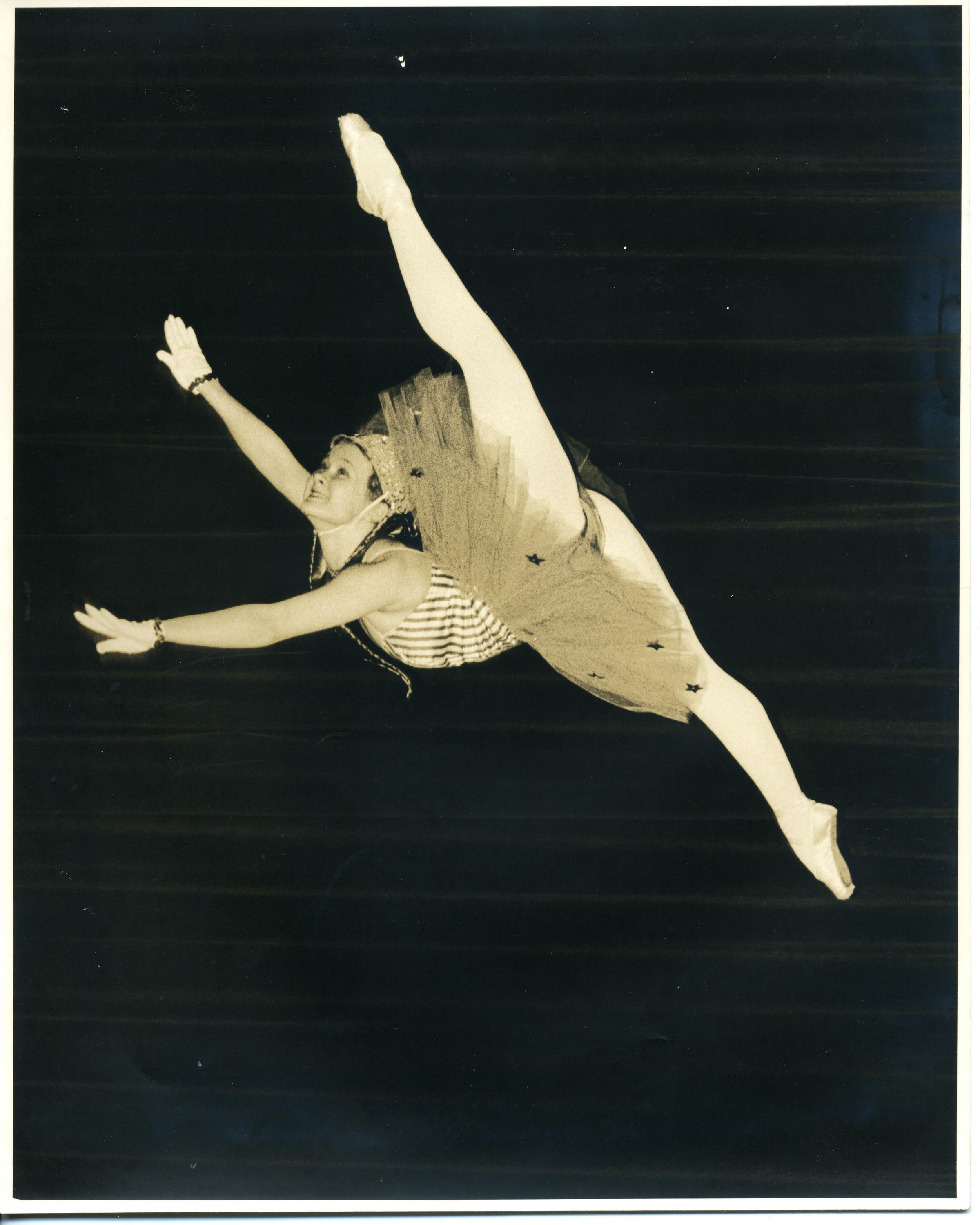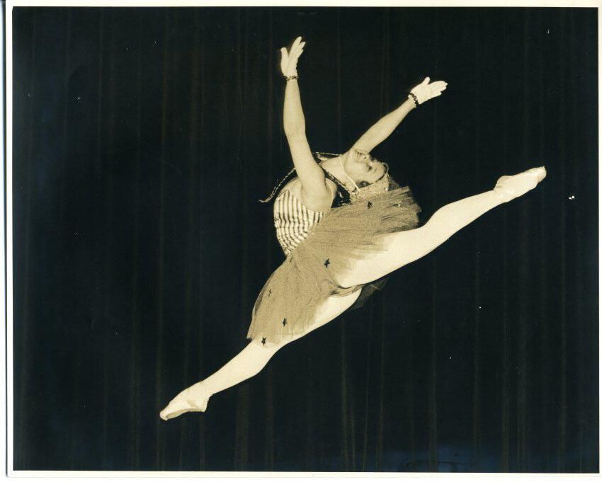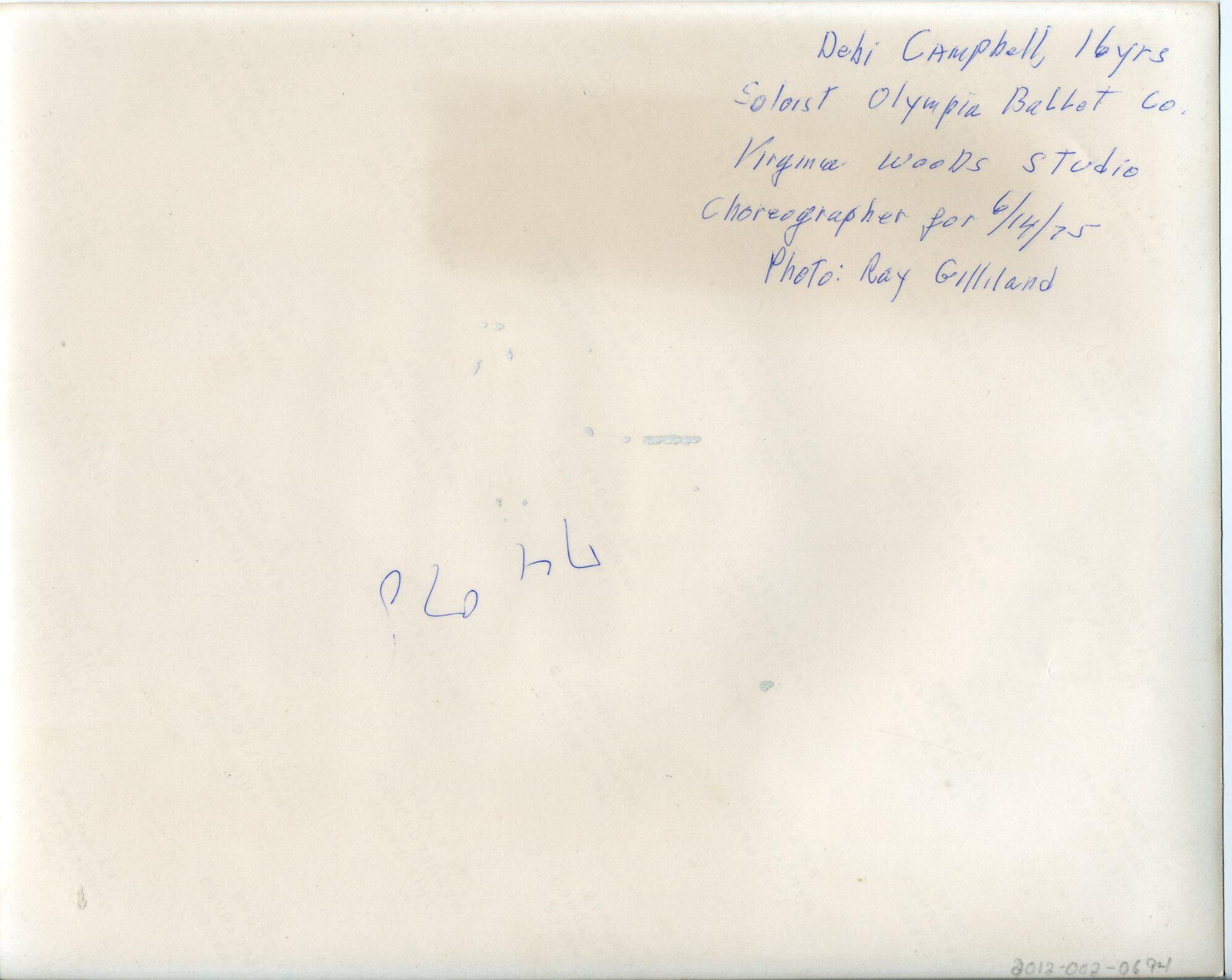 Black and white photo of a ballet dancer. She is wearing a helmet-style cap with a chin covering, a striped body garment, and a short skirt with star decorations. She has on gloves and ballet slippers. She is in the process of a leap with arms extended and legs split. The background is all black. There is a white border on all sides. On the back in blue ink is "74%" and "Debi Campbell, 16 yrs Soloist Olympia Ballet Co Virginia Woods Studio Choreographer for 6/14/75 Photo Ray Gilliland".