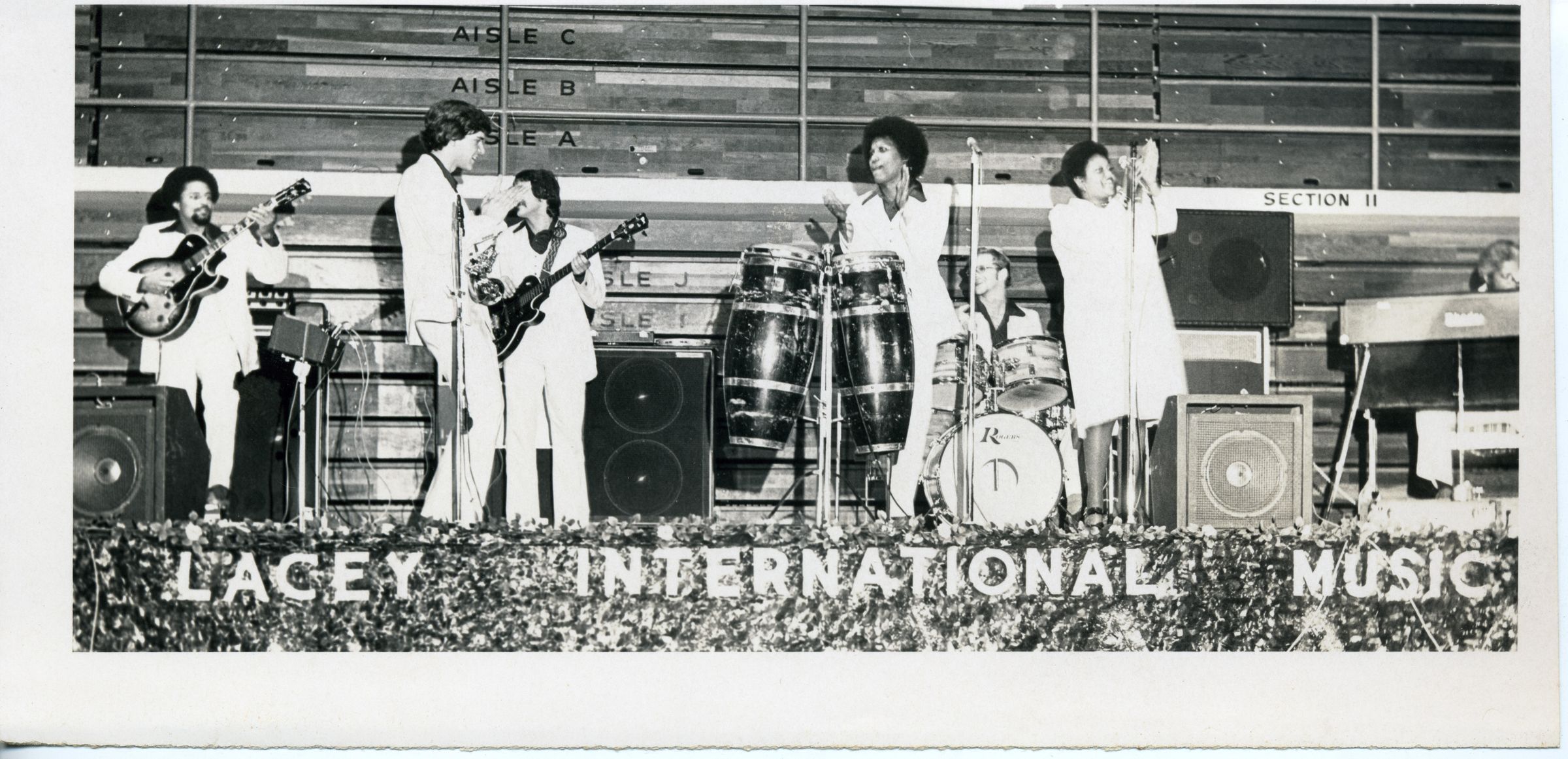 Black and white photo of a band on a stage. There six men and one woman visible or partially visible. On the front of the stage is a hedge-type decoration and the words "Lacey International Music". All of the band members have dark hair of various lengths and styles. Two of the men are holding guitars, one is behind a pair of odd shaped percussion instruments, one is behind a standard drum set, one is at a keyboard and the woman is clapping her hands. Behind them all are collapsed bleachers with all or part of the word "aisle" on each set plus the letters i, j,a,b, and c. About half way up toward the top of the image is a metal railing and on what appears to be the floor of a balcony is "section 11". On the stage are amps, speakers. and microphone stands. There is a white border on all sides. On the back in blue ink is "100%".
