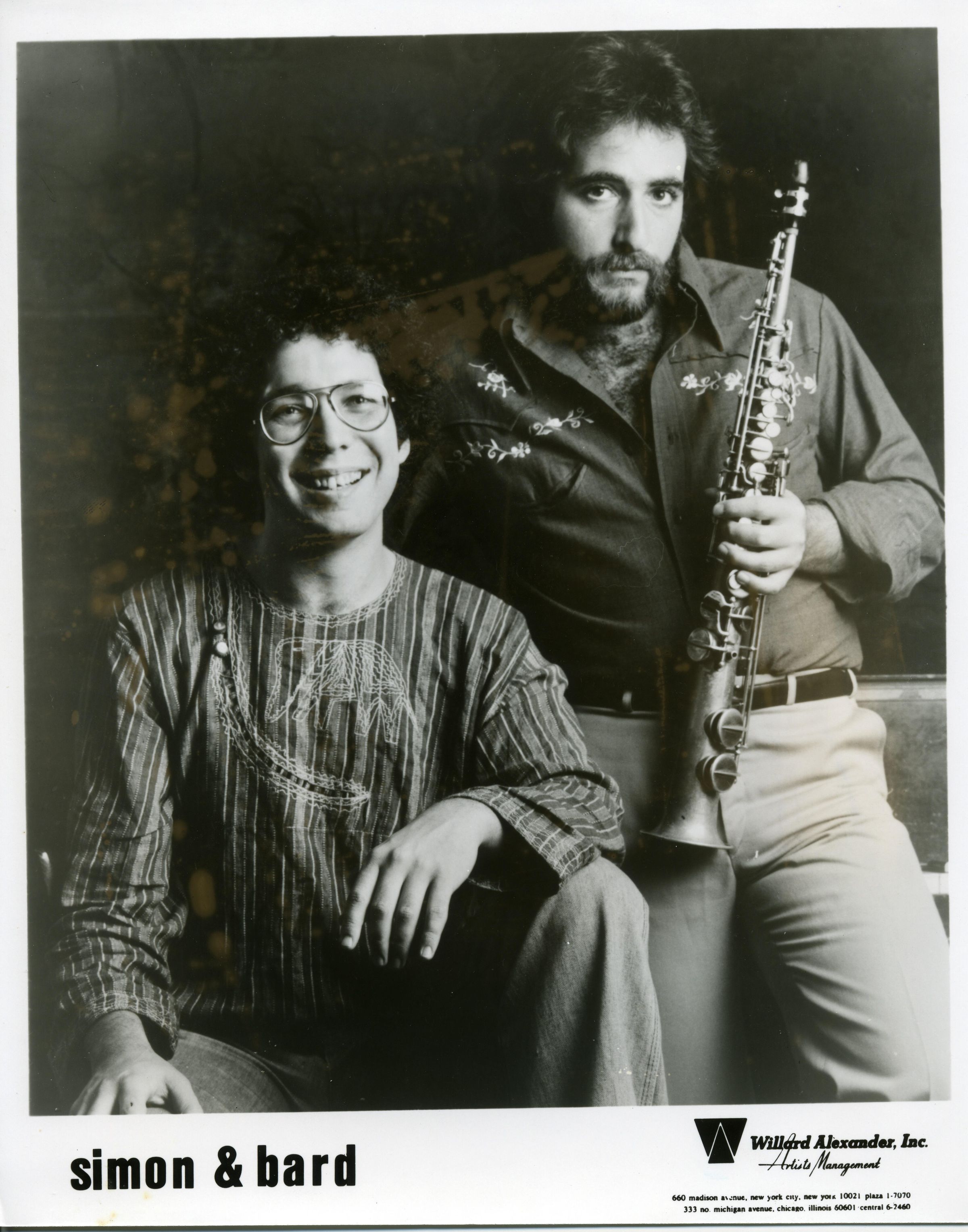 Black and white photo of two men. On the left is a man with dark curly hair with glasses. He is wearing a vertically striped shirt with stitching decoration that shows an elephant and an artistic curve. The other man has dark hair and a mustache and beard. He has on a dark shirt with white flower decoration and white trousers. In the open collar of the shirt can be seen the man's chest with dark hair or other decoration. He is holding a clarinet Behind the two is a drop with a floral pattern. There is a white border on all sides, and in the bottom border is "simon & bard" and after a stylized "W" is "Willard Alexander, Inc. Artists Management 660 madison avenue, new york city, new york 10021 plaza 1-7070 333 michigan avenue chicago, illinois 60601 central 6-7460". On the back in blue ink is "3 col return to Terry Turner".