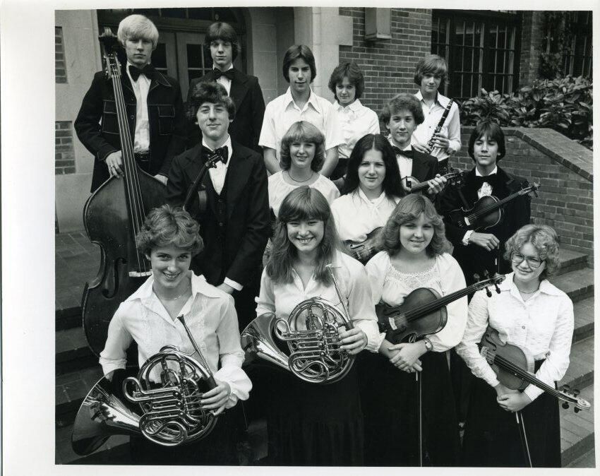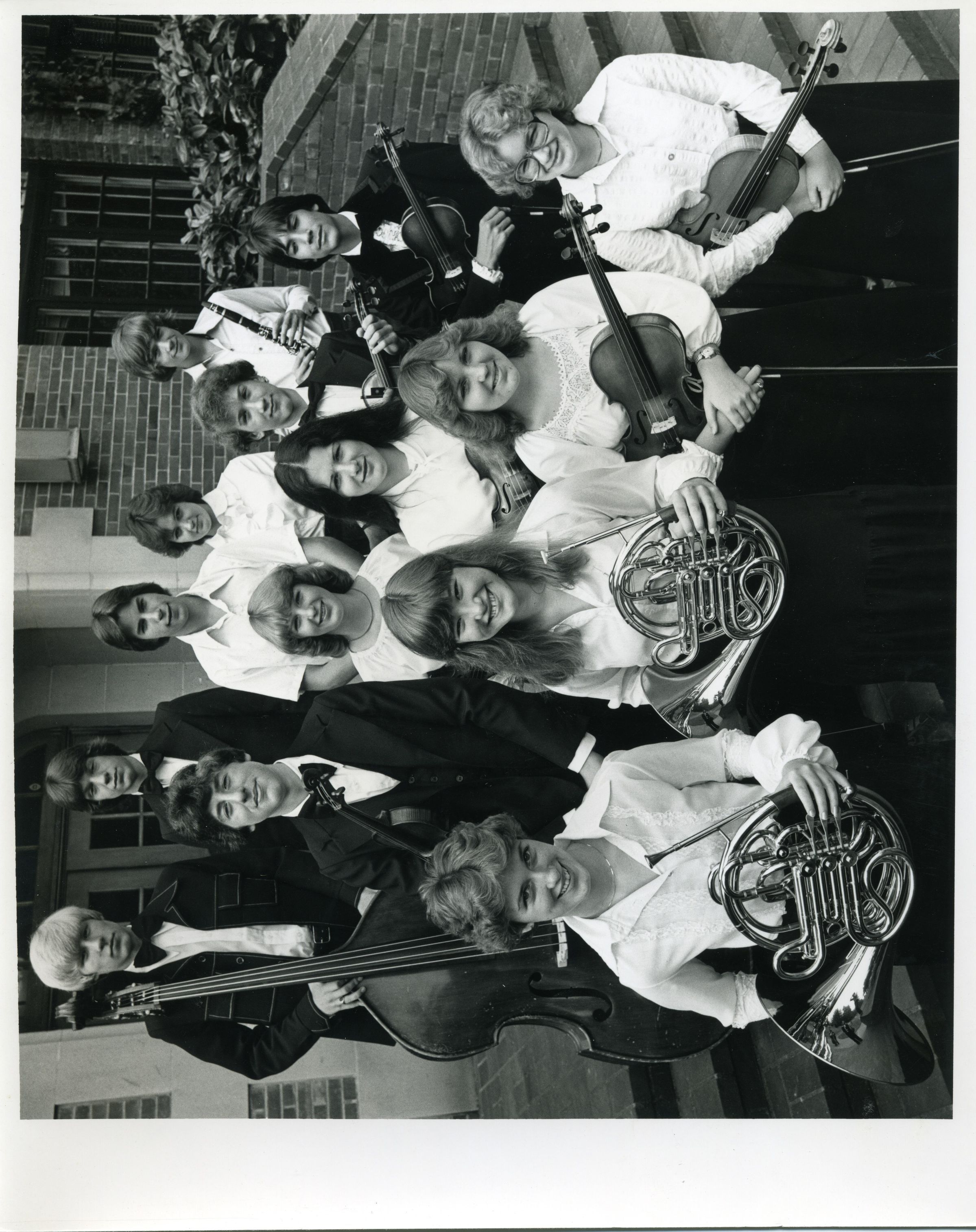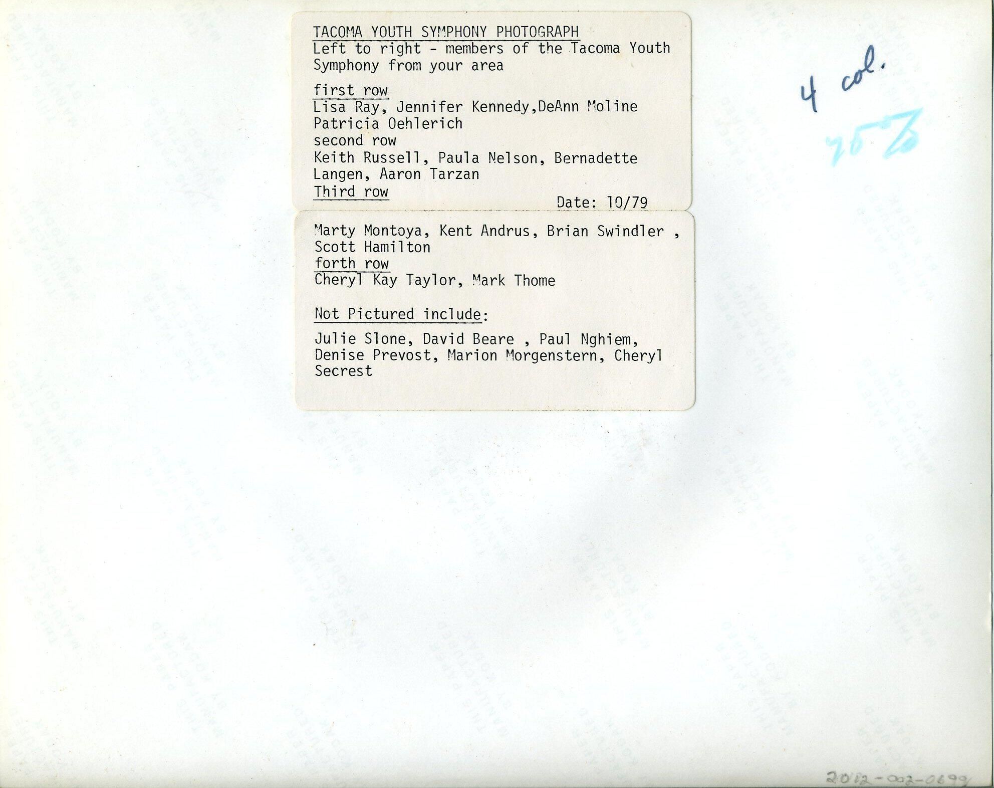 Black and white photo of some members of the Tacoma Youth Symphony. In the row nearest the camera on the left is a girl with light hair wearing a white blouse and dark skirt. She is holding a French Horn. Next is a girl with long brown hair and a white blouse and dark skirt. She is holding a French Horn. Next is a girl with medium length light colored hair wearing a white blouse and a dark skirt. She is holding a violin. Next is a girl with light hair and wearing glasses. She has on a white blouse and dark skirt. She is holding a violin. In the second row is a boy with dark hair and wearing a dark suit over a white shirt. He is holding a stringed instrument that is only partially visible. Next is a girl with blond hair and a white blouse. Next is a girl with dark hair and wearing a white blouse. She is holding a stringed instrument that is only partially visible. Next is a boy with dark hair and a dark suit over a white shirt and dark bow tie. He is holding a violin. In the back row is a boy with blond hair and wearing a dark suit over a white shirt and bow tie. He is holding a Cello. Next is a boy with dark hair wearing a dark suit over a white shirt and bow tie. Next is a boy with dark hair wearing a white shirt. Next is a girl with dark hair wearing a white blouse. The last boy in that row has light hair and is wearing a white shirt. He is holding a clarinet. Behind them all is a building with entrance doors, brick walls, and windows. On the right is a brick railing and some steps that lead up to the entrance. There is a white border on all sides. On the back in dark ink is "4 col" and in green ink "75%". On a pasted-on paper is "Tacoma Youth Symphony Photograph Left to Right - members of the Tacoma Youth Symphony from your area first row Lisa Ray, Jennifer Kennedy, DeAnn Moline, Patricia Oehlerich second row Keith Russell, Paula Nelson, Bernadette Langen, Aaron Tarzan Third Row Date: 10/79 Marty Montoya, Kent Andrus, Brian Swindler, Scott Hamilton Forth row Cheryl Kay Taylor, Mark Thome Not pictured include: Julie Slone, David Beare, Paul Nghiem, Denise Prevost, Marion Morgenstern, Cheryl Secrest".