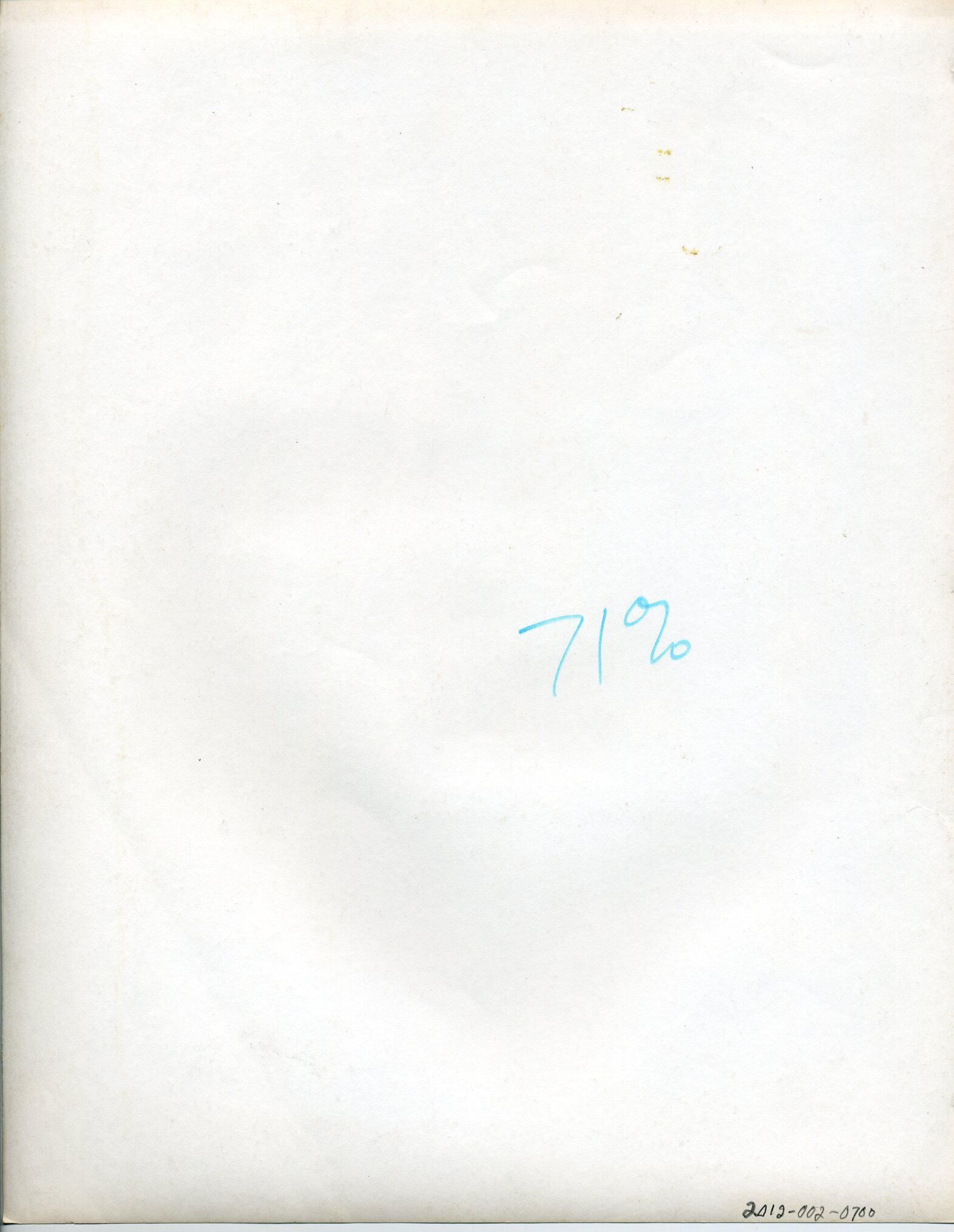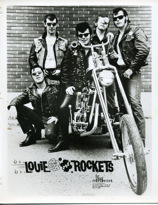 Black and white photo of five band members. All have dark hair and are wearing sun glasses and various forms of leather jackets with studs and leather trousers. In the center a man is sitting astride a motorcycle. At the left a man is crouching down. Behind him is a man with a jacket that is lighter colored than the others. It is open. On the right only a portion of a man is visible behind the motorcycle and the last man is standing sideways with his dark jacket open over a white shirt. There is a white border on all sides and in the bottom border is "Louie and the Rockets far west entertainment ???? booking agency 708 Union Street / Suite 201 Seattle, Washington 98101 (206) 622-2495". On the back in green ink is "71%".