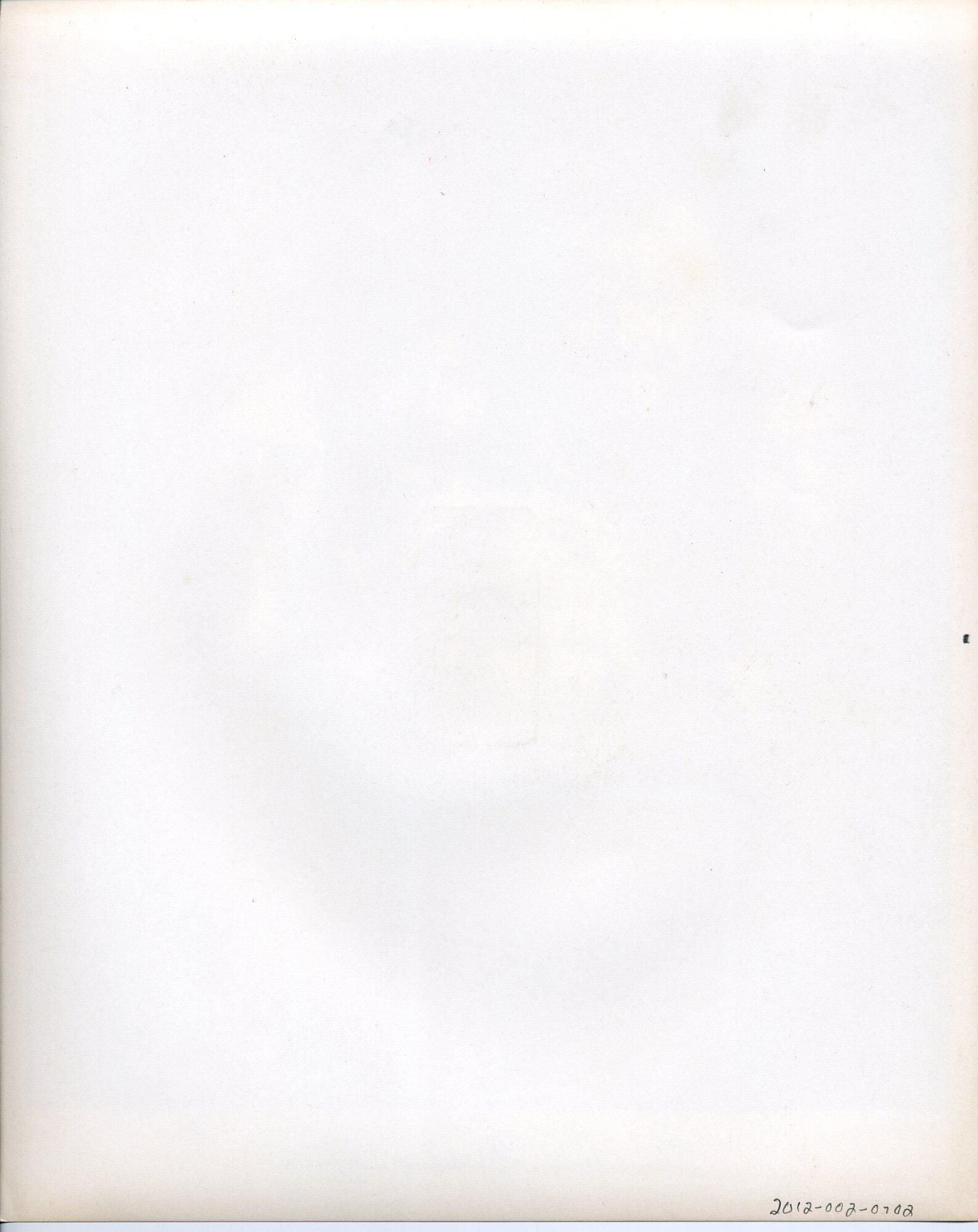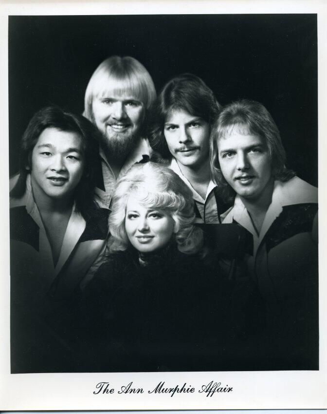 Black and white photo of five individuals from the Ann Murphie Affair musical group. In the foreground is a woman with blond hair and wearing a dark garment. Behind her on the left is a woman with dark hair and wearing a black and white garment open at the collar. Next is a man with blond hair and a mustache and beard. He has on a light colored shirt open at the collar. Next is a man with dark hair and a mustache. He has on a black and white shirt open at the collar. On the right is a man with dark hair who has on a black and white shirt open at the collar. The background is black. There is a white border on all sides with the bottom border being larger. In the bottom border is printed in black ink "The Ann Murphie Affair". There is no information on the back.Made/Created