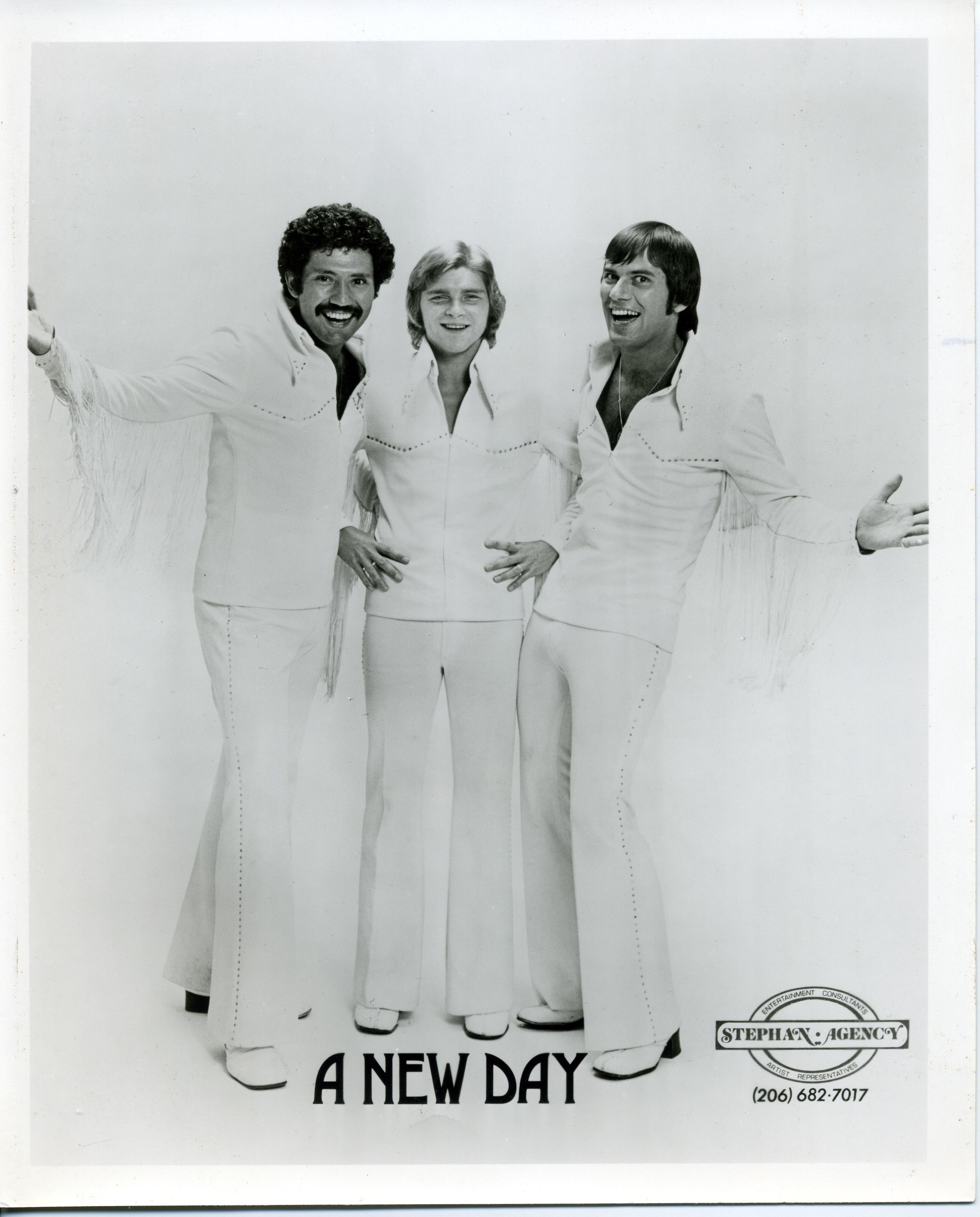 Black and white photo of the musical group A New Day. Three men are standing in a row with the outside men having their arms extended toward the edges of the print. The man on the left has dark curly hair and a mustache. The man in the center has long blond hair and the man on the right has long dark hair. All are wearing white shirts over white trousers and white shoes. The shirts are open at the collar and have dark stitching as decoration. At the bottom of the print in black ink is "A New Day" and a logo that says "Stephan Agency entertainment consultants artist representatives". There is a white border on all sides. There is no information on the back.Made/Created