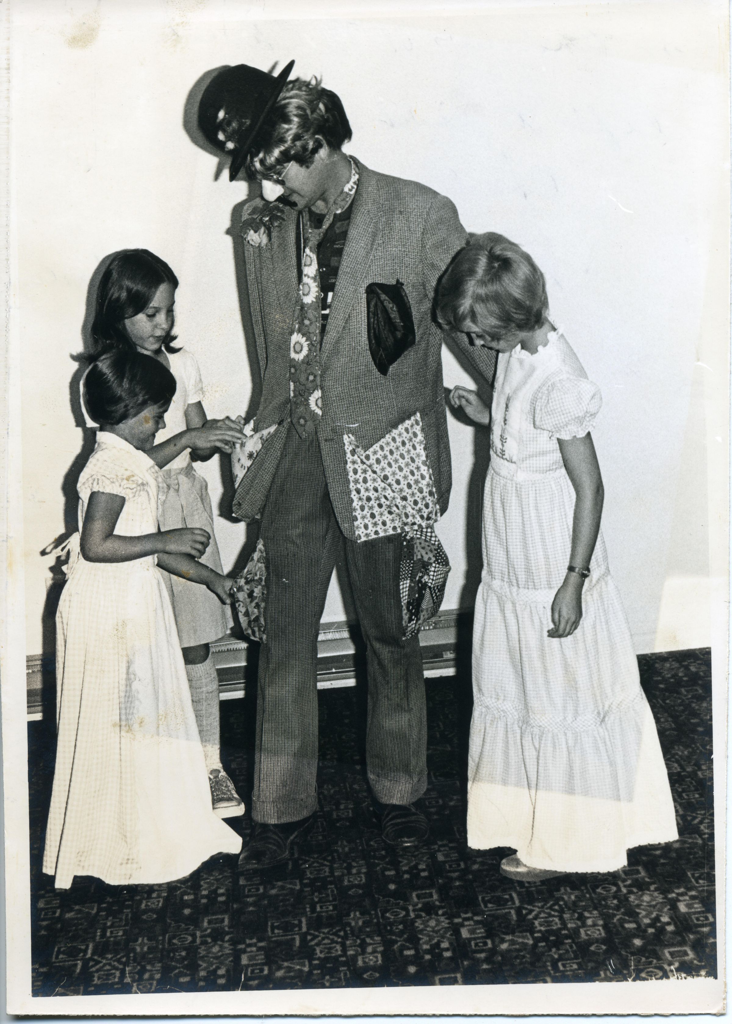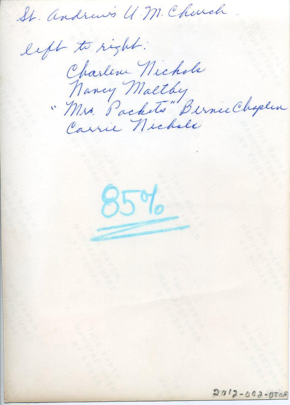 Black and white photo of four individuals. On the left is a girl with dark hair and a long white dress. Behind her is another girl with dark hair and a white blouse over a light colored skirt and long stockings and tennis shoes. On the right is a girl with light colored hair and a long white dress. The girls are looking at the "pockets" of a woman dressed in costume. She has a Derby hat over short hair and glasses. She has a fake nose and is wearing a checked jacket over a dark tee and medium dark trousers. She has a tie loosely knotted round her neck and her jacket has pockets and flaps sewn into it. They all are standing on a carpet in front of a white wall with what appears to a be baseboard heating at the bottom. There is a white border on all sides. On the back in ink is "St. Andrews U M Church left to right Charlene Nichols Nancy Maltby 'Mrs. Pockets' Bernice Chaplin Carrie Nichols". In green felt pen is "85%".