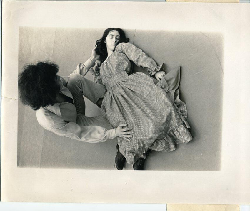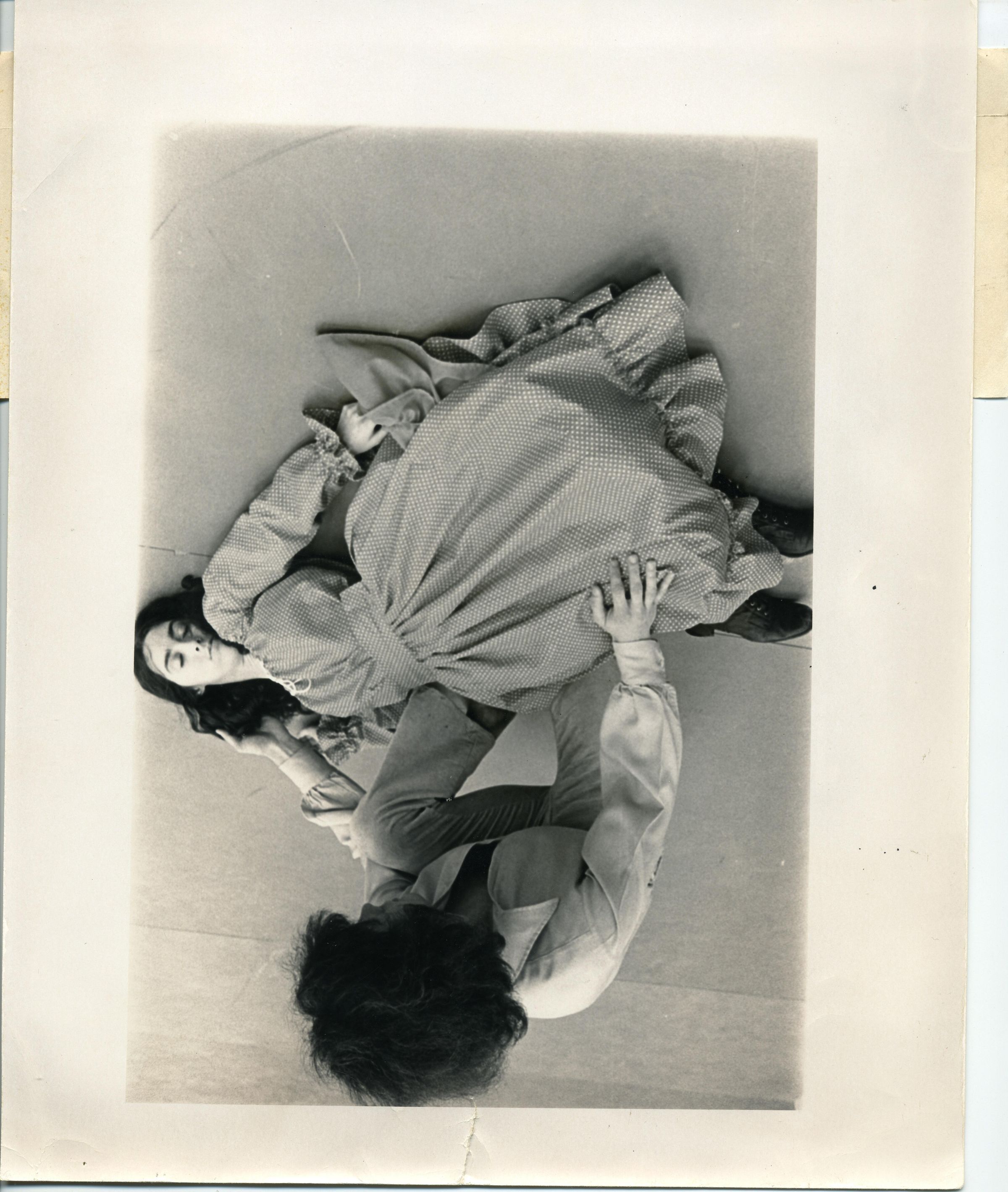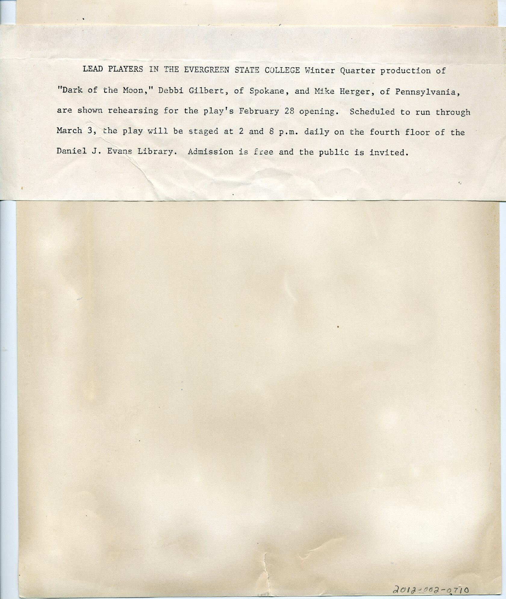 Black and white photo of two individuals rehearsing a play at The Evergreen State College. The man has long dark hair and is wearing a white shirt over tan trousers. He is leaning over the woman who is lying on the floor. She has long dark hair and is wearing a long checked dress. She has black shoes. Her eyes are closed. There is a large white border on all sides. On the back on a taped-on paper is "Lead players in The Evergreen State College winter quarter production of 'Dark of the Moon.' Debbi Gilbert, of Spokane, and Mike Herger, of Pennsylvania, are shown rehearsing for the play's February 28 opening. Scheduled to run through March 3, the play will be staged at 2 and 8 p.m. daily on the fourth floor of the Daniel J. Evans Library. Admission is free and the public is invited.". Under the paper in ink is "Mike Herger Debbi Gilbert".Made/Created