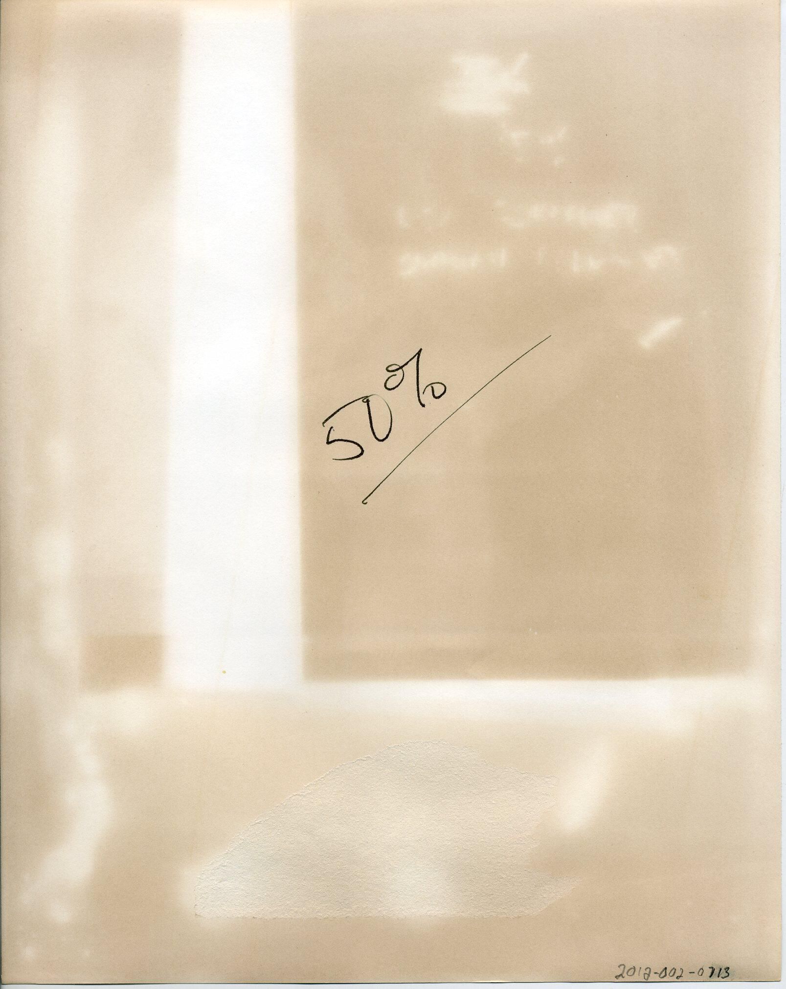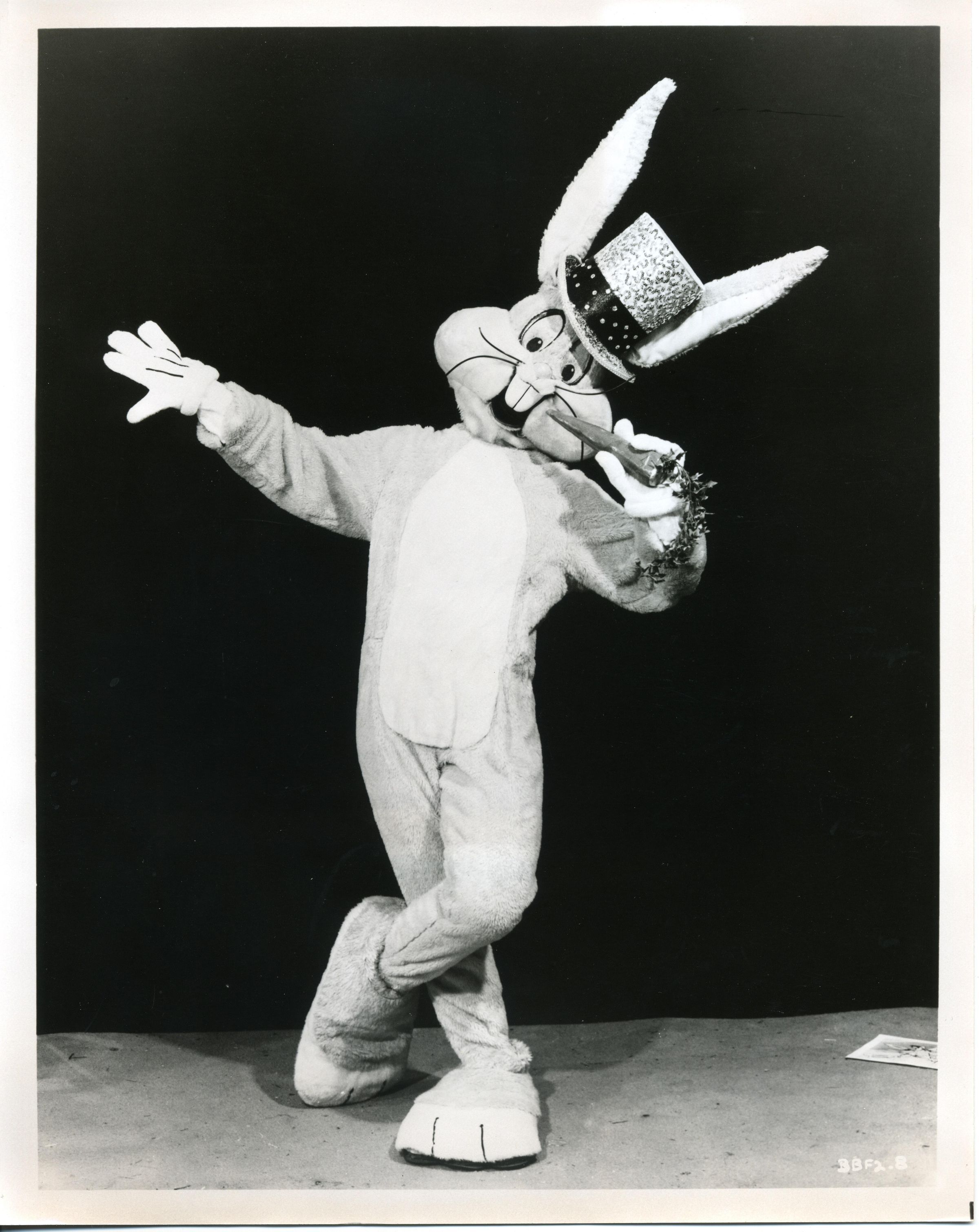 Black and white photo of a person in a bunny suit. The suit completely covers the person. There is a top hat that is a light color with a black band that has stars on it. There are large ears and a cartoon bunny face, a white suit with gloves and foot covers. The person is holding what appears to be a metal spike to his mouth as if it is a carrot. There is a white floor with a paper visible at the right and a black background that is probably a curtain. There is a white border on all sides. On the back in ink is "50%".