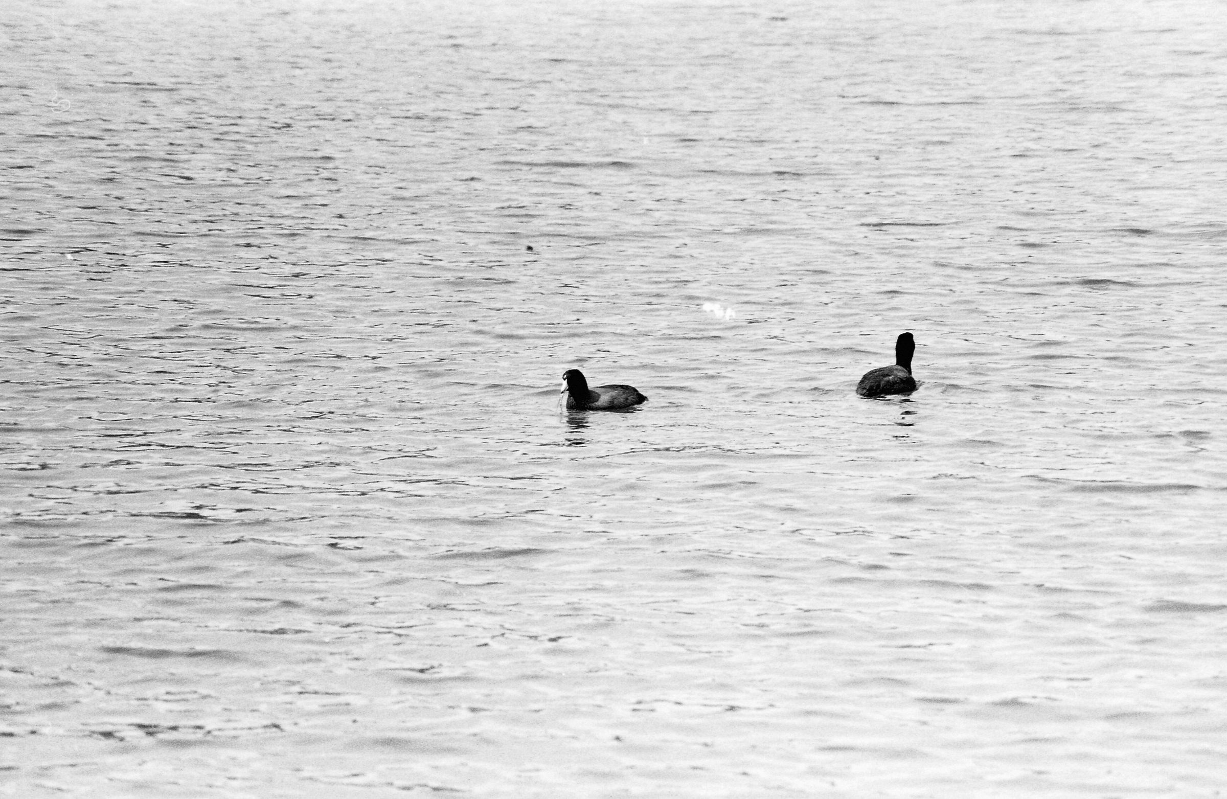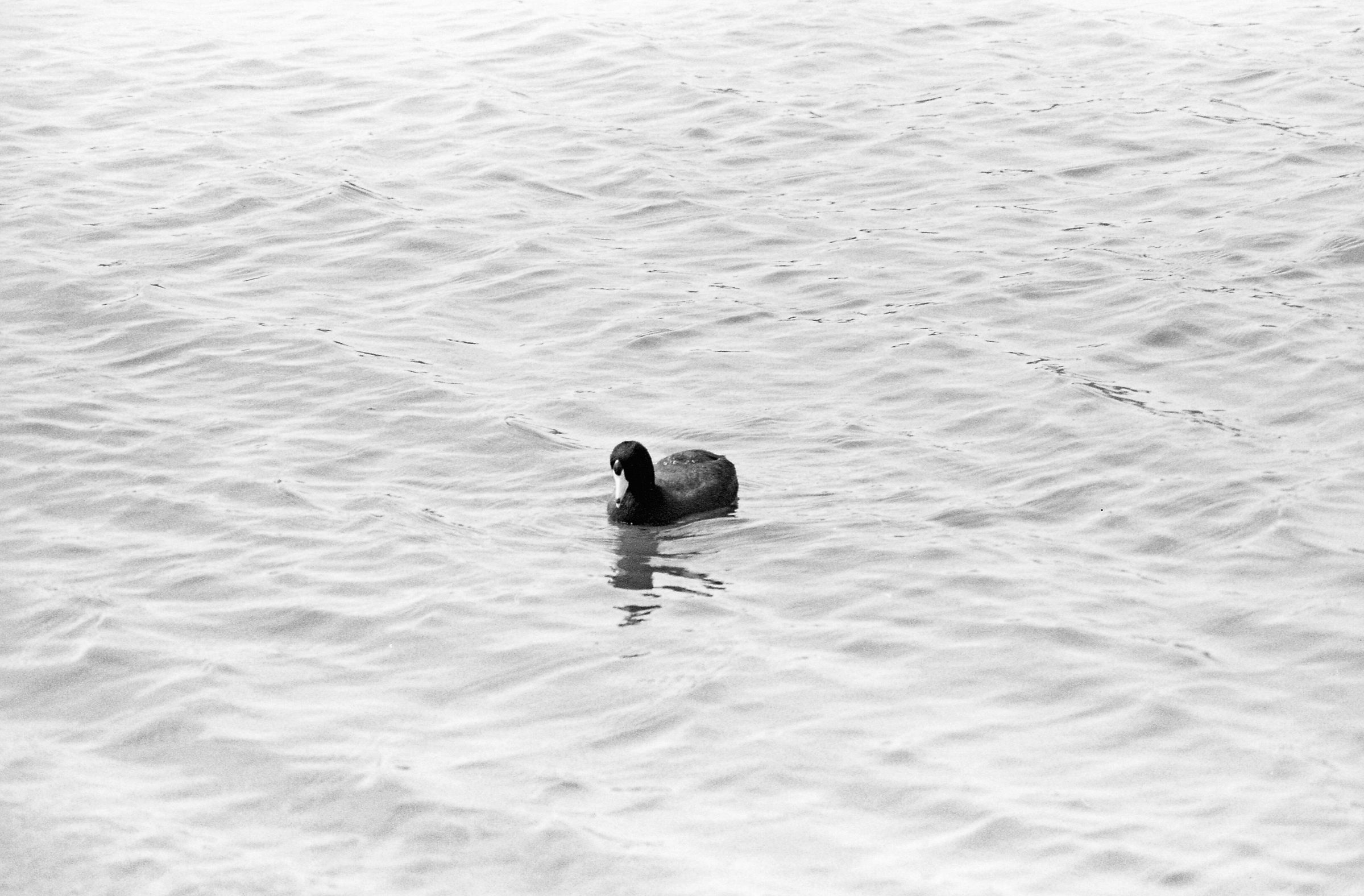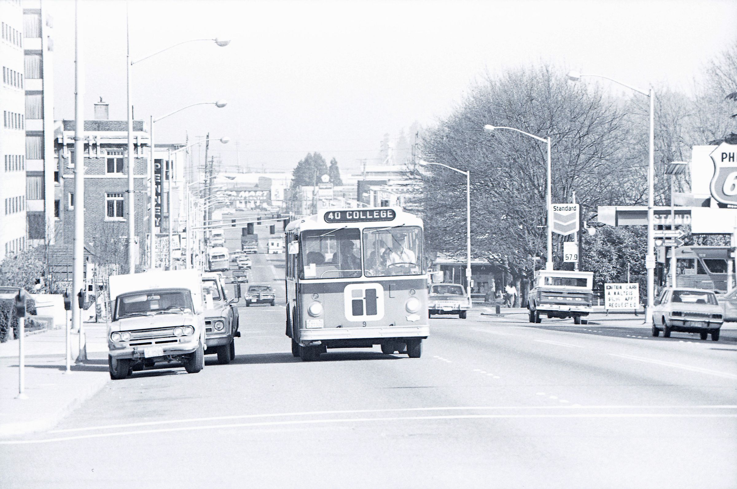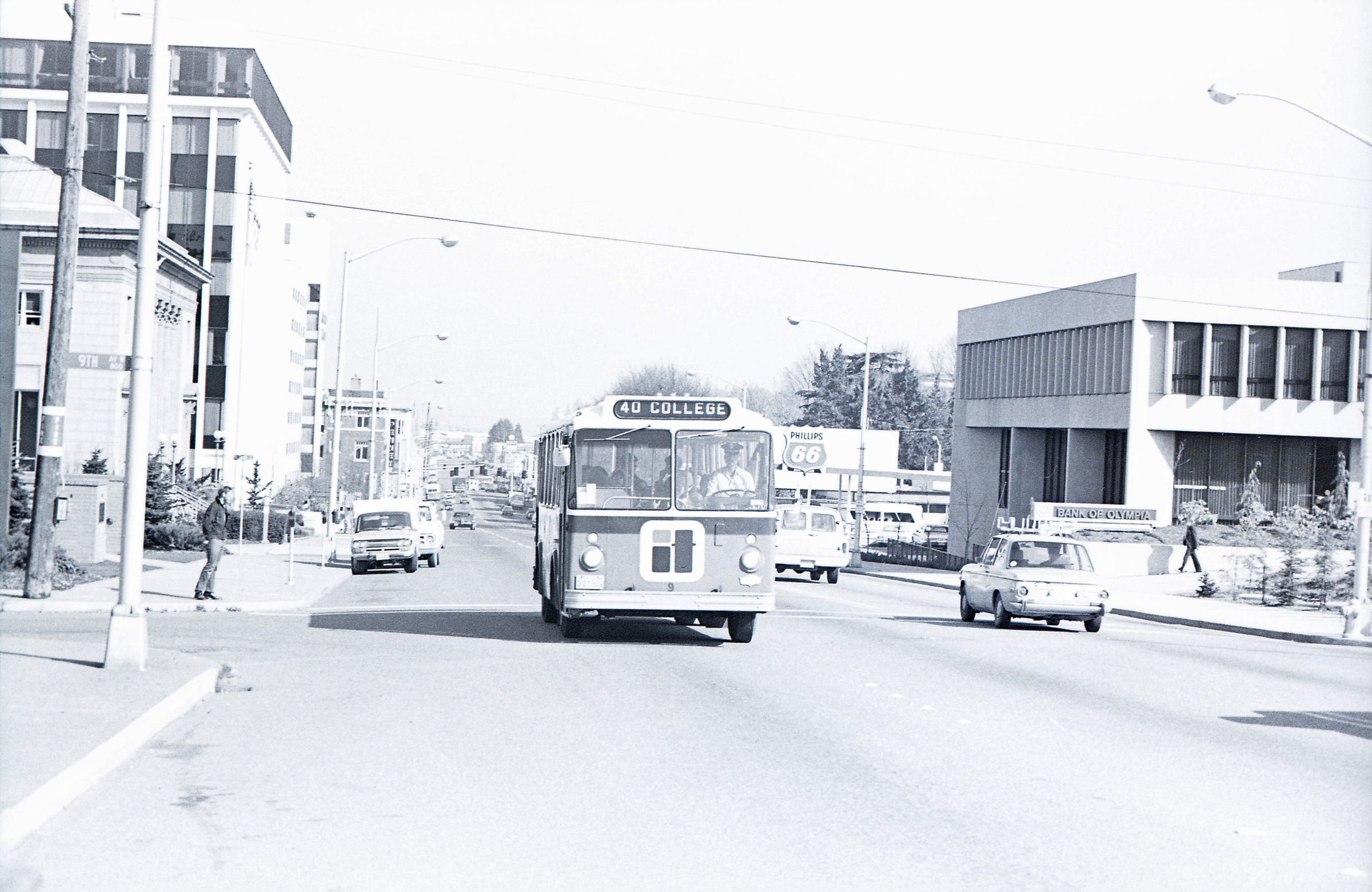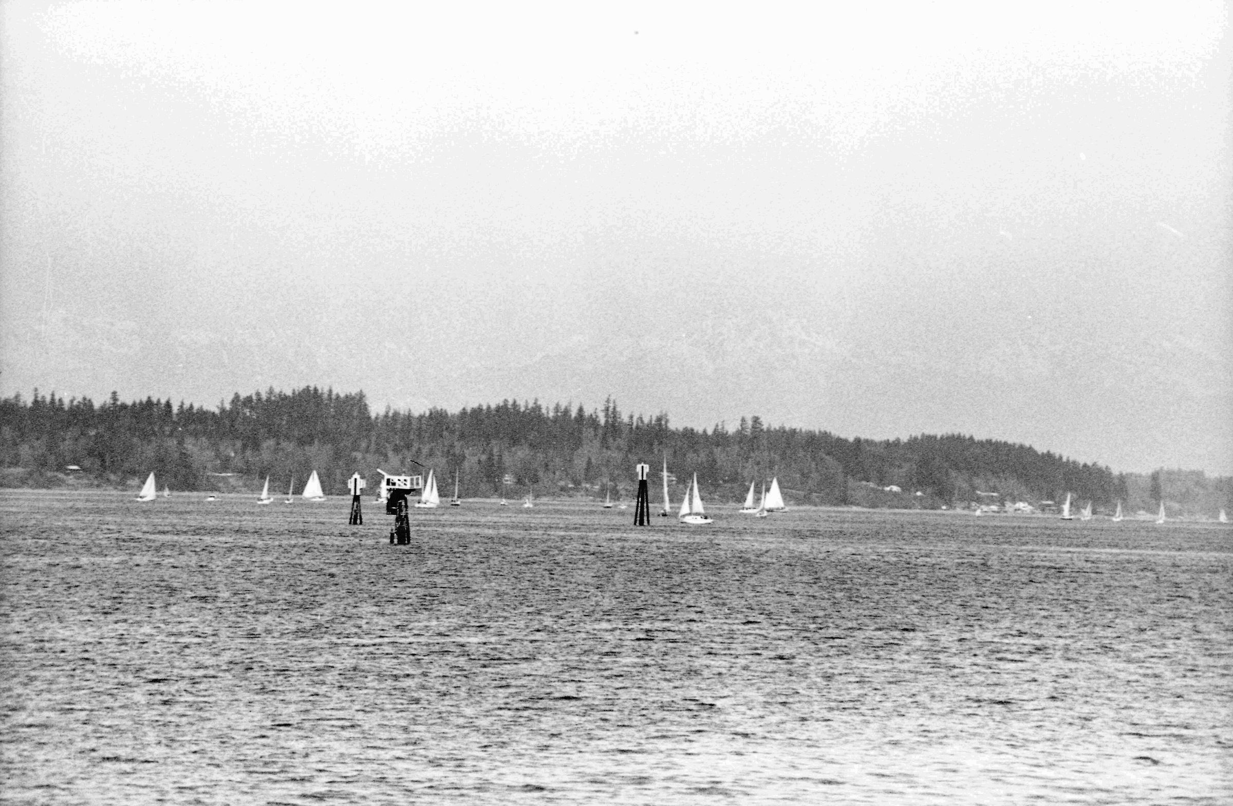 Intercity Transit Bus, 1976. This single black and white film negative strip was created for the Lacey Leader newspaper. These images show ducks swimming, sailboats on the water, and a bus driving through a city. Image 9 shows a single duck swimming. Image 10 shows two ducks swimming. Image 11 shows approximately ten sailboats out on a body of water. Image 12 shows a bus driving down a city street. A sign on the front of the bus reads "40 COLLEGE." Image 13 is similar to image 12, but here the bus has progressed farther down the street.