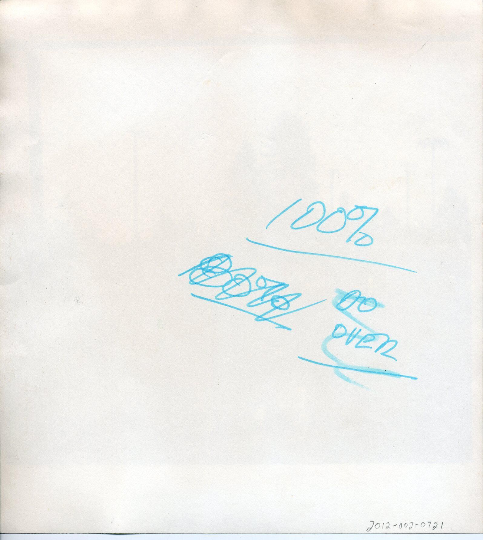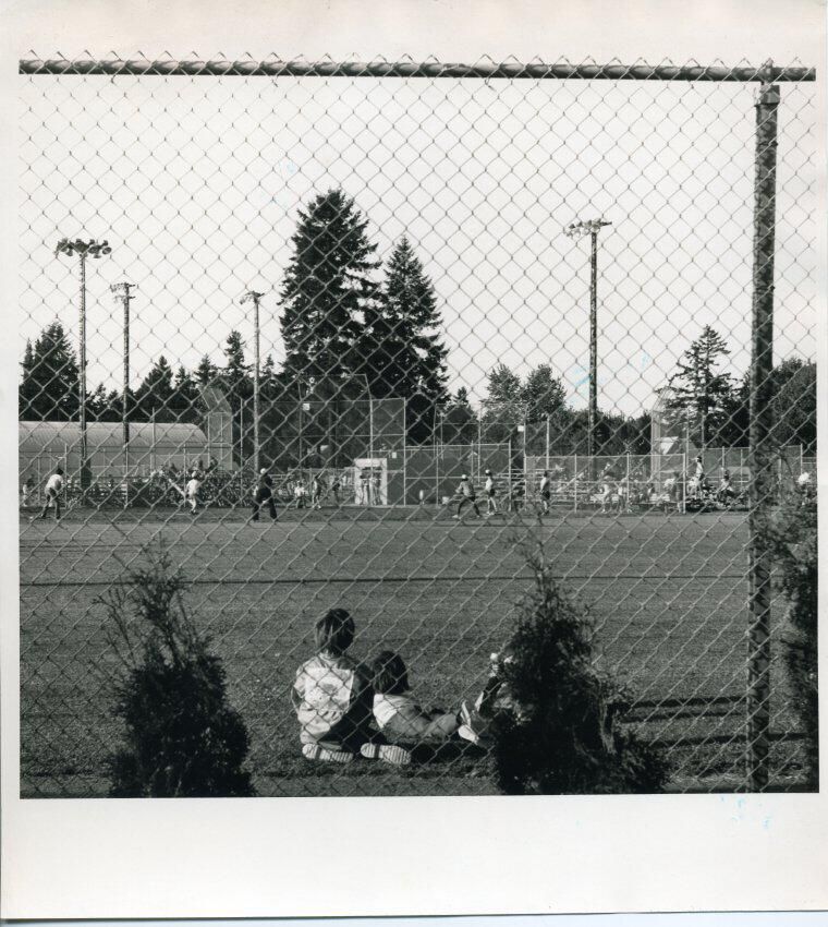 Black and white photo of people at a baseball field. The image is seen through a chain-link fence. In the foreground are some evergreen shrubs and two children sitting and lying on the field watching the action. On the other side of the field are players and umpires in the midst of a game. There are light poles and more fences at the far side of the field. In the background are trees and buildings as well as spectators on bleachers. There is a white border on all sides with the top and bottom borders being larger. On the back in green ink are several items crossed out and "100%".