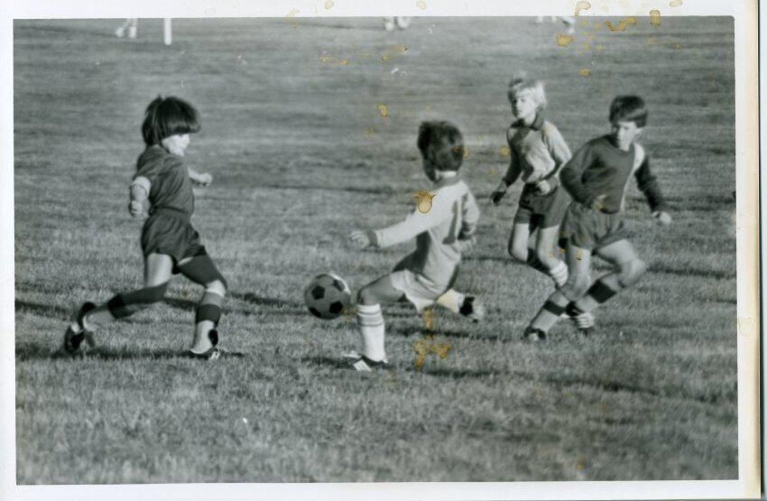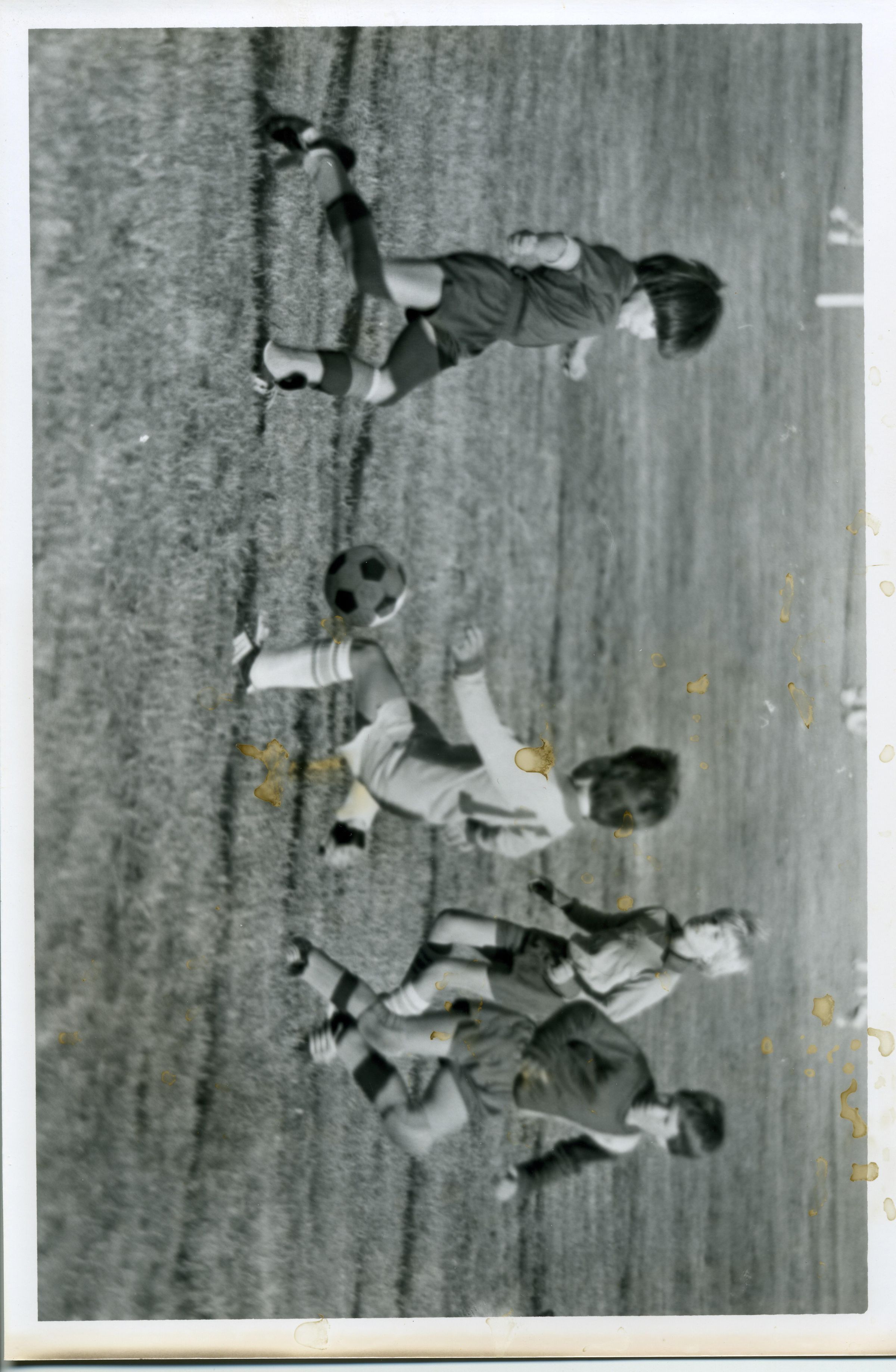 Black and white photo of boys playing soccer. There are four boys running with a soccer ball between them. One boy has blond hair and the others have dark hair. All have on polo shirts, shorts, and knee length stockings. On one shirt is what appears to be the number "13". The rest of the image is a grass field with parts of some posts visible. There is a white border on all sides. There is no information on the back.Made/Created