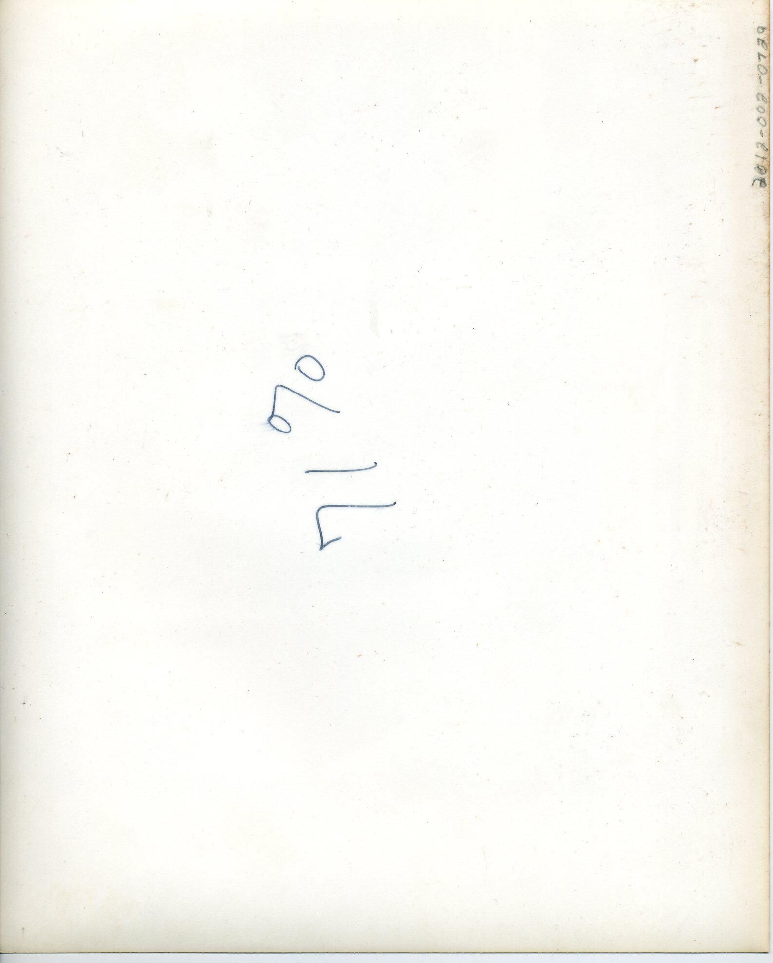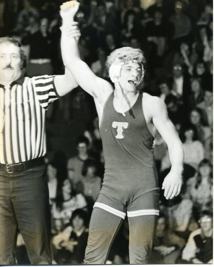 Black and white photo of two individuals at a wrestling meet. On the left is a man with medium length dark hair and a mustache He is wearing a striped shirt and dark trousers. He is holding up the hand of the boy on the right who has light colored hair. He is wearing an ear protector on his head and a black wrestling top with "T" on it. He has on dark leg wear. In the background is a blurred image of numerous persons in an audience location. There is no border. On the back in ink is "71%".
