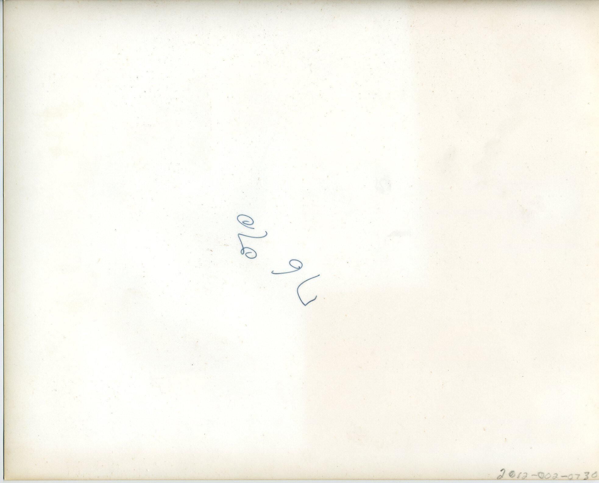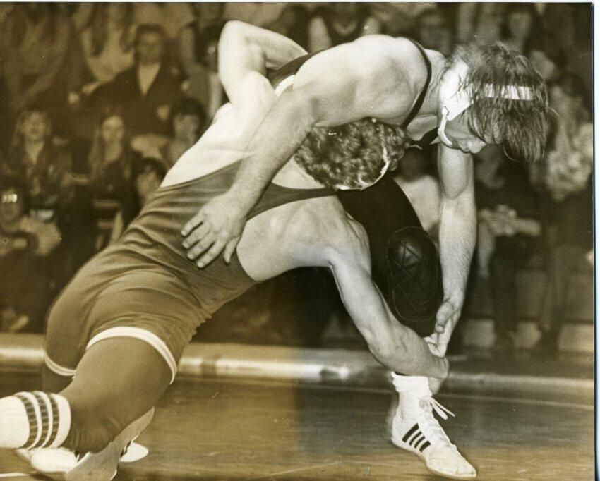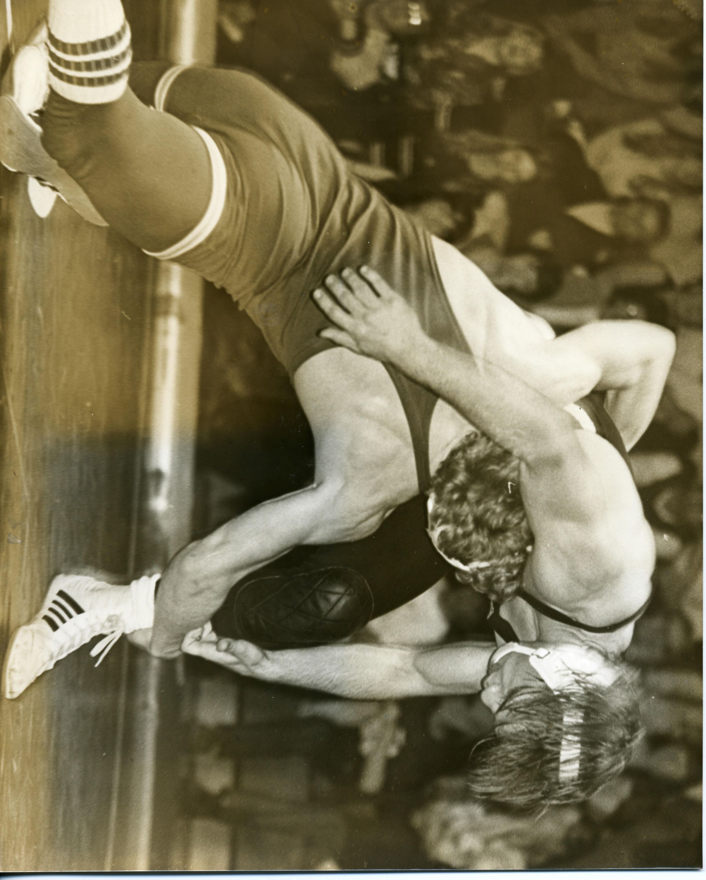 Black and white photo of two individuals wrestling. Both have dark hair and are wearing ear protectors on their heads. On the left, the wrestler has his back to the camera and is below the other wrestler. He has on a black wrestling top and leg wear and white stockings. The other wrestler also has a black top and leg wear as well as knee pads. In the background is a blurred image of an audience. There is no border. On the back in ink is "76%".