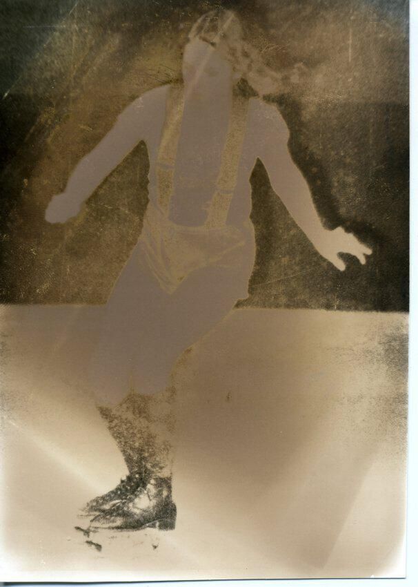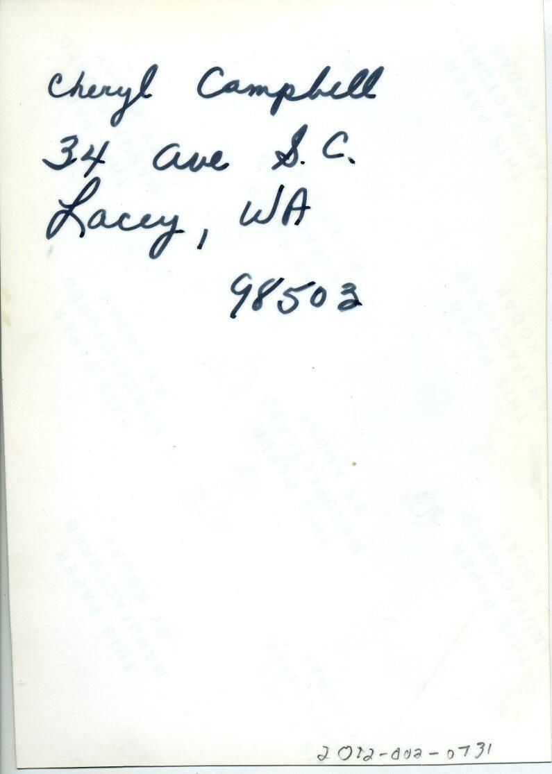 Black and white photo of a a girl on skates. She has long hair but the color is unknown. It cannot be determined what clothes she is wearing, but black shoe skates are visible. It might be that she is on ice with a darker background. There is no border. On the back in ink is "Cheryl Campbell 34 Ave S. C. Lacey, WA 98503".Made/Created