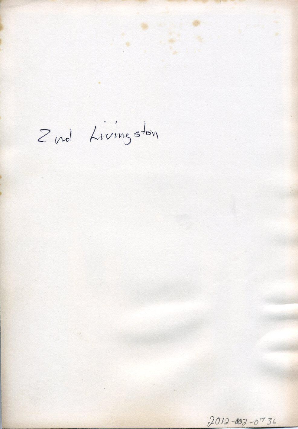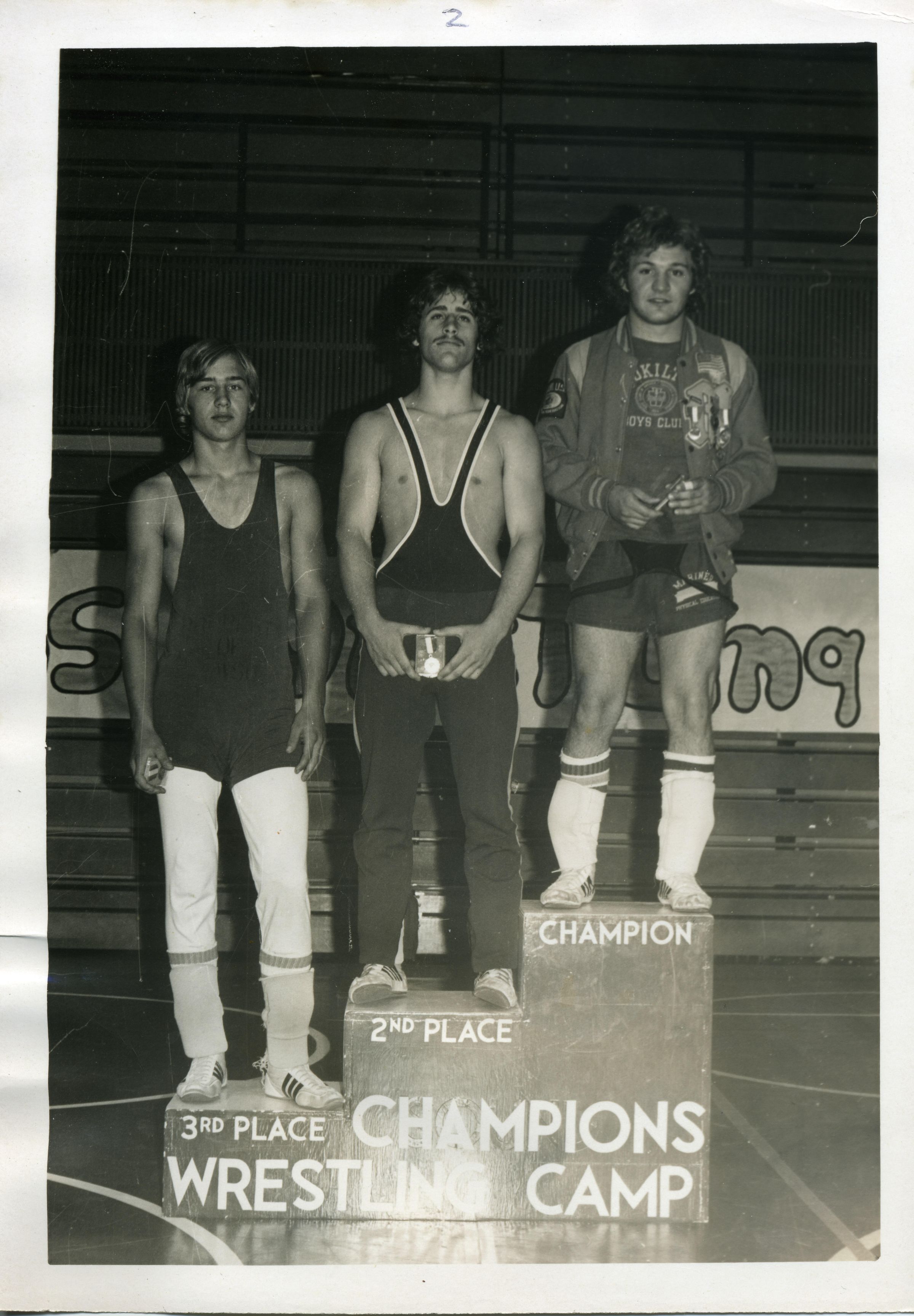 Black and white photo of three individuals in wrestling garments. They are standing on a wooden platform with three levels with the phrases "3rd place", "2nd place", and "Champion" below the various levels, and also says "Champions Wrestling Camp". The man on the left has dark hair and is wearing a dark garment with shoulder straps. He has on white sweat pants and long stockings. In the center the man has dark hair and is wearing a wrestling garment with straps over his shoulders. He is holding a small trophy. On the right the man has dark hair and is wearing a jacket over a dark tee with writing and a logo on it. He has on shorts and long stockings. In the background are folded bleachers. There is a white border on all sides. On the back in ink is "2nd Livingston".Made/Created