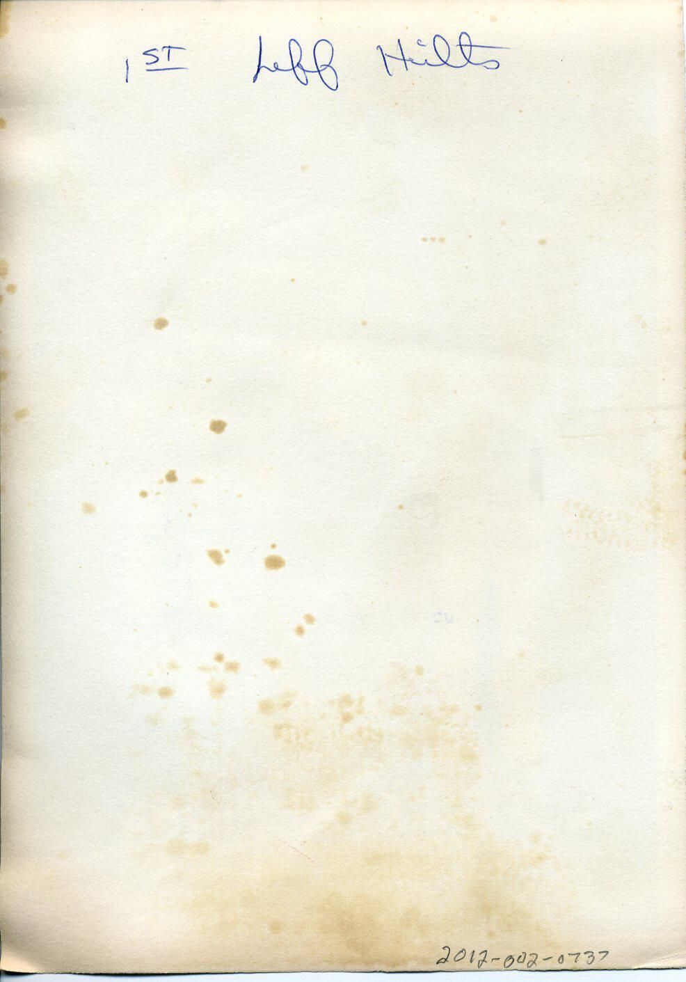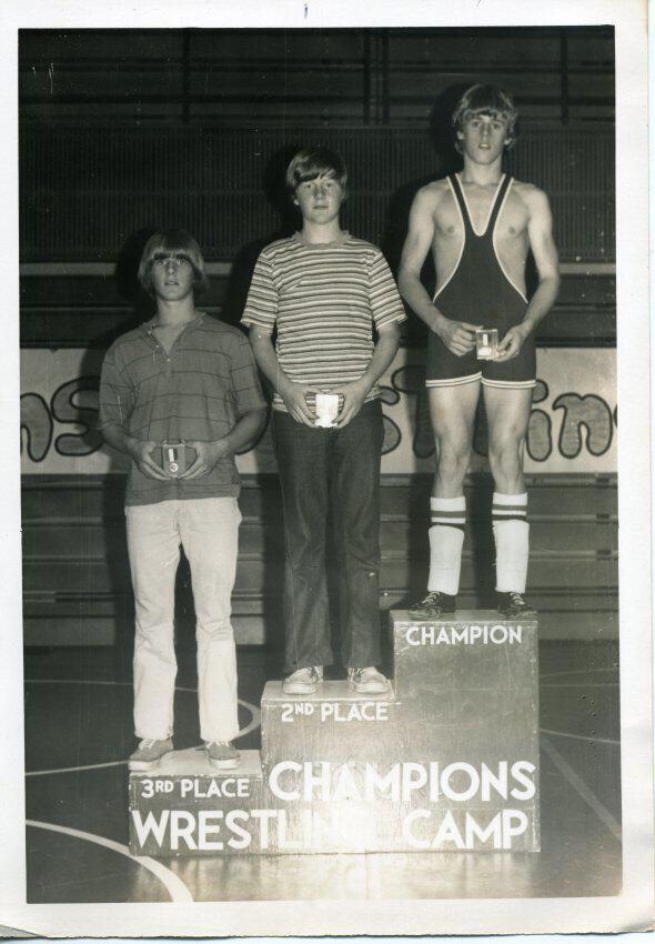 Black and white photo of three individuals in wrestling garments. They are standing on a wooden platform with three levels with the phrases "3rd place", "2nd place", and "Champion" below the various levels, and also says "Champions Wrestling Camp". The man on the left has long brown hair and is wearing a tan, open collared shirt and white trousers. In the center the man has dark hair and is wearing a striped polo shirt and dark trousers. On the right the man has dark hair and is wearing a garment with straps over his shoulders. He has long stockings. Each man is holding a small trophy. In the background are folded bleachers. There is a white border on all sides. On the back in ink is "1st Jeff Hilts".Made/Created