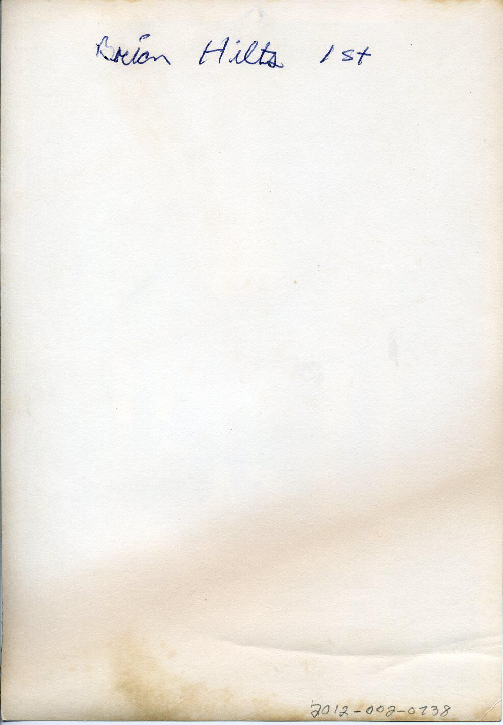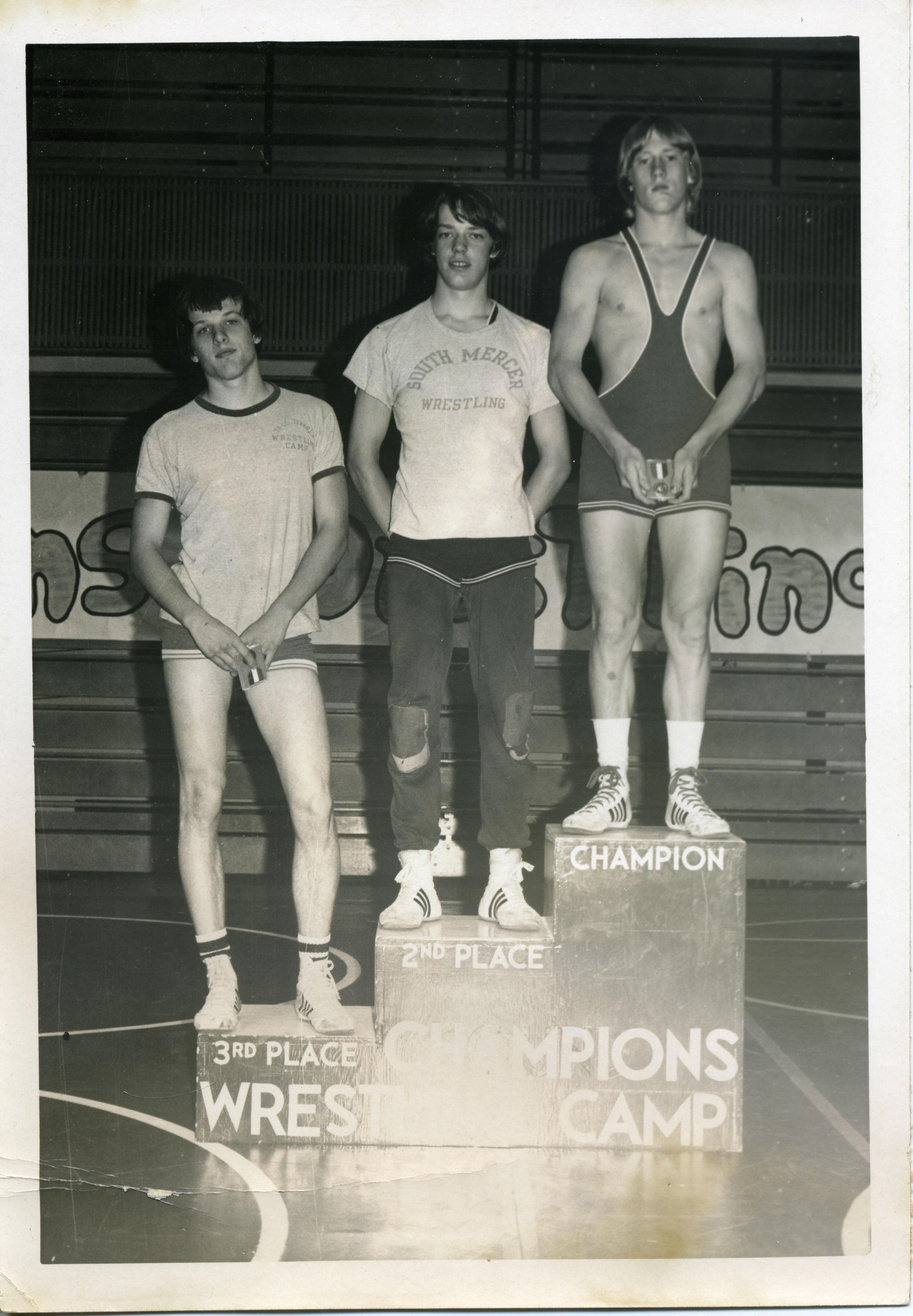 Black and white photo of three individuals in wrestling garments. They are standing on a wooden platform with three levels with the phrases "3rd place", "2nd place", and "Champion" below the various levels, and also says "Champions Wrestling Camp". The man on the left has dark hair and is wearing a white tee and shorts. In the center the man has dark hair and is wearing a tee on which is written "South Mercer wrestling". He has dark sweat pants with knee pads. On the right the man has dark hair and is wearing a wrestling garment with shoulder straps. The men on the left and right are both holding a small trophy. In the background are folded bleachers. There is a white border on all sides. On the back in ink is "Brian Hilts 1st".Made/Created