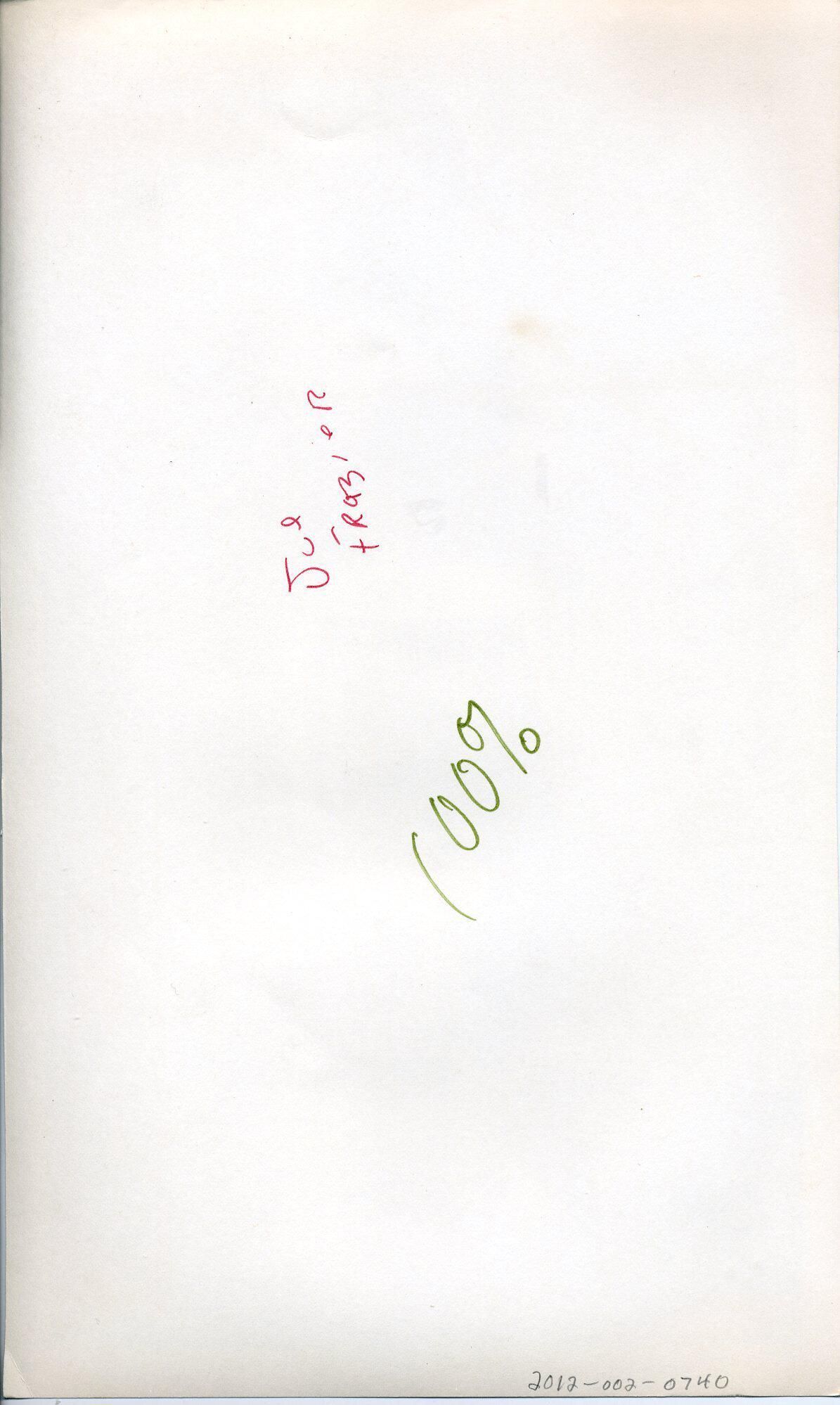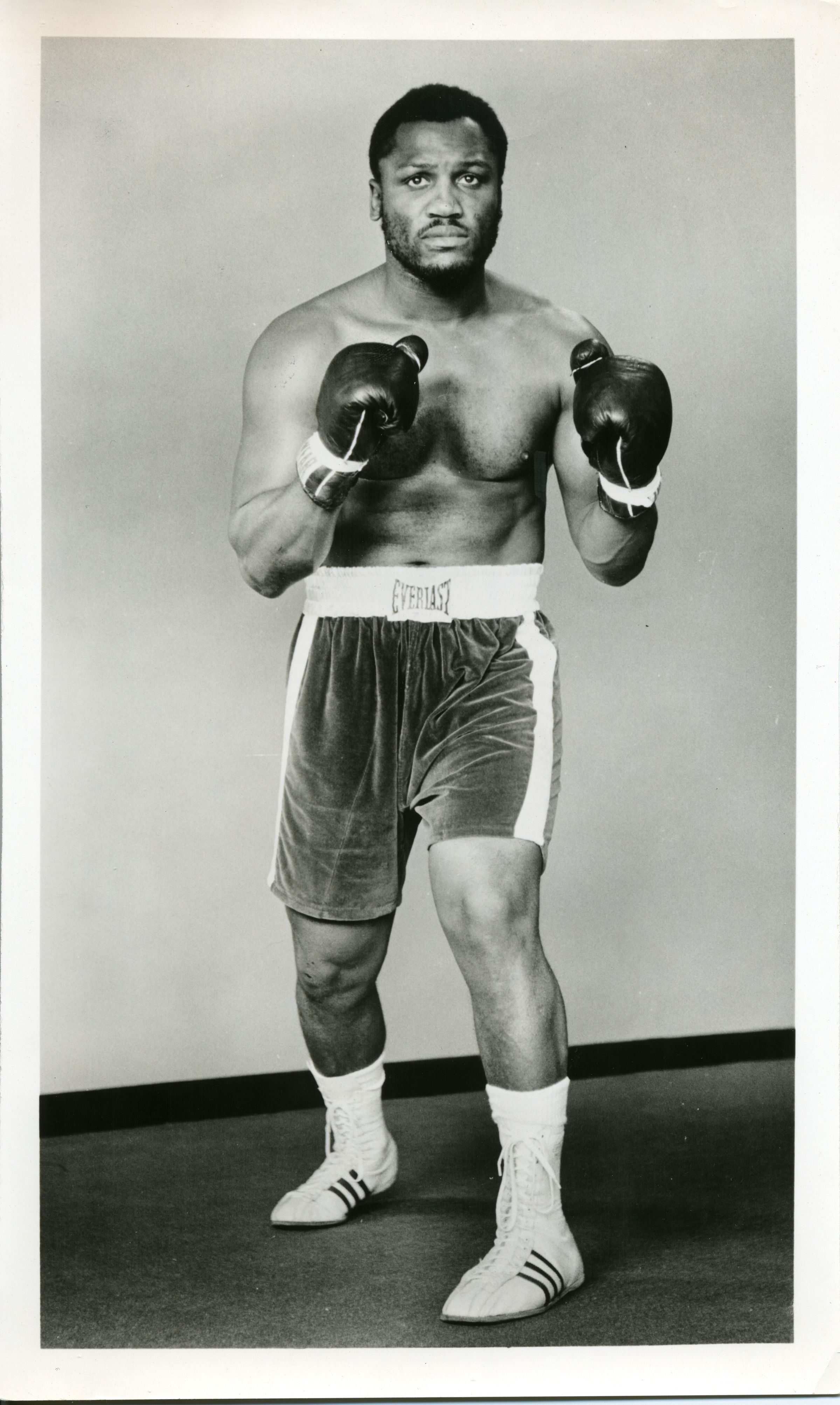 Black and white photo of Joe Frazier. He has dark hair and is wearing boxing trunks with a belt that says "Everlast". He has on boxing gloves and has his arms in a defensive position. There is a white border on all sides. On the back in red ink is "Joe Frazier" and in green ink is "100%".