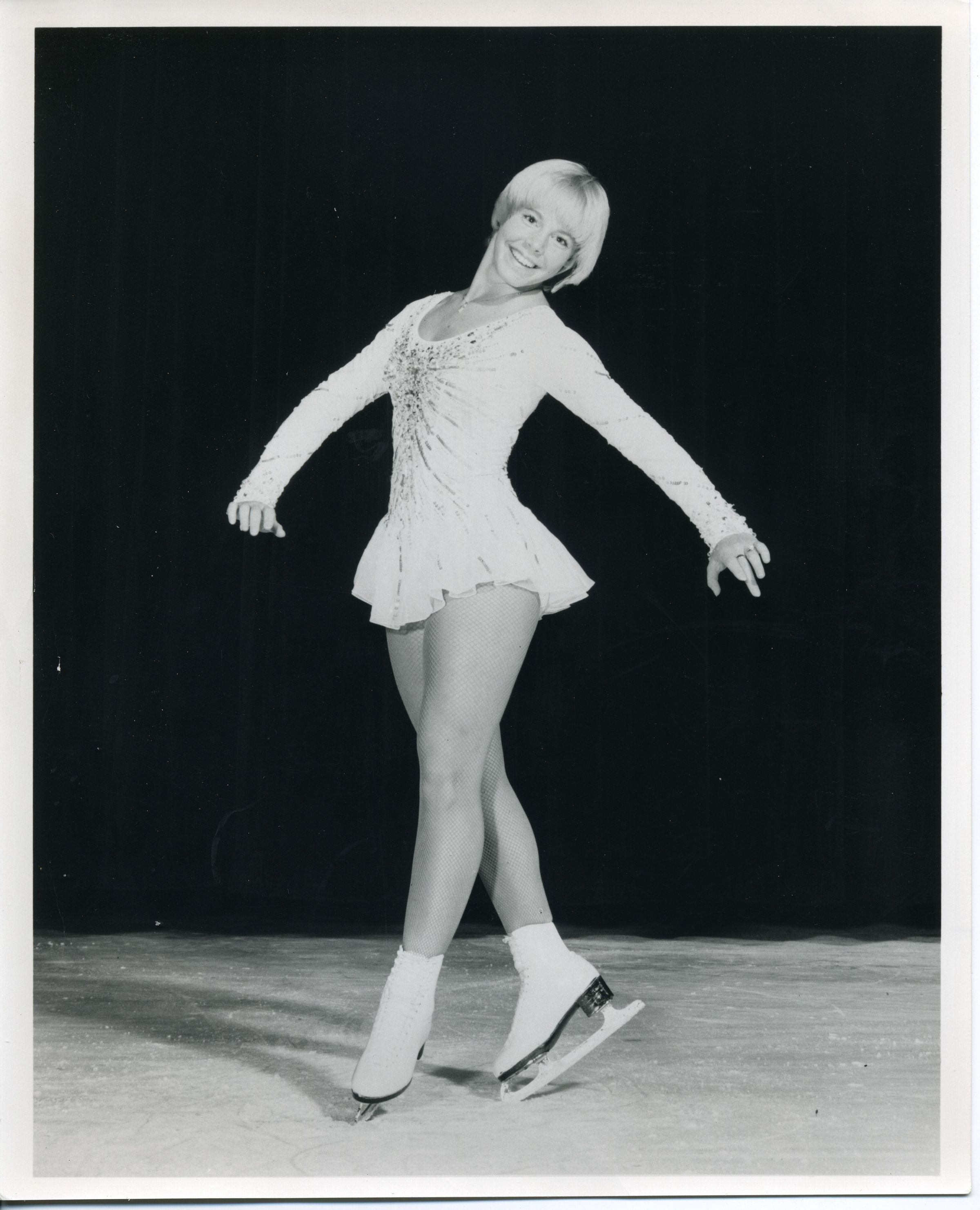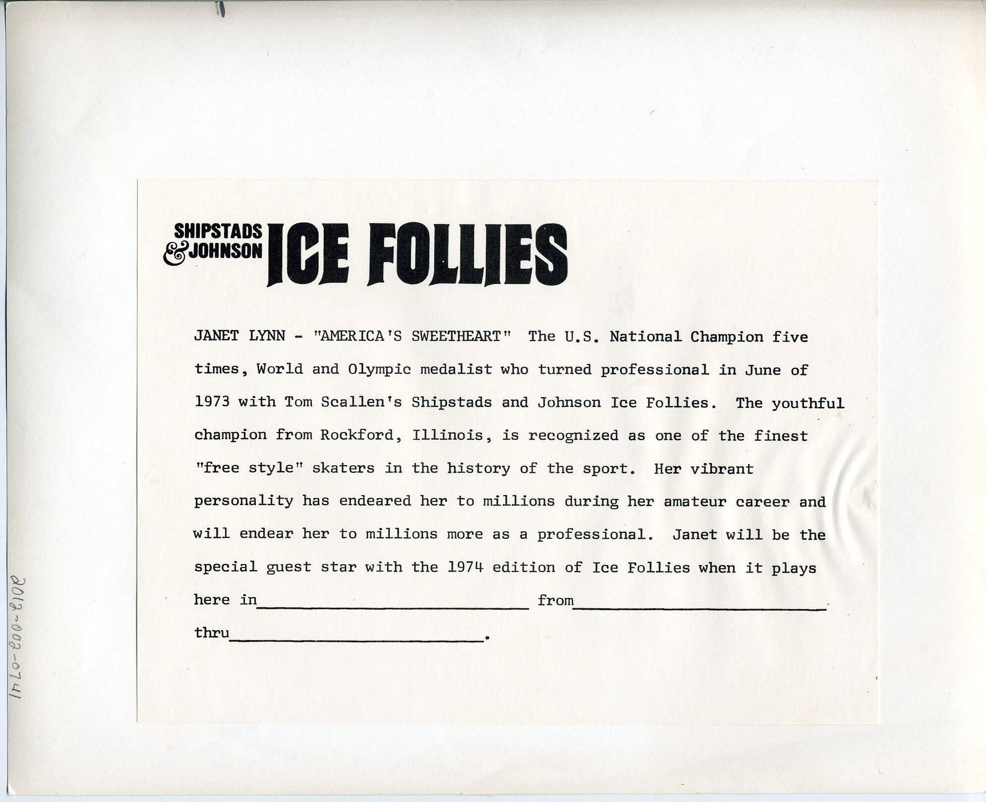 Black and white photo of Janet Lynn. She has blond hair and is wearing a short skater's outfit and ice skates. She is holding a presentation pose. The background is black. There is a white border on all sides. On the back on a pasted-on paper is "Shipstads and Johnson Ice Follies Janet Lynn - 'America's Sweetheart' The U.S. National Champion five times, World and Olympic medalist who turned professional in June of 1973 with Tom Scallen's Shipstads and Johnson Ice Follies. The youthful champion from Rockford, Illinois, is recognized as one of the finest 'free style' skaters in the history of the sport. Her vibrant personality has endeared her to millions during her amateur career and will endear her to millions more as a professional. Janet will be the special guest star with the 1974 edition of Ice Follies when it plays here in ___ from ___thru___."Made/Created