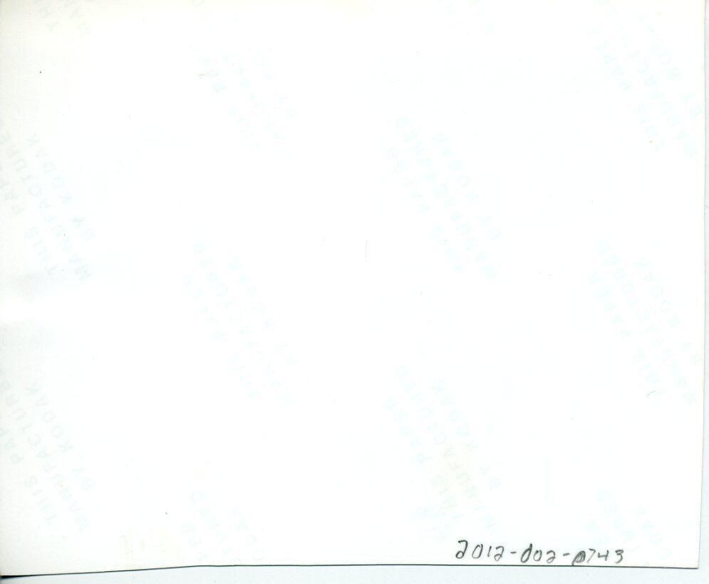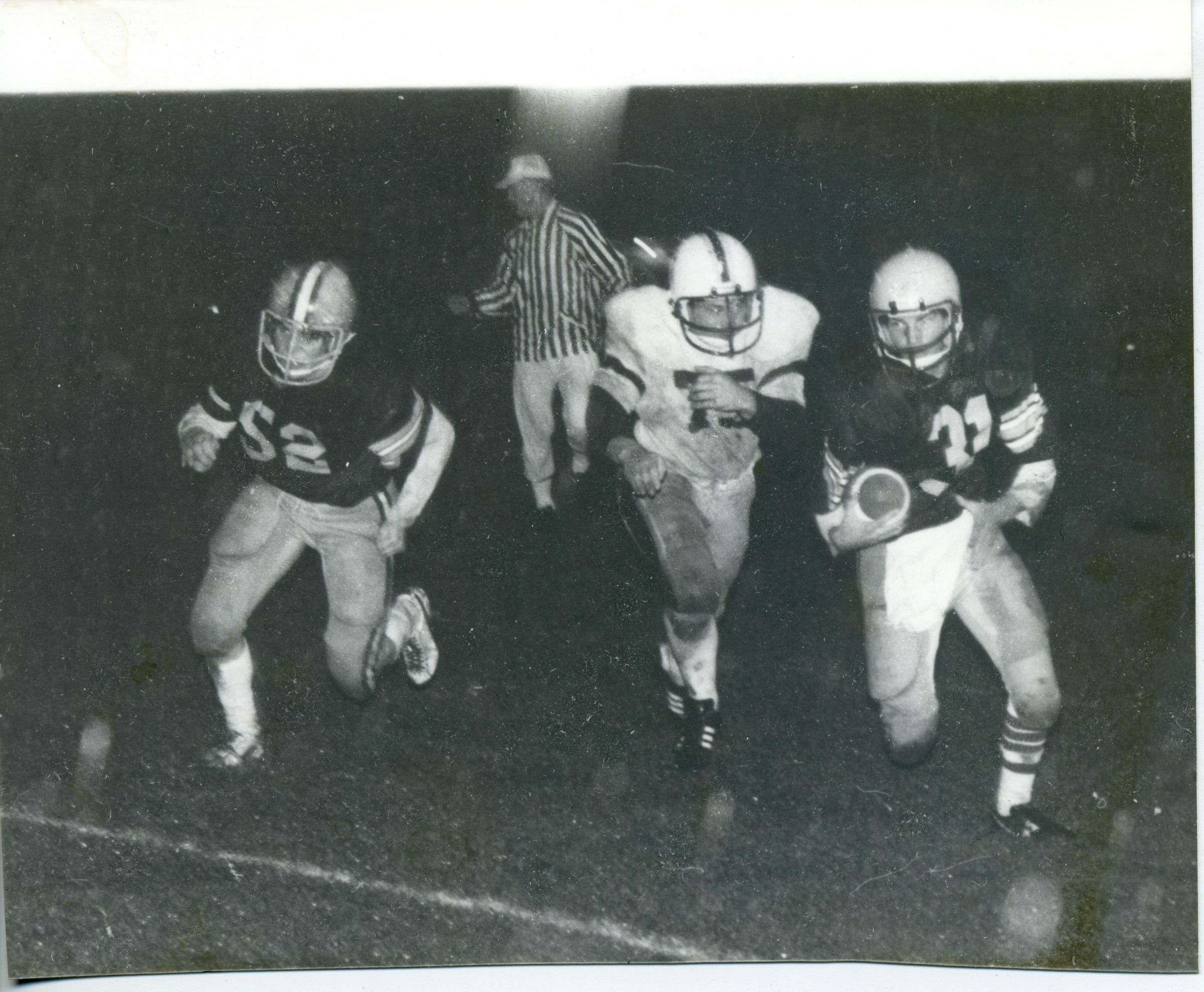 Black and white photo of three boys in football gear and one man in the background dressed as a referee. All are facing the camera. The boys on the left and right have white helmets and pants with black jerseys. The boy on the right is carrying a football. In the center is a boy with a white helmet and white jersey who seems to be chasing the boy with the football. The jerseys have numbers, it appearing that the boy on the left has number 52, the center boy 75, and the boy on the right 31. There is a white line on the ground in the lower left corner of the print. There is a white border at the top only. There is no information on the back except for a very faint repeated statement that says "This paper manufactured by Kodak".Made/Created