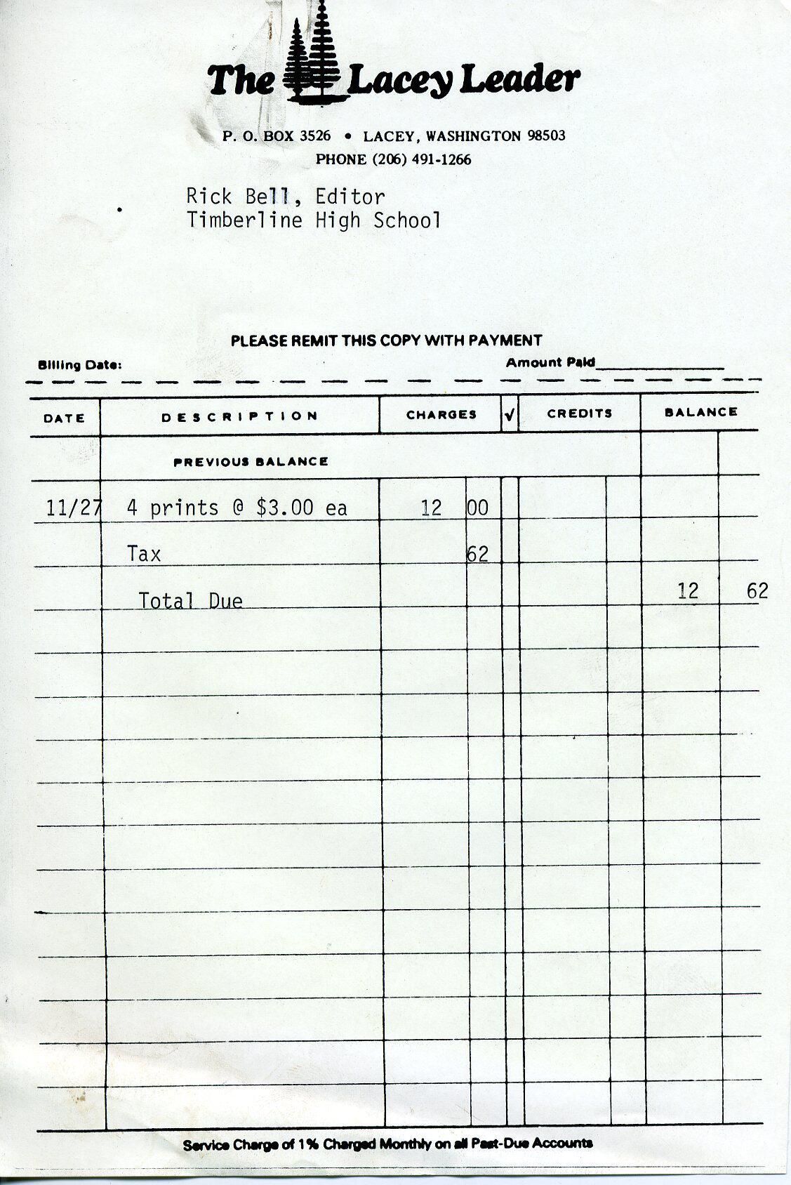 Paper invoice with the heading "The Lacey Leader P.O. Box 3526 Lacey, Washington 98503 Phone (206) 491-1266 Please remit this copy with payment". There are printed rows and columns with the headings " Billing date Amount paid ____ Date Description Charges Credits Balance". Typed on the paper is "11/27 4 prints @ $3.00 ea 12.00 Tax .62 Total Due 12.62". At the bottom is printed "Service Charge of 1% charged monthly on all past due accounts". There is no information on the back.