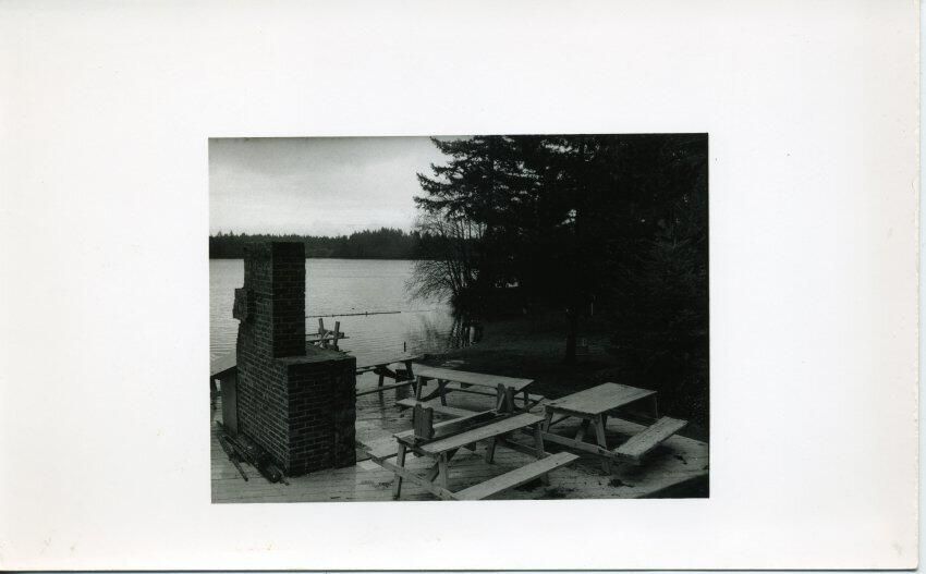 Black and white photo of a picnic area at Long Lake. In the foreground are tables, benches, and a brick fireplace for cooking. All are on a cement platform and various tools are lying near the fireplace. There are trees to the right and water in the center with the far shore visible in the background. There is a white border on all sides. On the back in blue ink is "Long Lake" and in pencil "4 [in a circle] poly f 5.6/15 sec ? water 10 sec". Also in pencil is "15".Made/Created