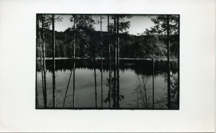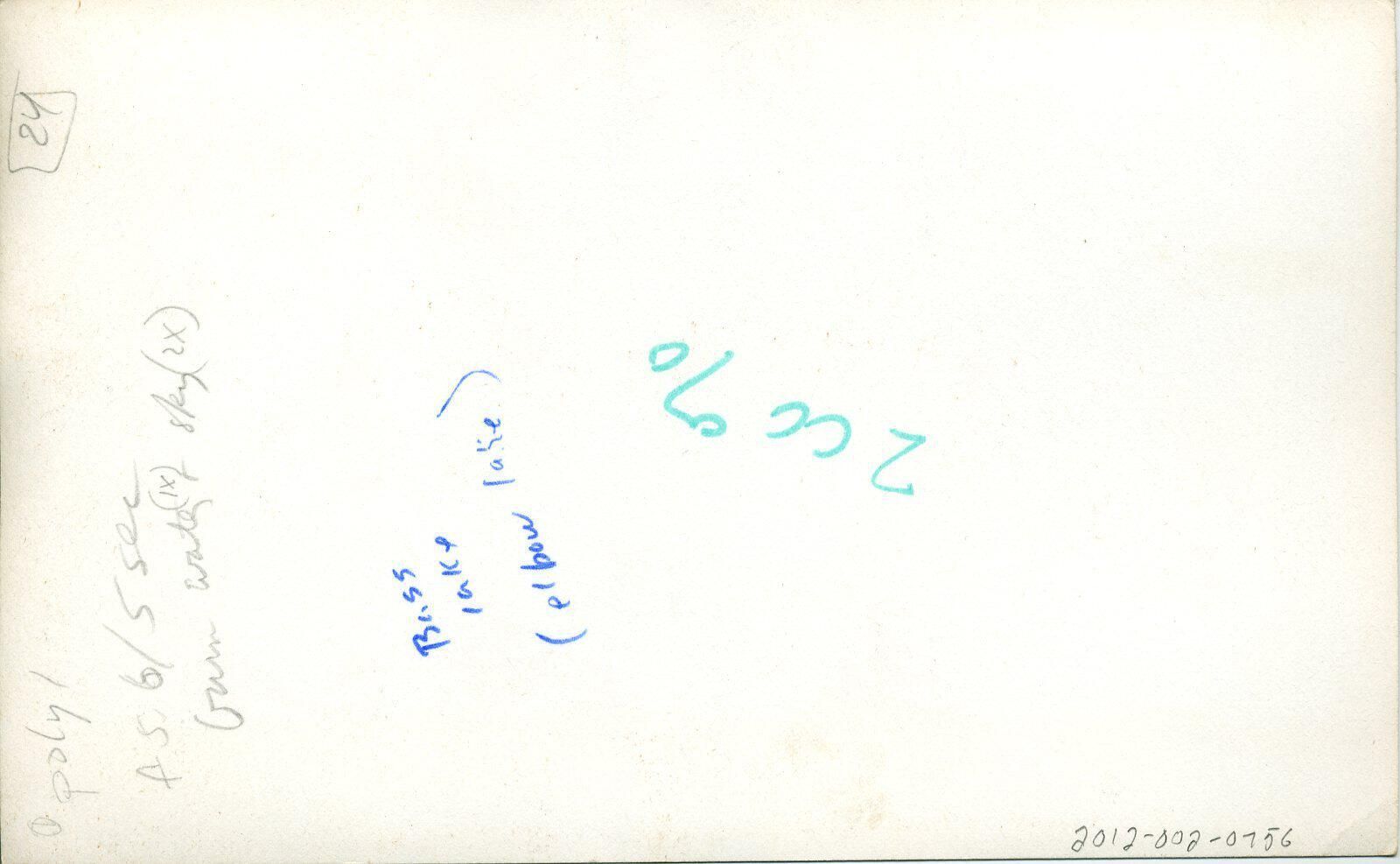 Black and white photo of Bass (Elbow) Lake. The camera is looking past thin trunks of Fir trees at a body of water that reflects the far shore that is covered with trees. There is a white border on all sides. On the back in green ink is "200%" and in blue ink is "Bass Lake (Elbow Lake)". In pencil is "24" in a circle, and "poly f 6/5 sec ? water (IX) 8 ? (2X".