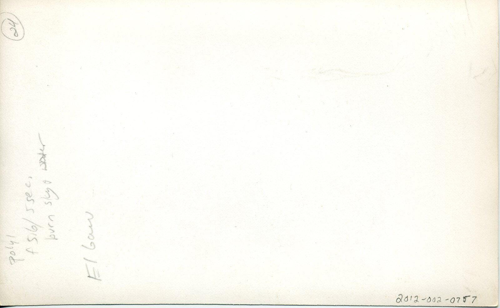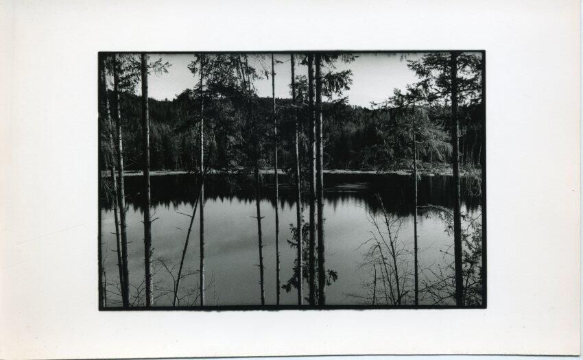 Black and white photo of Bass (Elbow) Lake. The camera is looking past thin trunks of Fir trees at a body of water that reflects the far shore that is covered with trees. There is a white border on all sides. On the back in pencil is "24" in a circle, and "poly f 5.6/5 sec ? sky & water Elbow".Made/Created