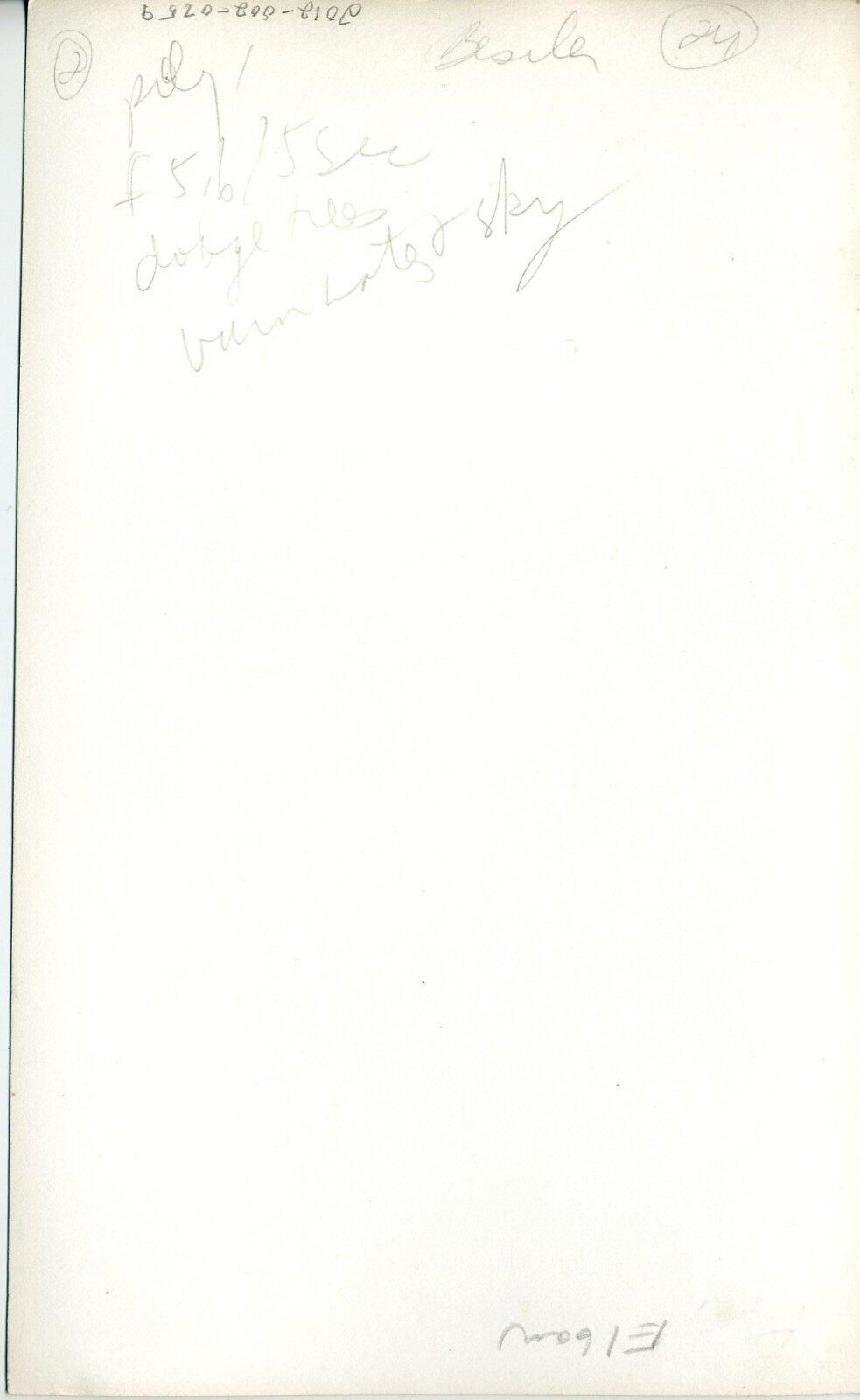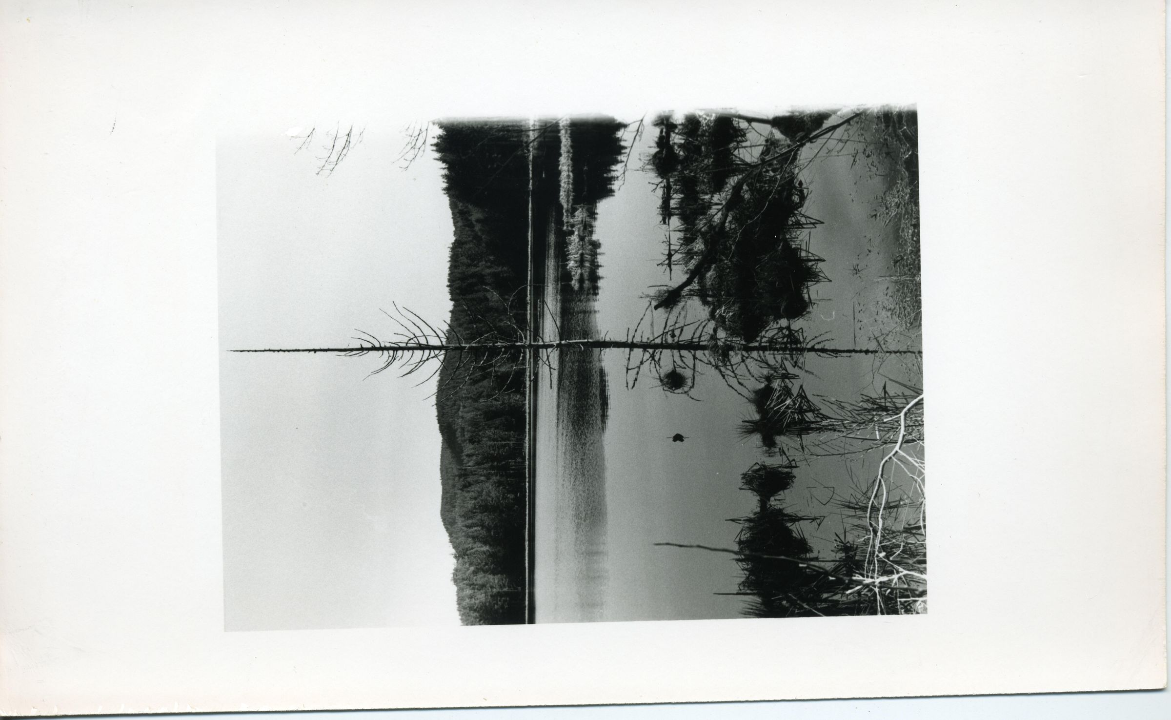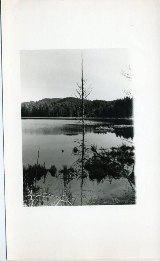 Black and white photo of Elbow Lake. In the foreground is a tall, thin tree trunk that extends from the bottom to the top of the image. Also in the foreground are other tree branches Beyond them is water with some shore features visible. In the background is the far shore with a road or railroad at the base of a bluff that is covered with trees. There is a white border on all sides. On the back in pencil is "Elbow", and a "2" and "24" in circles, and "poly Besile f 5.6/5 sec dodge trees? water & sky".Made/Created