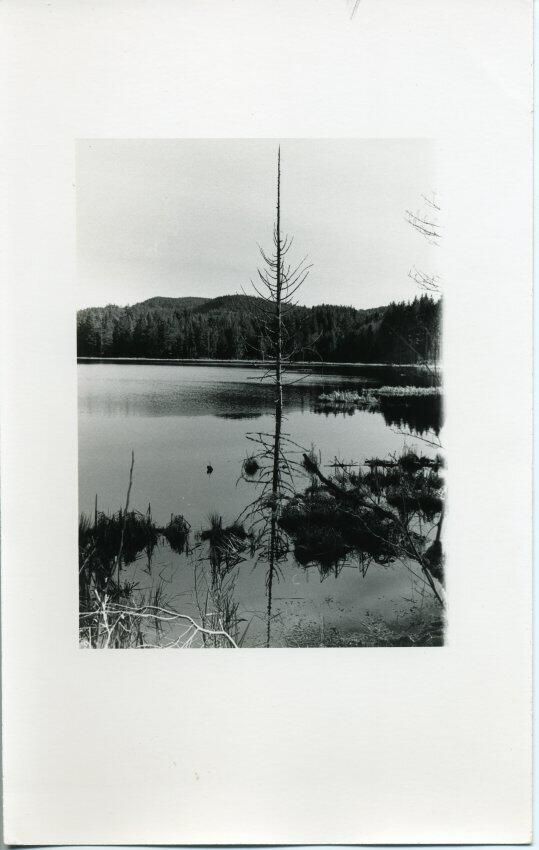 Black and white photo of Elbow Lake. In the foreground is a tall, thin tree trunk that extends from the bottom to the top of the image. Also in the foreground are other tree branches Beyond them is water with some shore features visible. In the background is the far shore with a road or railroad at the base of a bluff that is covered with trees. There is a white border on all sides. On the back in pencil is a "2" and "24" in circles, and "poly Besile f 5.6/5 sec dodge trees? water & sky". In green felt pen is "178%" crossed out , and "100%". In blue ink is "Elbow Lake".