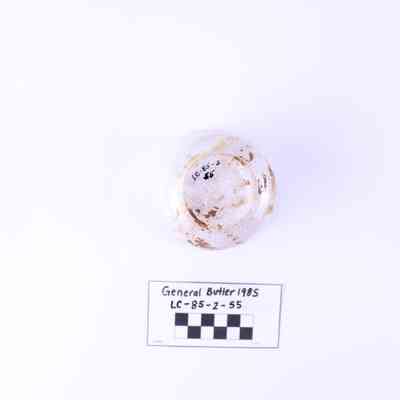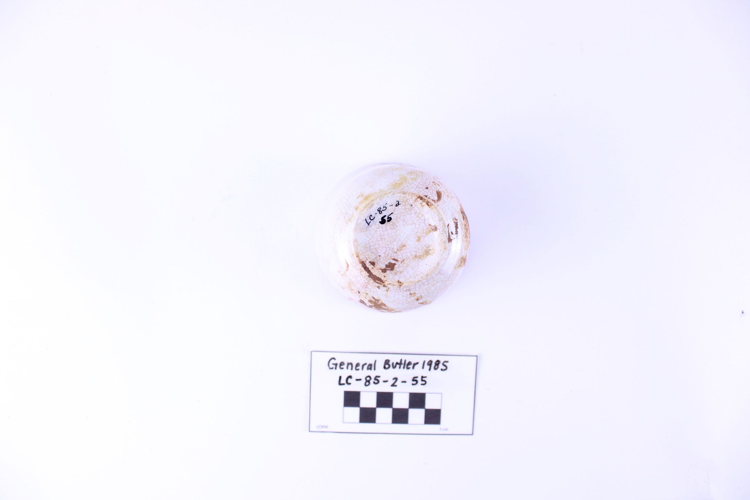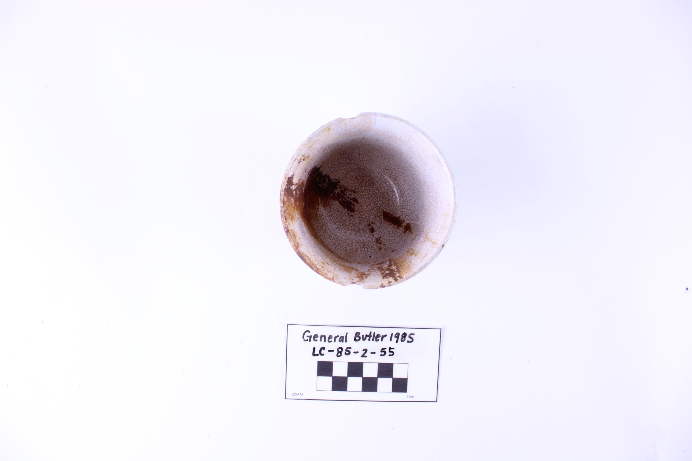 Artifact LC-85-2-55 is one (1) white ceramic handleless cup.There are streaks of red discoloration on the inside and outside of the cup. There is a large crack across the middle of the cup. Several chips line the edge of the rim. There are many small cracks within the white glaze. There is no visible maker's mark.