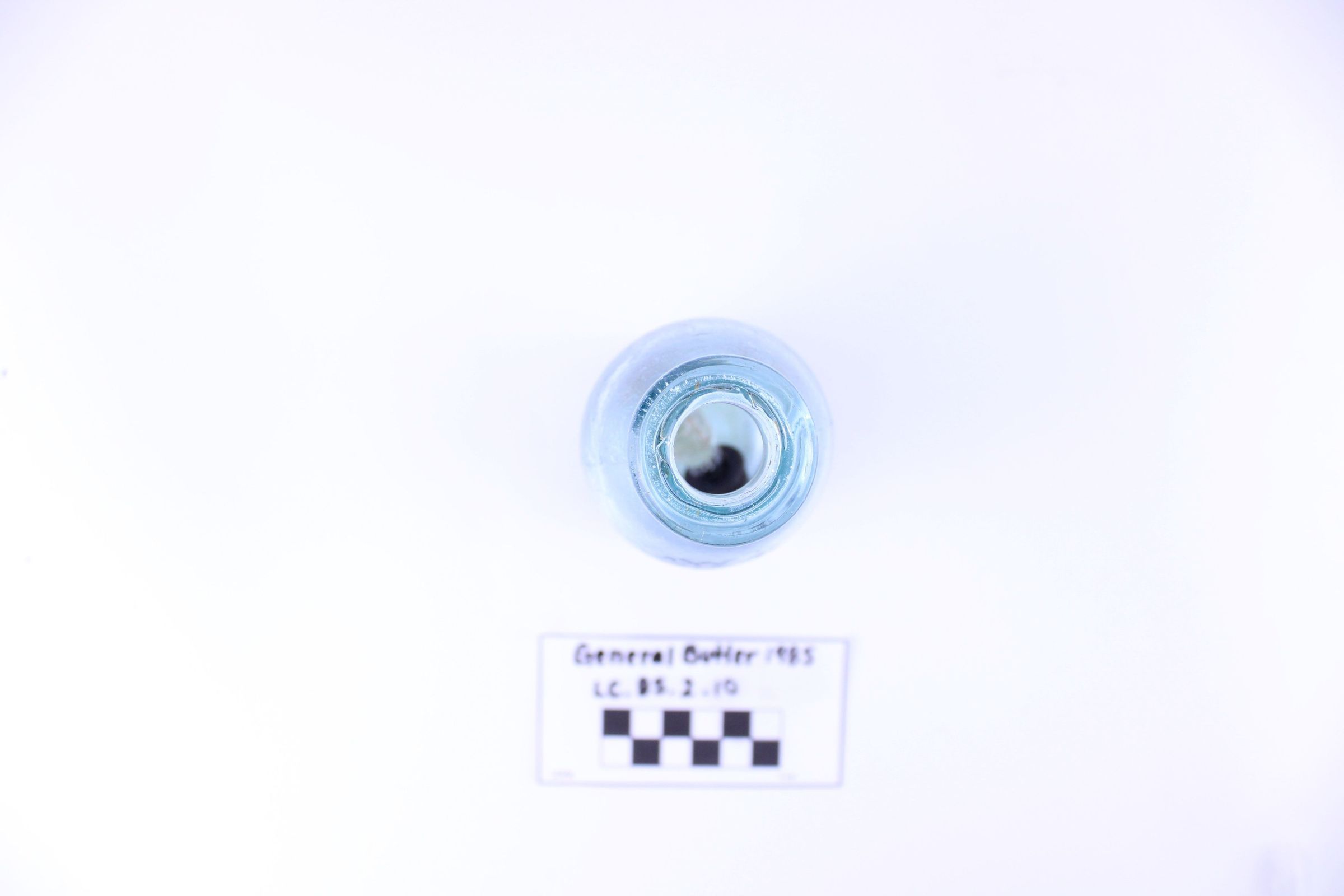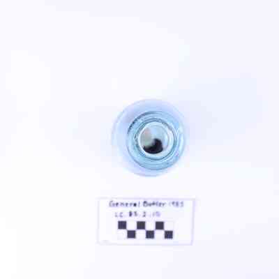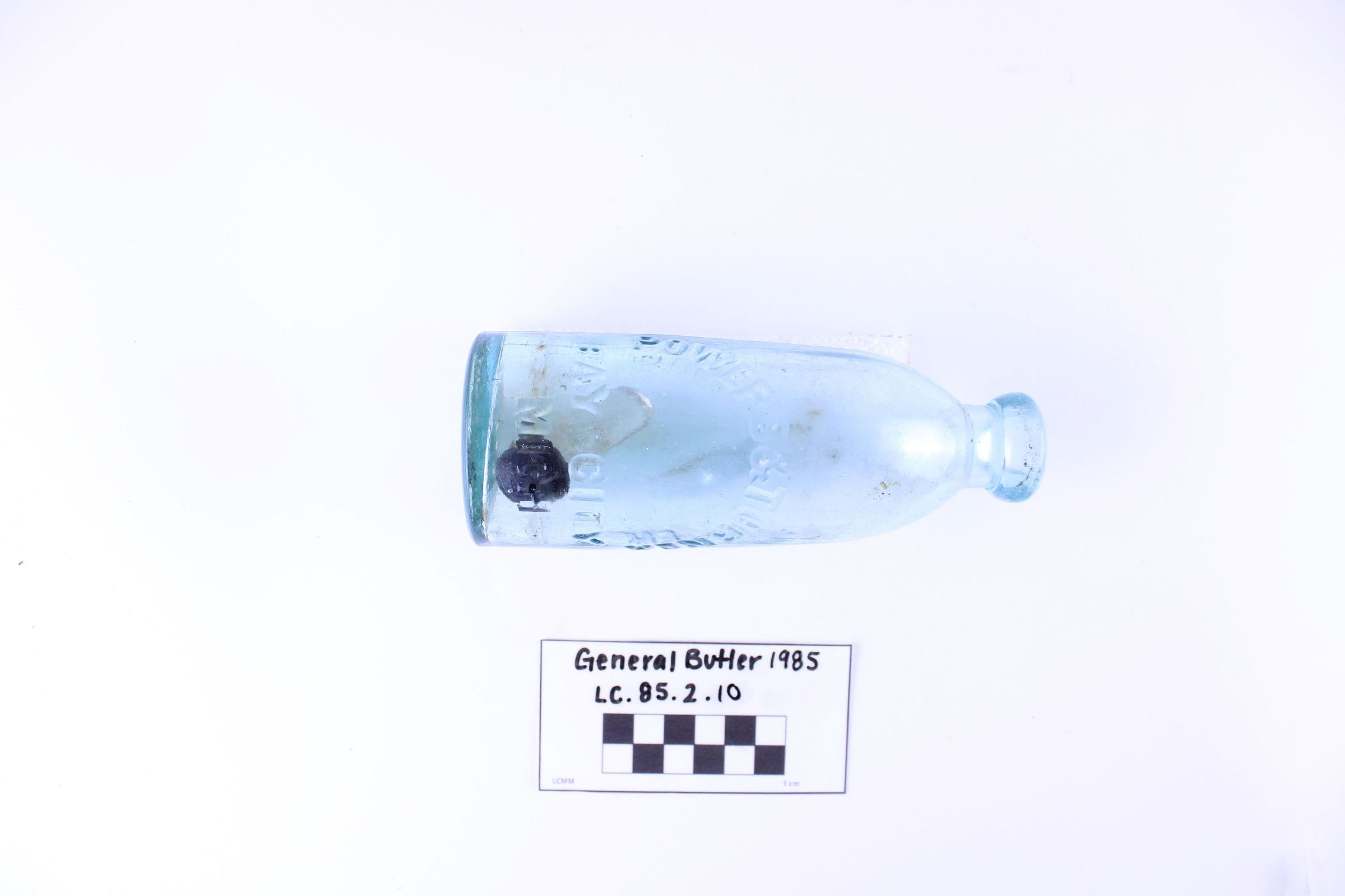 Artifact LC-85-2-10 is one (1) blue glass bottle. There is a glass stopper is trapped within the bottle. The side of the bottle is stamped with Powers & Turner Bay City Mich. . The bottom of the bottle is stamped with John Matthews Pat Oct 11 1864 New York.
