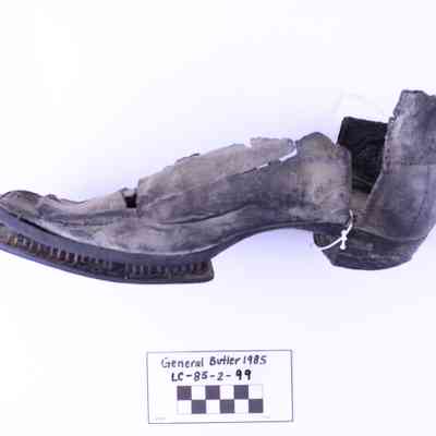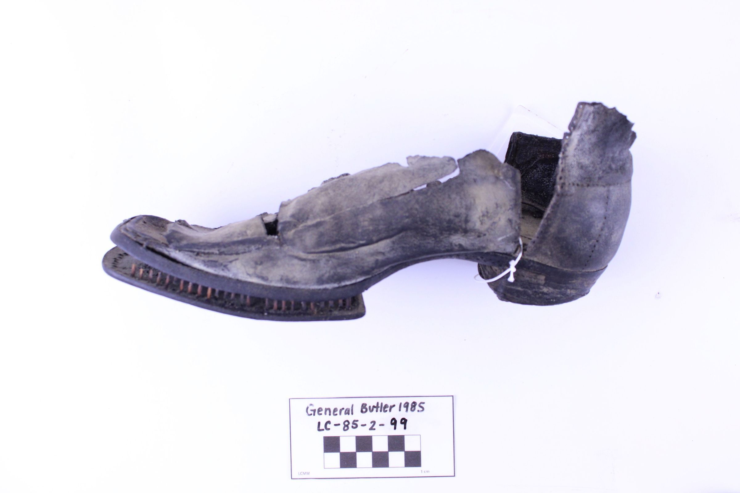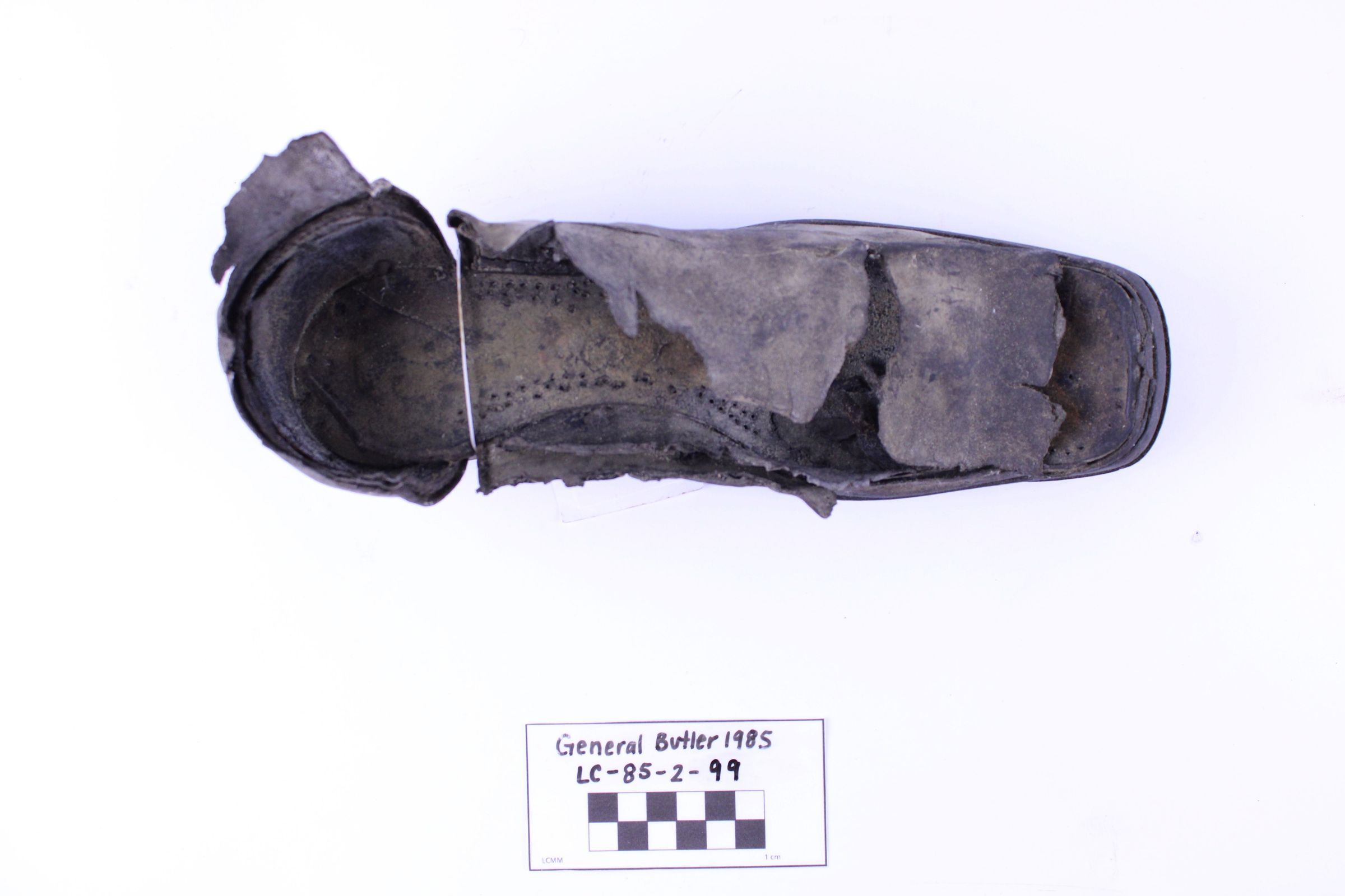 Artifact LC-85-2-99 is a square-toed leather boot with a short heel. The leather has deteriorated due to wear and age, causing large amounts of the material across the top of the shoe to be lost.