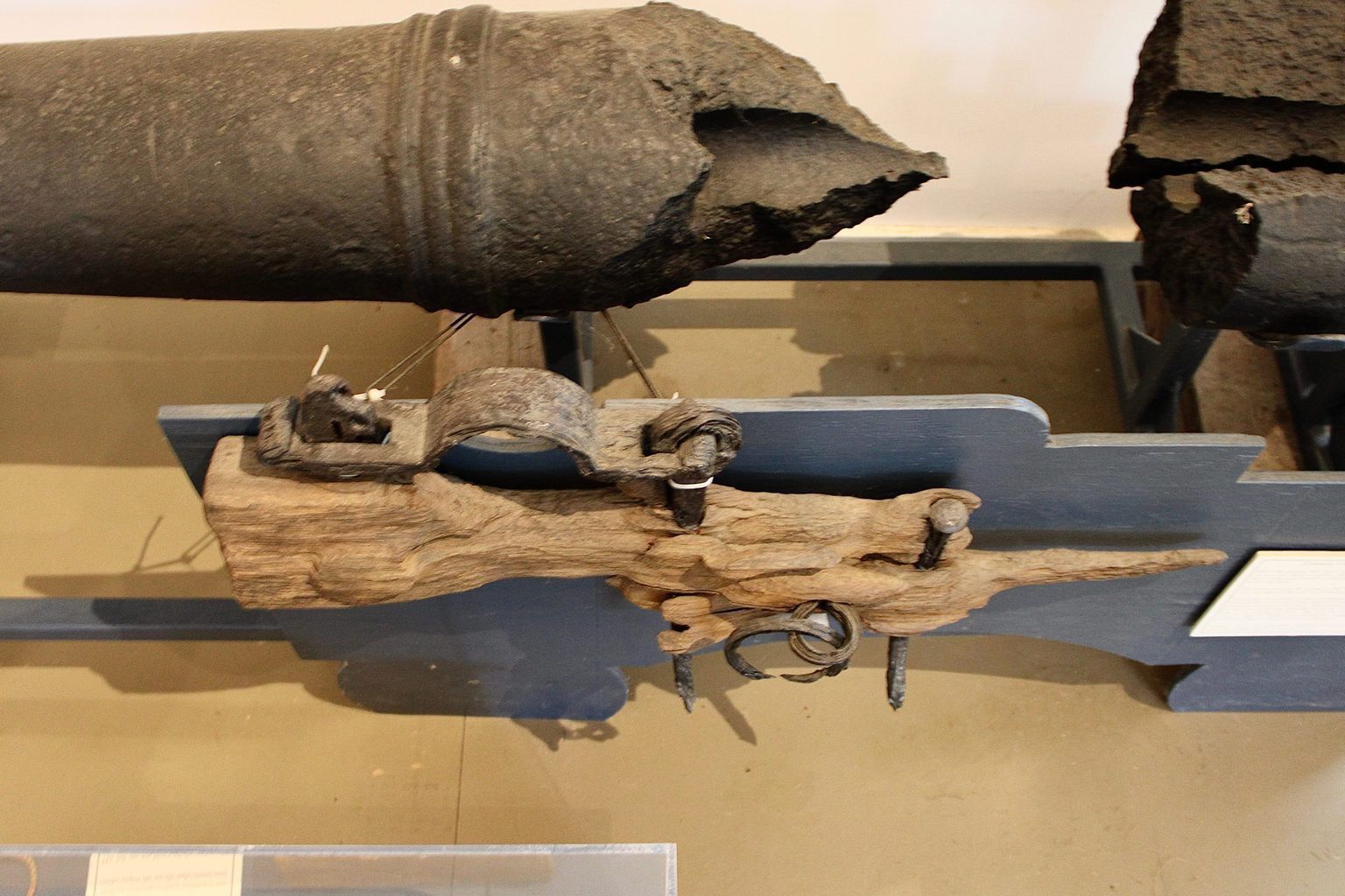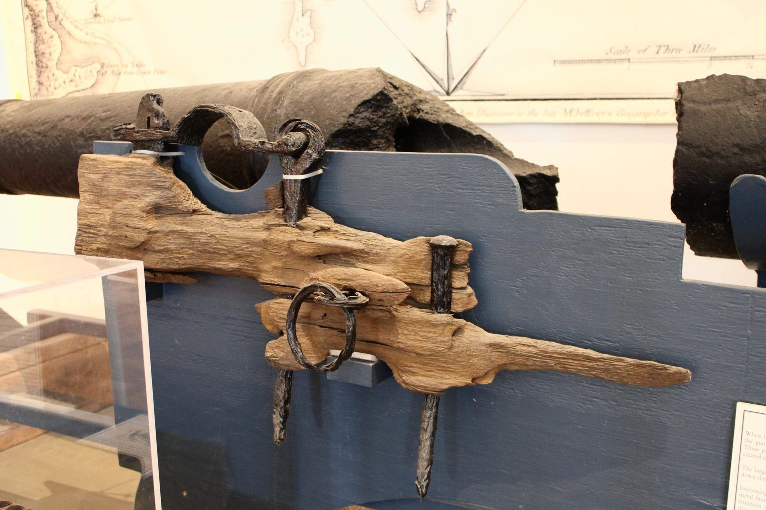 Artifact 00-01 is a fragment of the cannon carriage associated with the exploded cannon. It is made of wood and iron.
