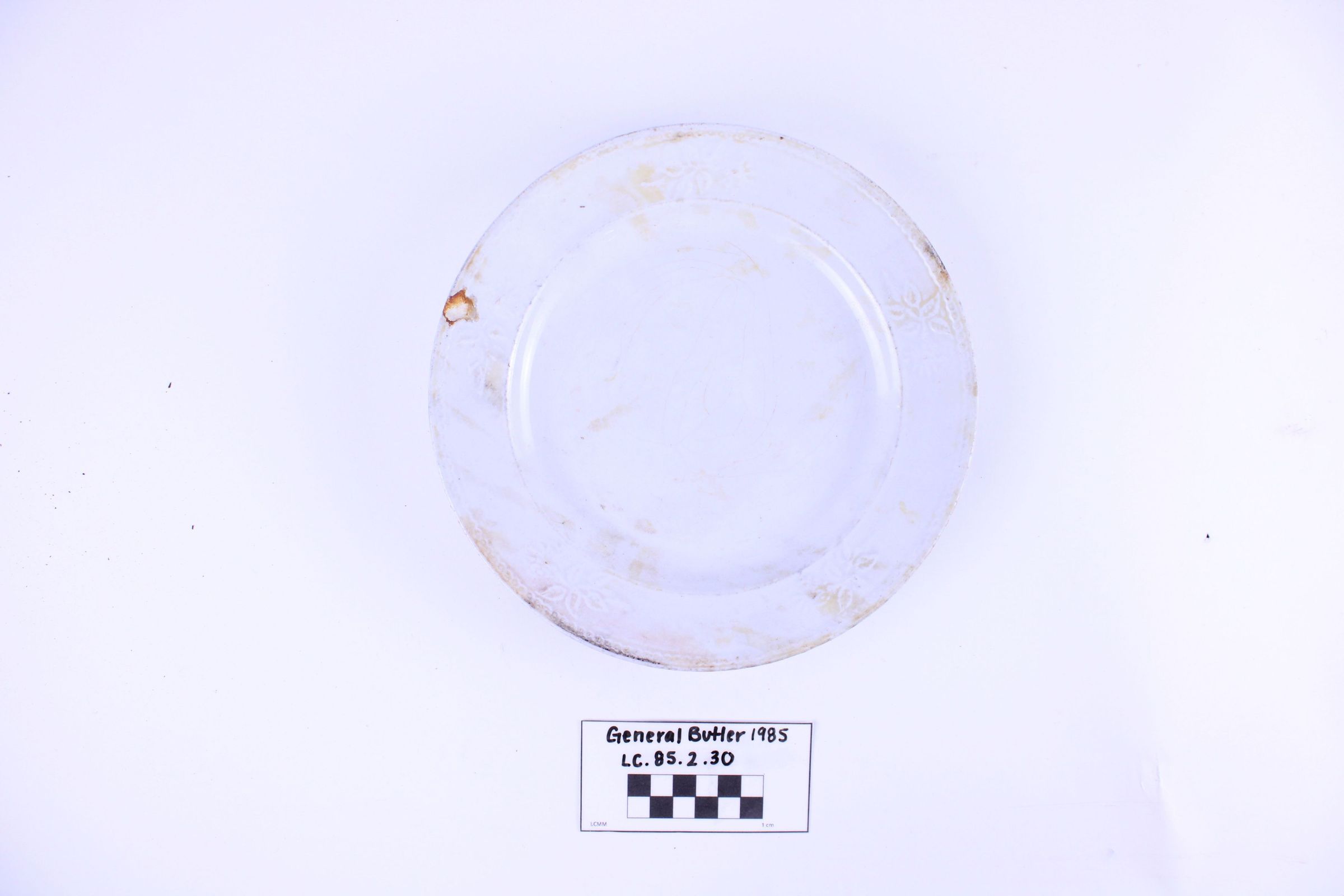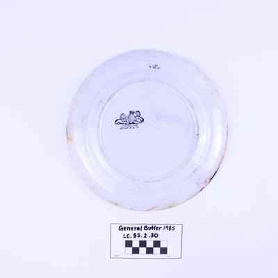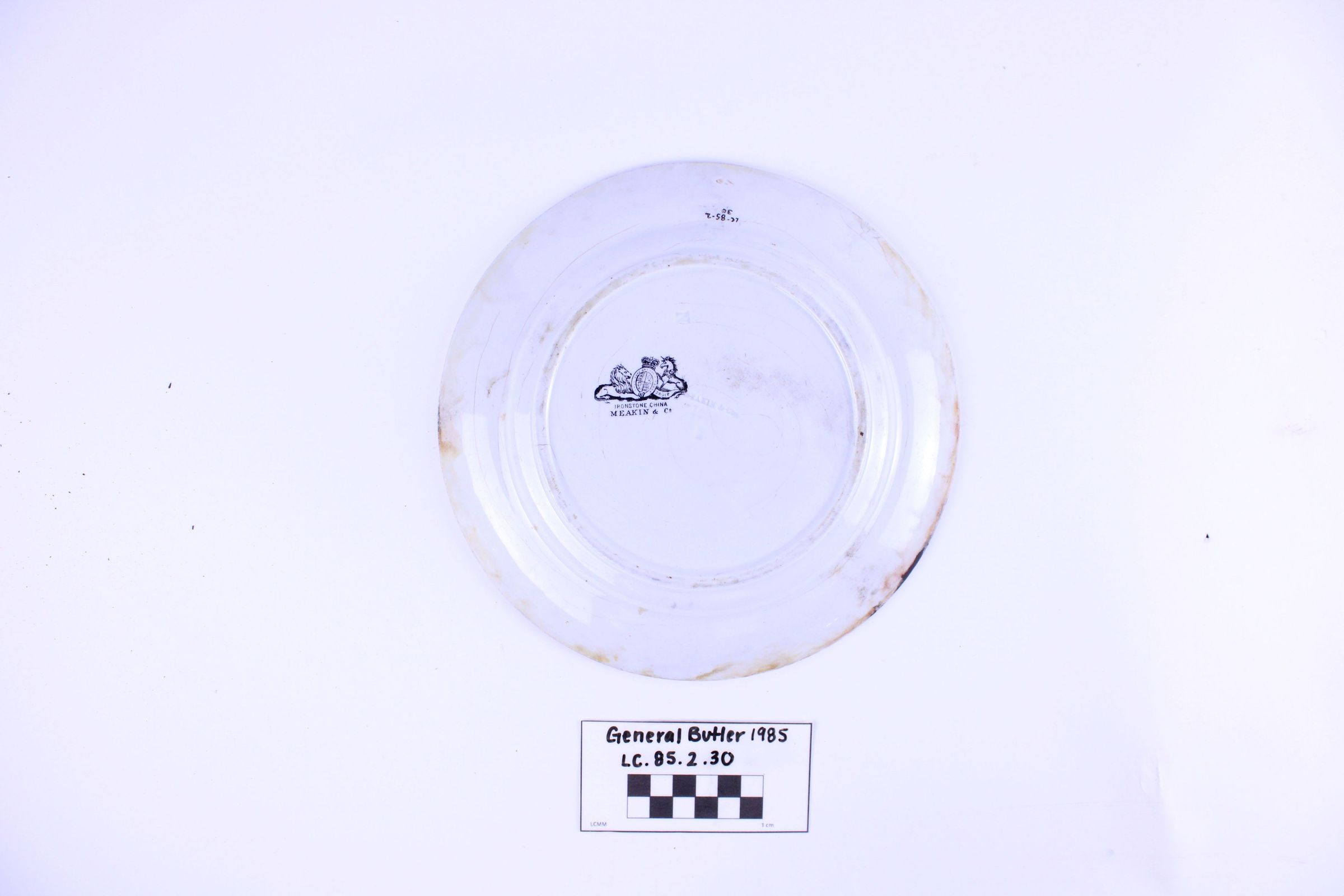 Artifact LC-85-2-30 is one (1) white ceramic plate from the General Butler. The plate has small chips and crazing causing bands of brown discoloration across the face and rim. Additionally, there are also small leaves running across the rim. Makers mark at the base of the plate shows crest with a crown at center with a lion laying down on one side and a unicorn sitting on the other. Beneath is written Ironstone China, J. & G. Meakin & Co