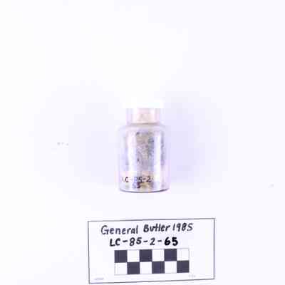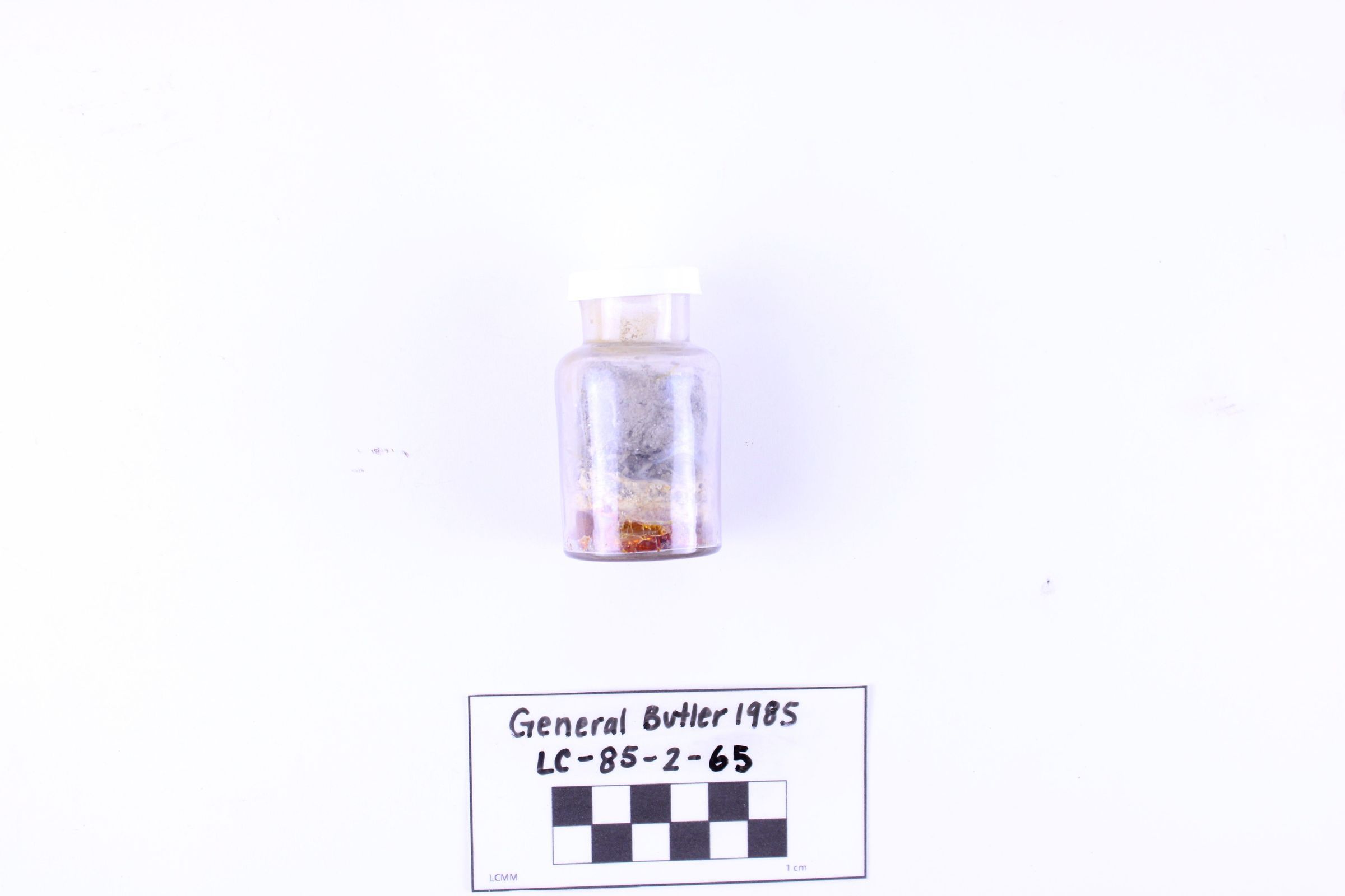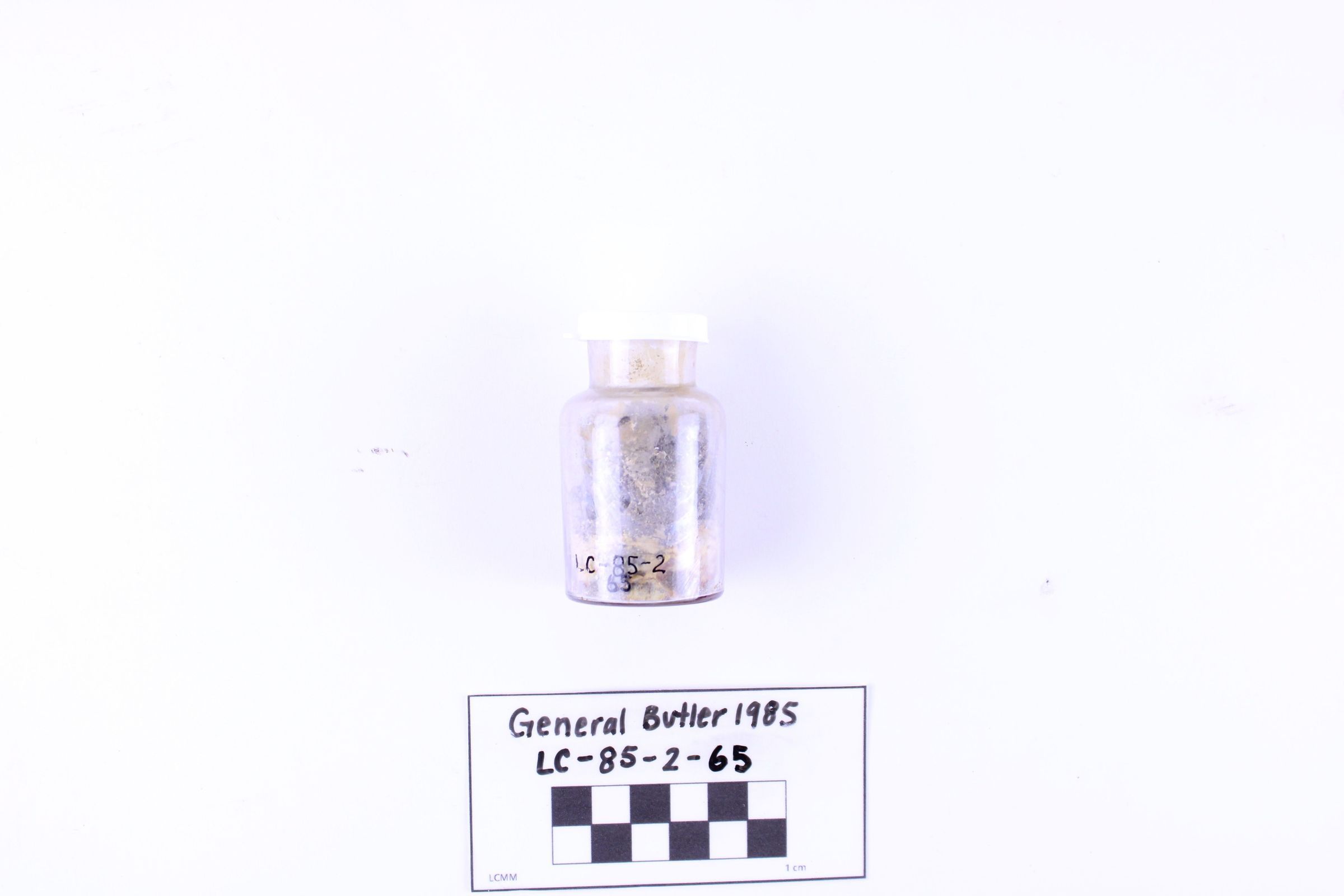 Artifact LC-85-2-65 is a small glass bottle filled with a possibly medicinal material. It has a flat, white lid and small, round body.