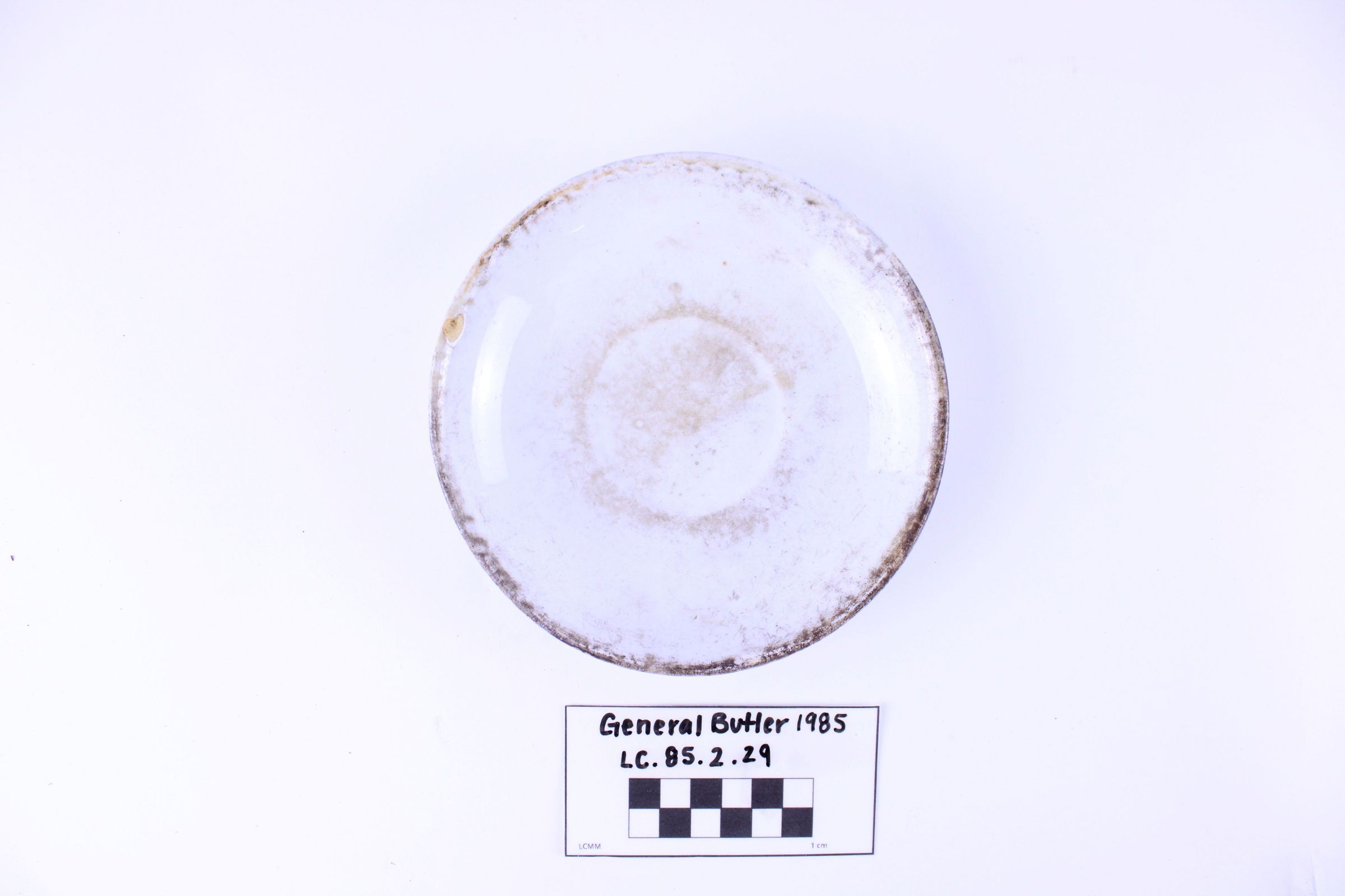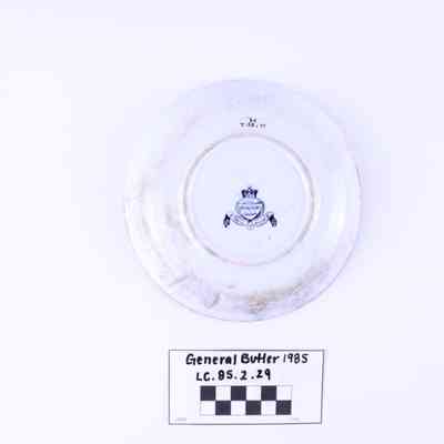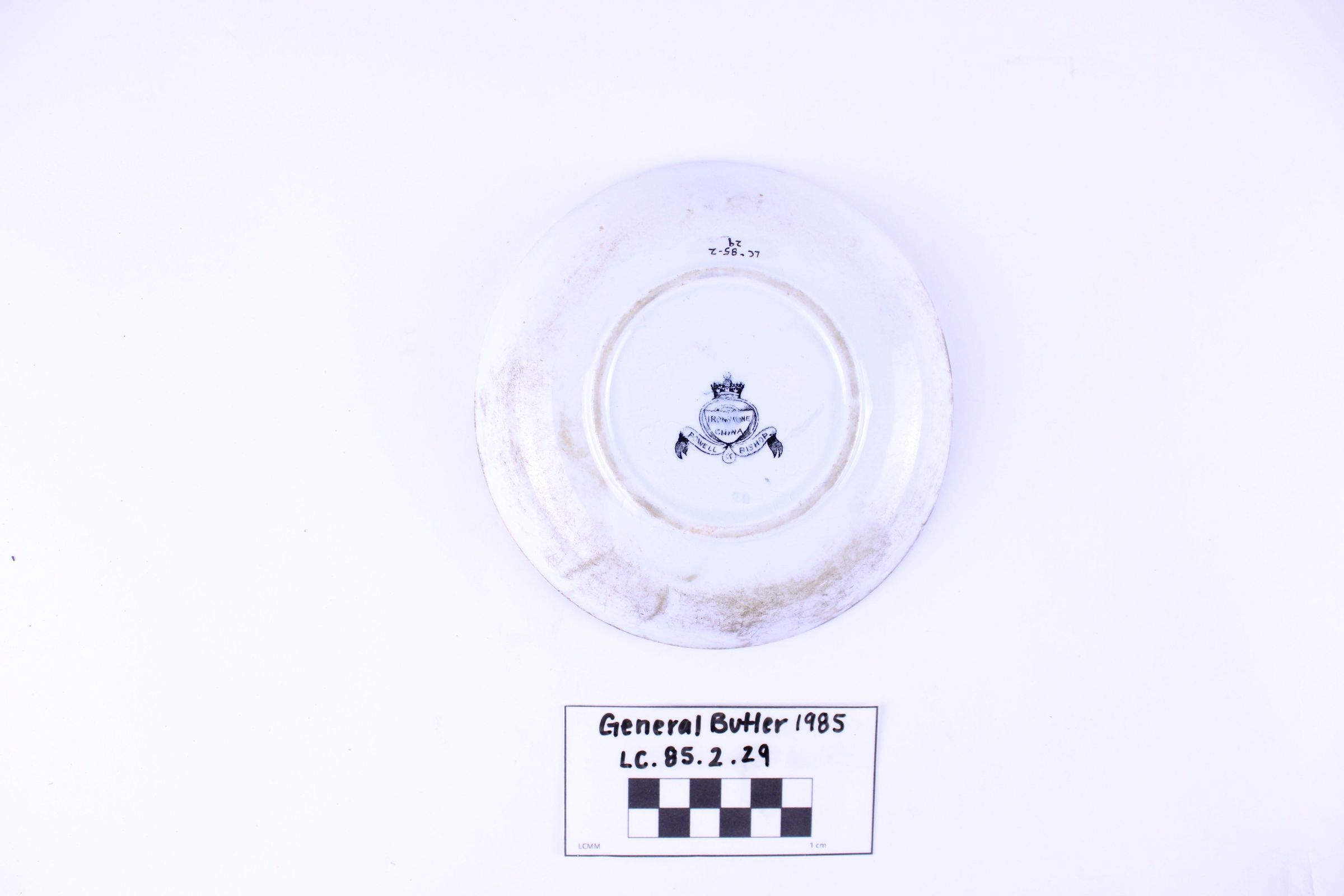 Artifact LC-85-2-29 is one (1) white ceramic plate from the General Butler. The plate has brown discoloration along the rim and inner setting. The bottom is a white glaze has a lesser degree of brown discoloration running throughout. The makers mark has a crown above the words Ironstone China, and ribbons beneath for the names Powell & Bishop.