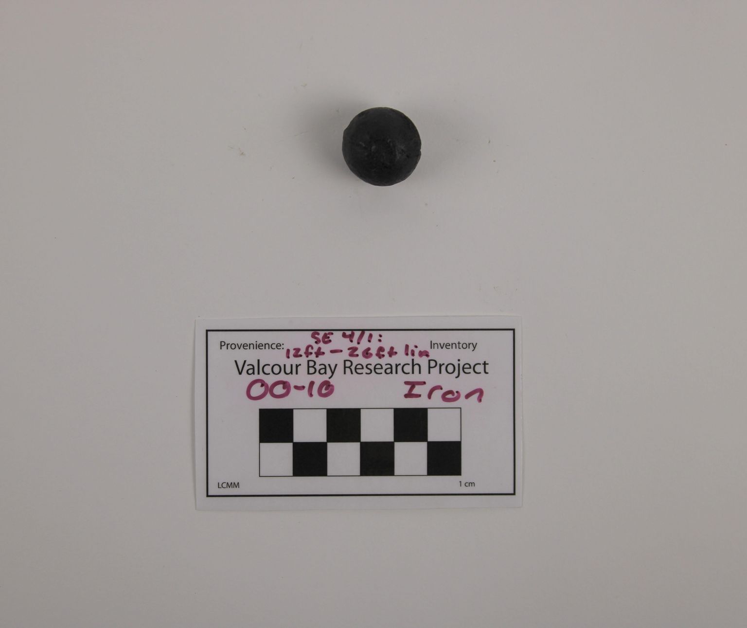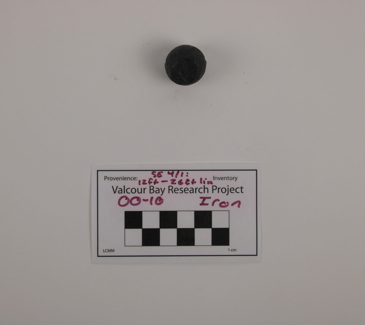 Artifact 00-10 is a piece of cast iron cluster (canister or case) shot. The ball measures ⅞in (2.2cm) in diameter and weighs 1.3 oz (36.4 g). The size and weight of the ball suggest that it came from a small caliber weapon, possibly a swivel gun. It is impossible to determine if this projectile is of American or British origin.