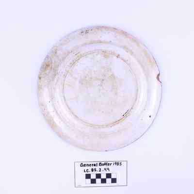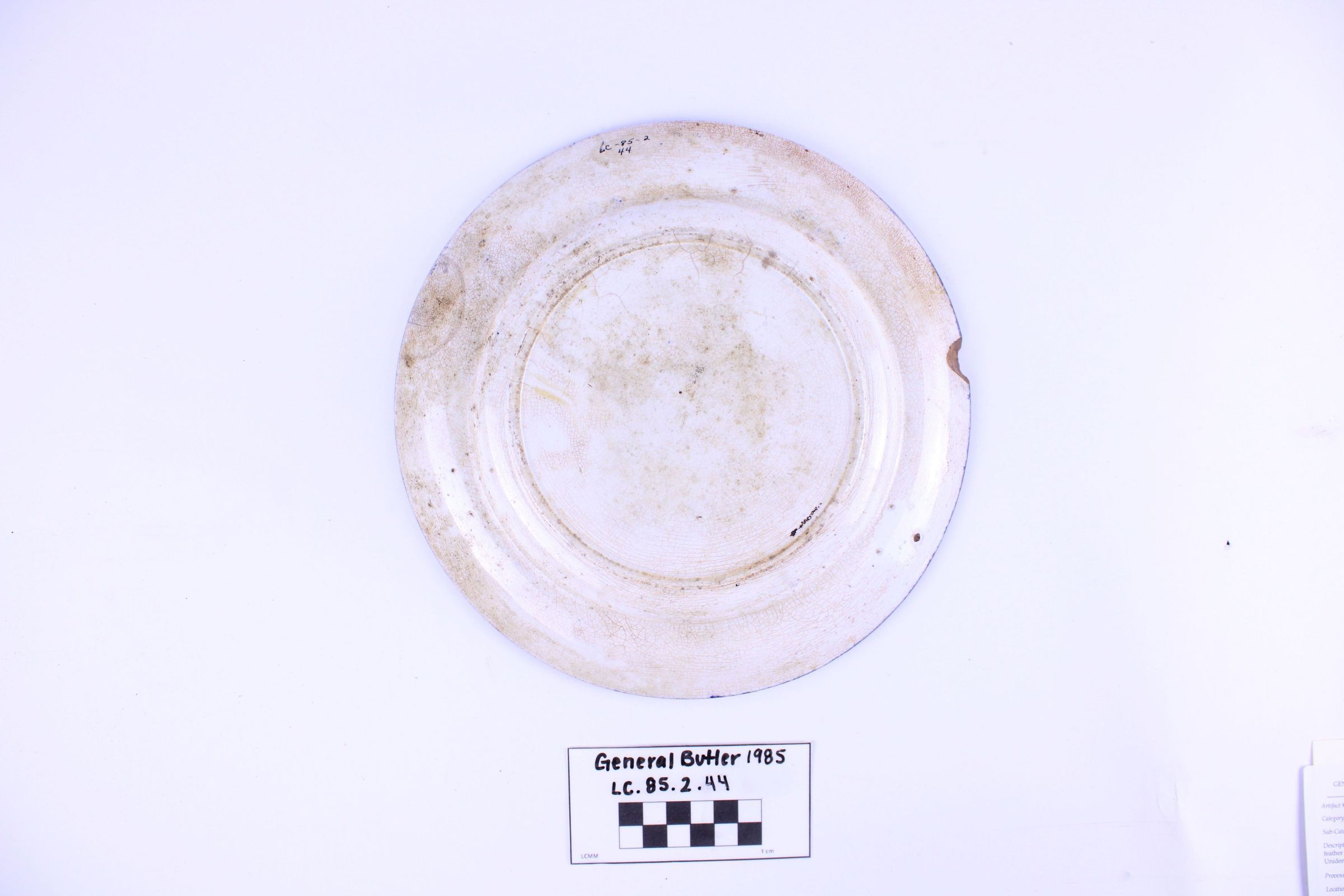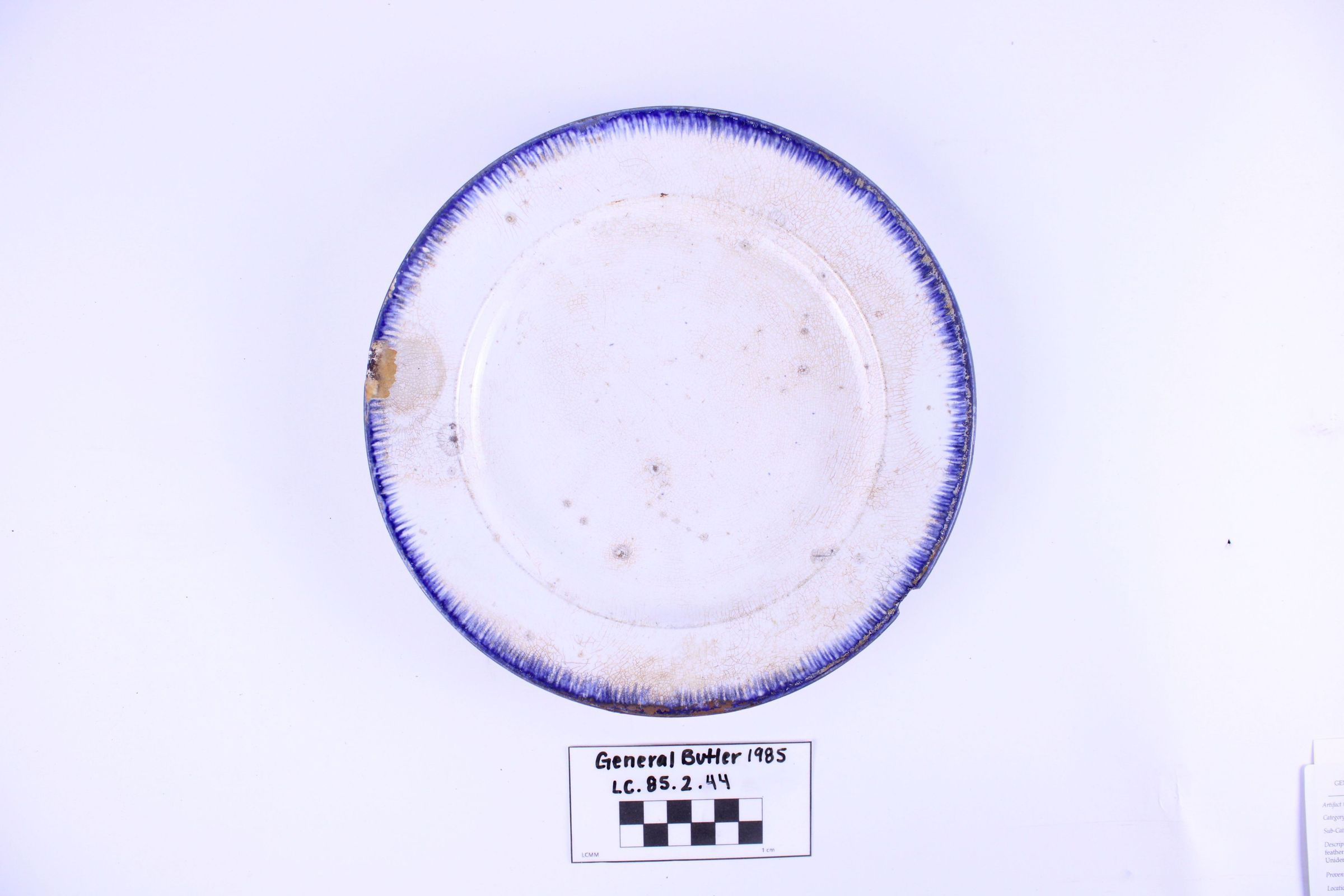 Artifact LC-85-2-44 is one (1) white ceramic plate with deep blue glaze around the rim, pulled from the General Butler. The plate has small chips along the rim, and minor speckling of discoloration across the face. The bottom is a white glaze with similar brown discoloration running throughout. No makers mark is visible.