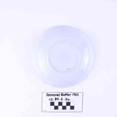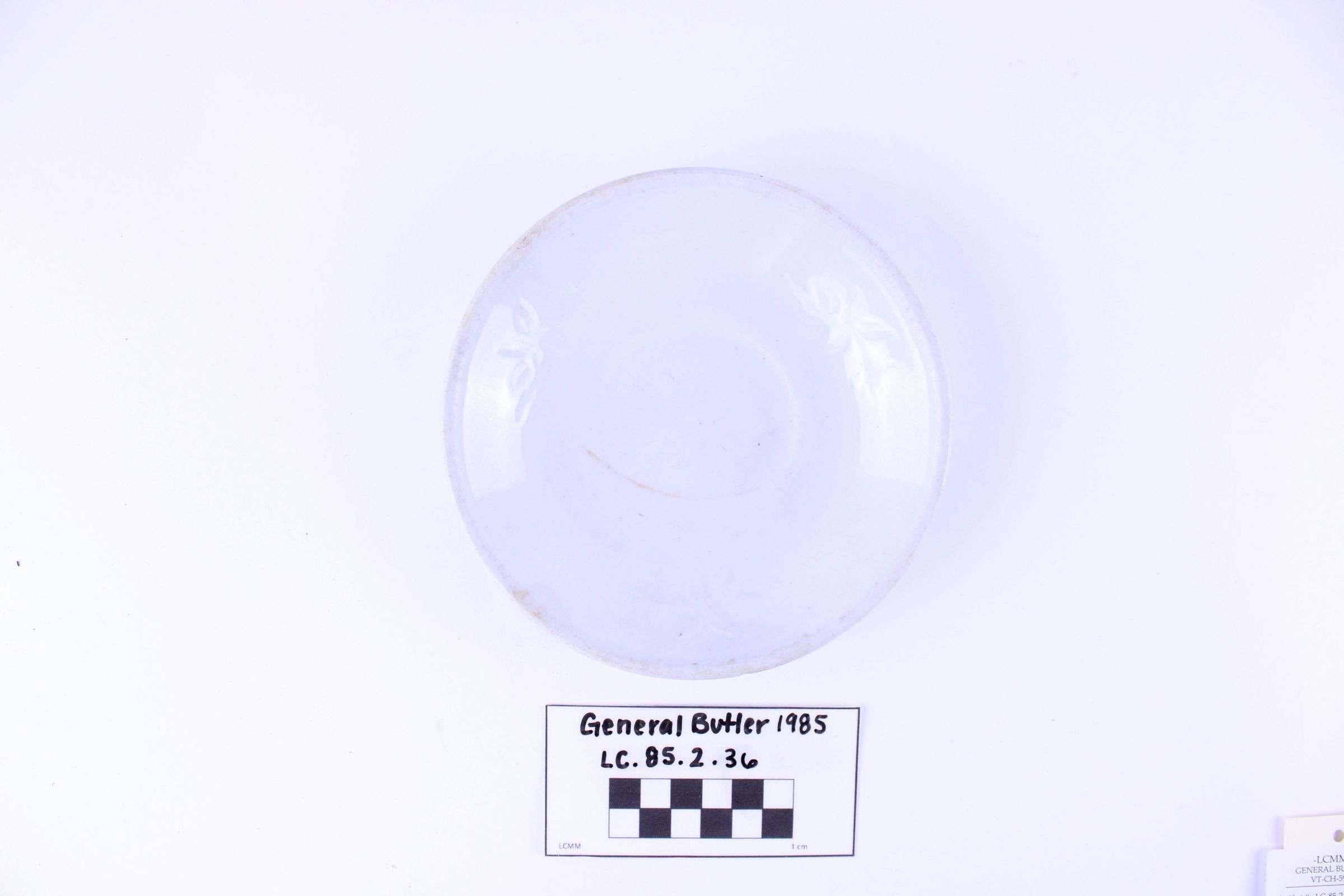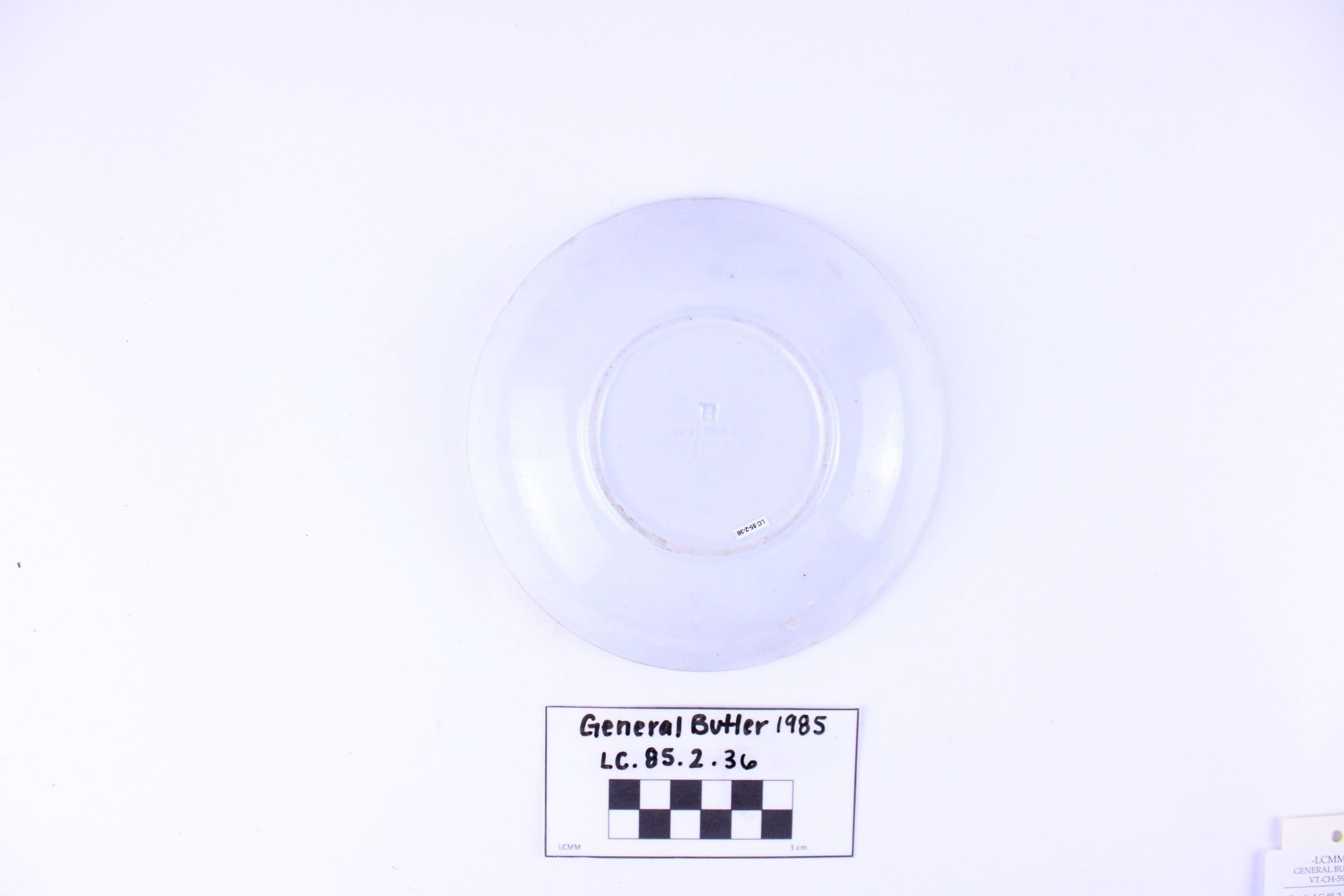 Artifact LC-85-2-36 is one (1) white ceramic plate from the General Butler. The plate has three floral details running on the inner rim of the plate and only minor chipping and signs of wear. Faded and illegible makers mark on the bottom.
