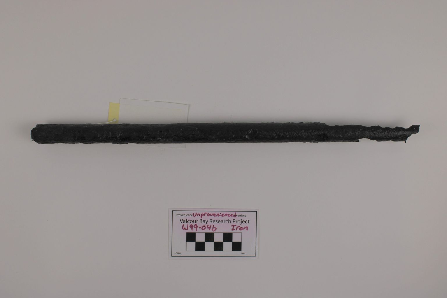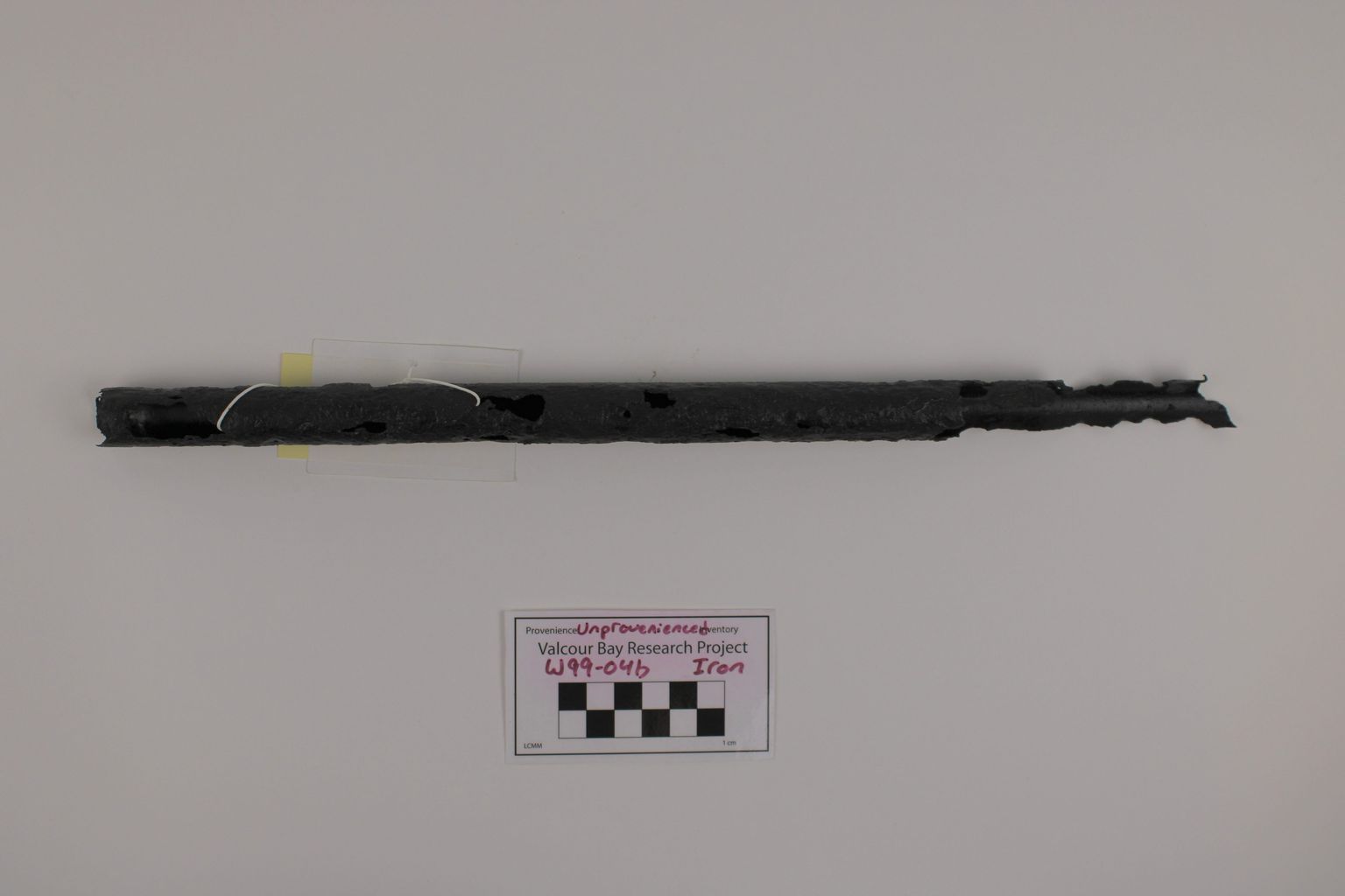 Artifact W99-04.02 is a fragment of a musket barrel. It is made of iron. There are many holes and cracks throughout the barrel.