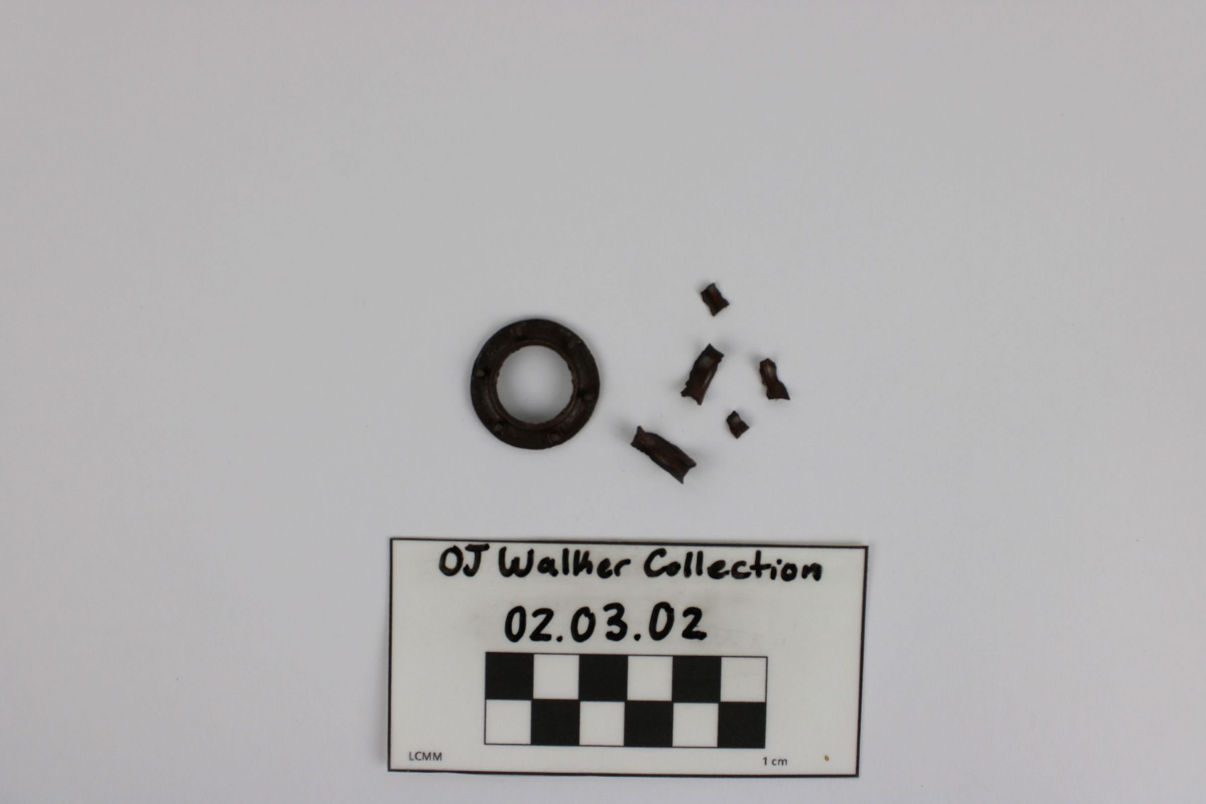 Artifact 02.03.02 is a lot of six (6) sail grommet fragments.