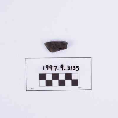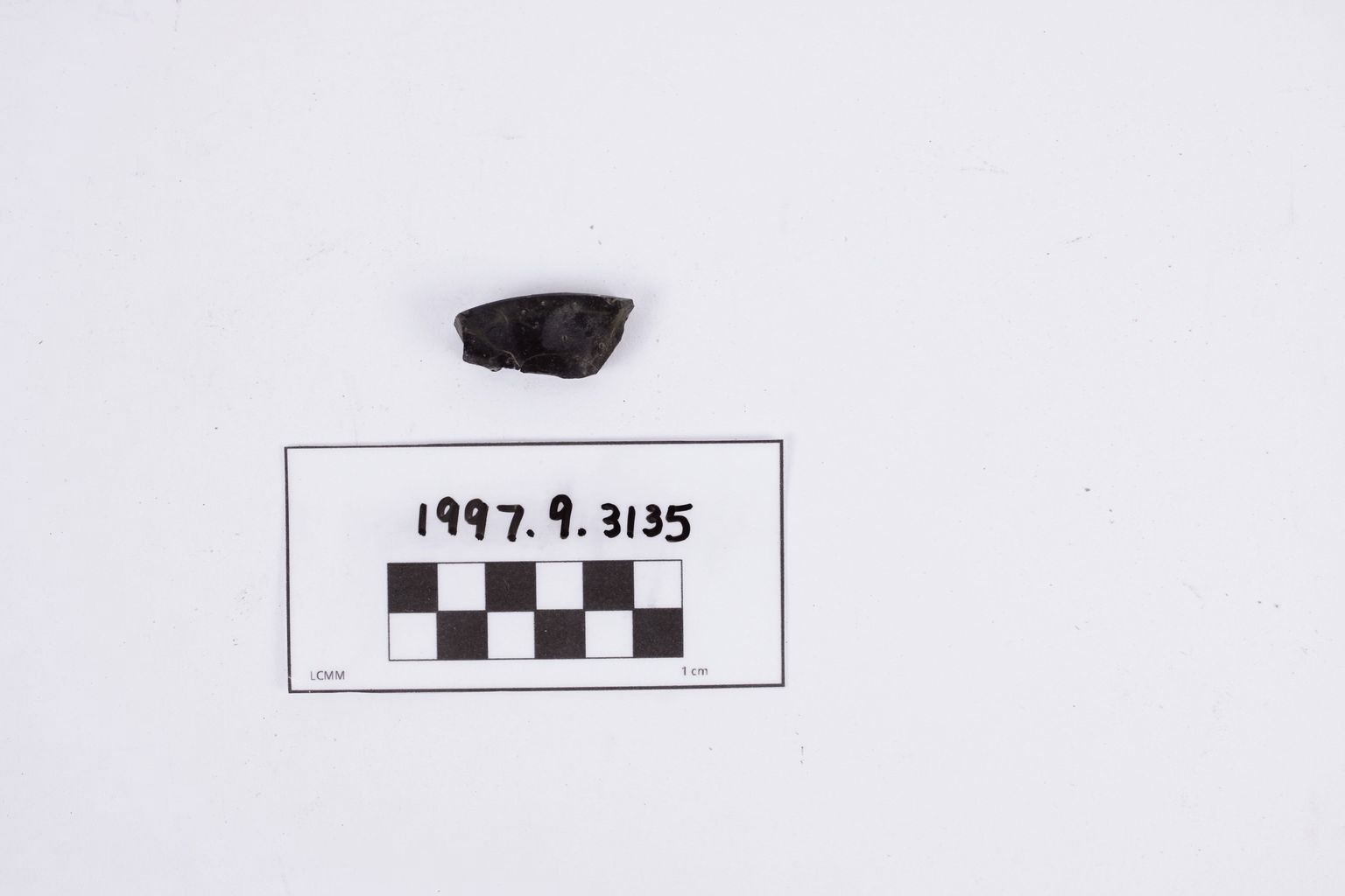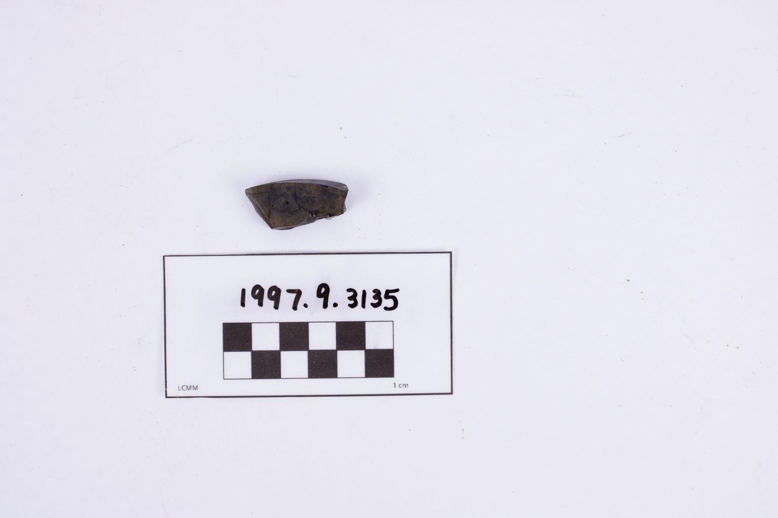 Artifact 1997.9.3135 is a fragment of dark green flat glass, possibly from a square medicine vial.Collection