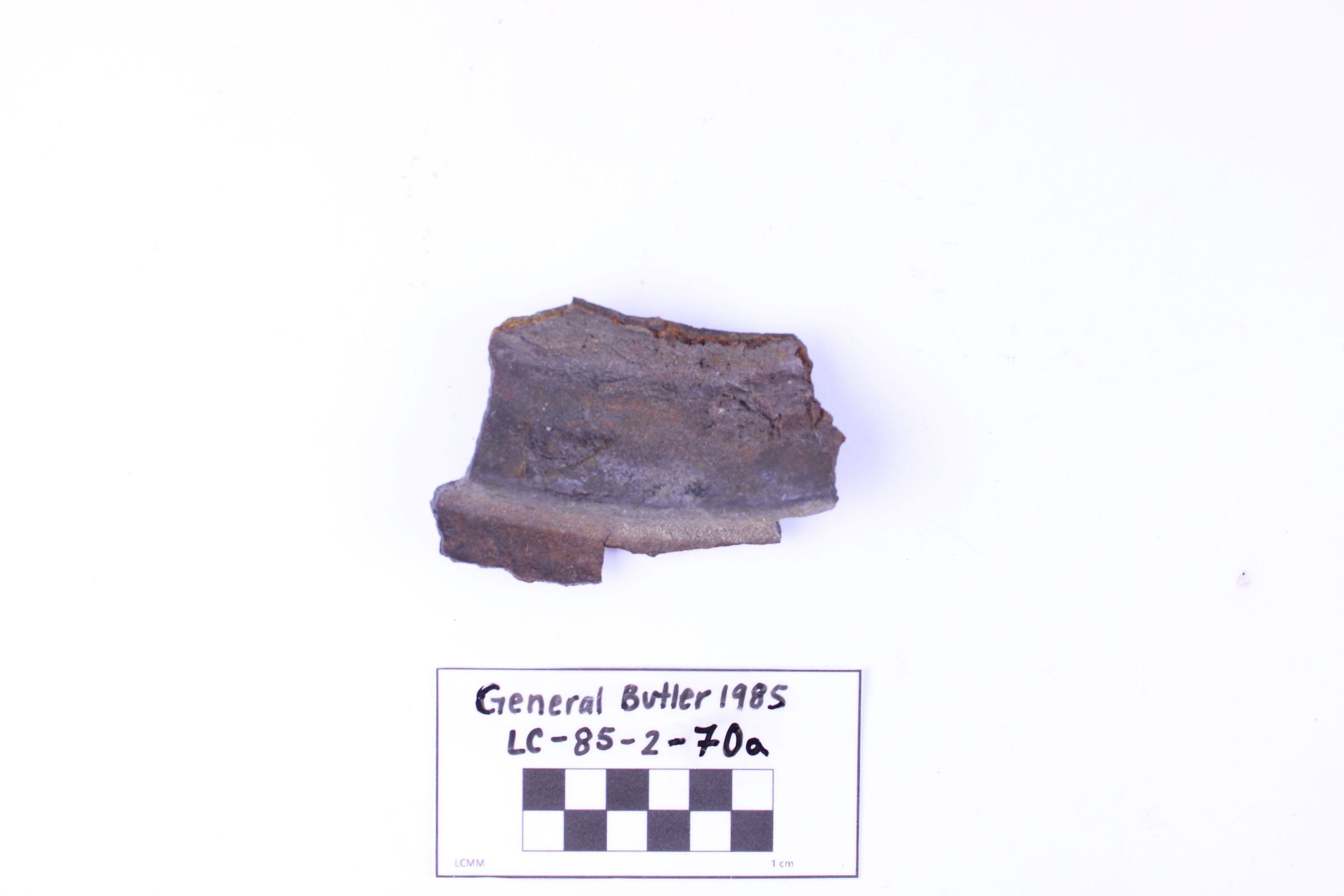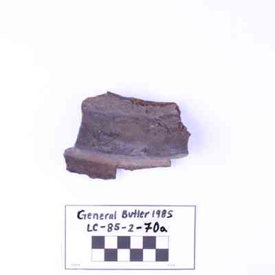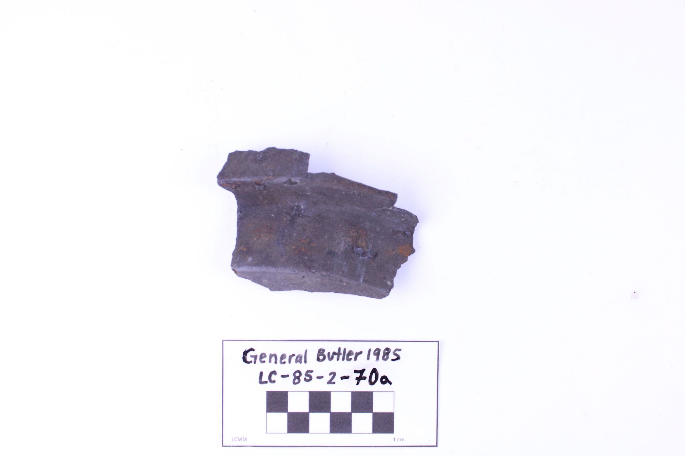 Artifact LC-85-2-70a is a large fragment of a cast iron pot. It has a tiered edge, making it likely part of the upper rim of the pot.