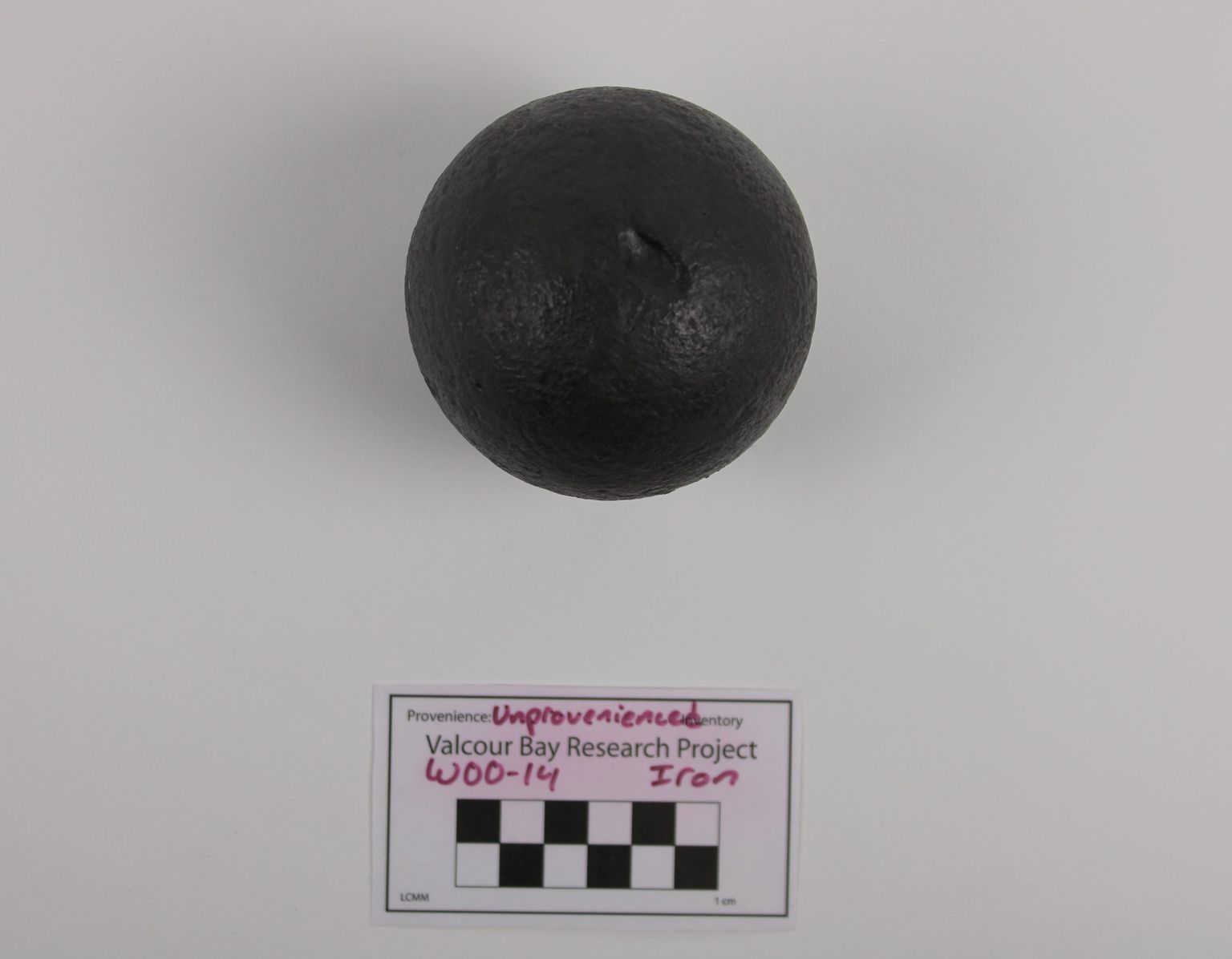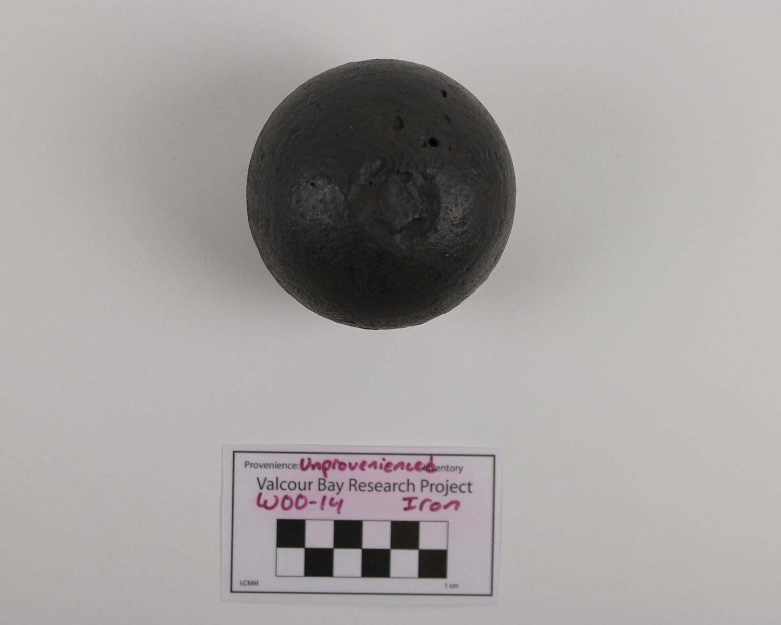 Artifact W00-14 is 6 lb cast-iron round shot. There are several holes along one side, possibly from air pockets during casting.