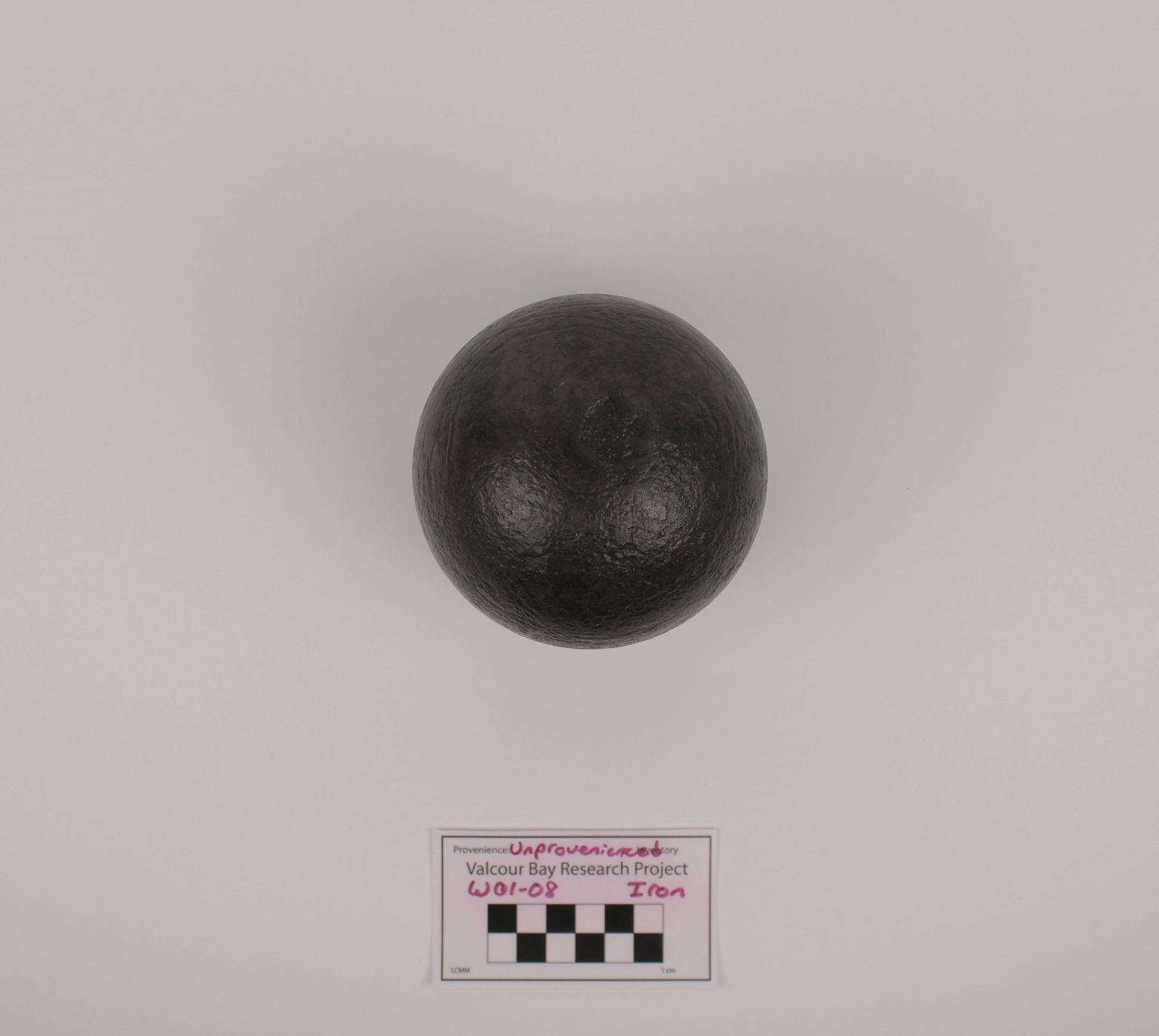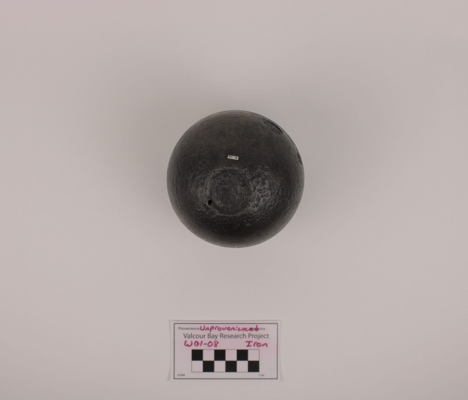 Artifact W01-08 is a 12 pound cast-iron round shot. Shot like these would have been fired from a 12-pound cannon, which were common among both the British and American fleets. This type of object, along with other shot of varying caliber, make up the most commonly recovered object from the site.Collection