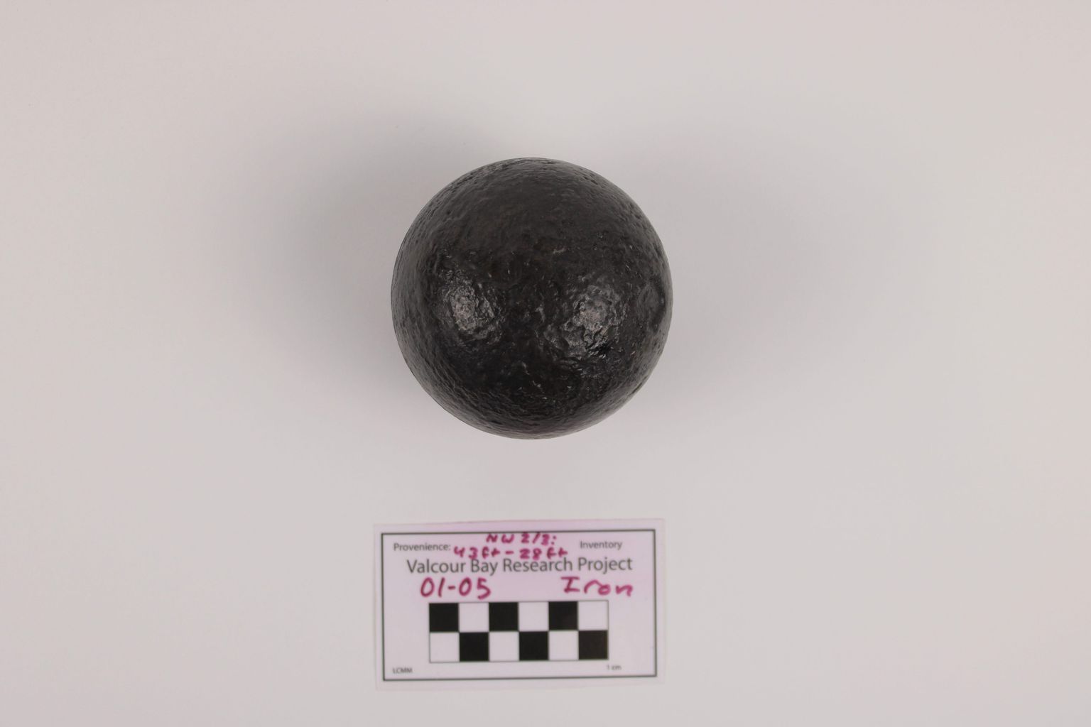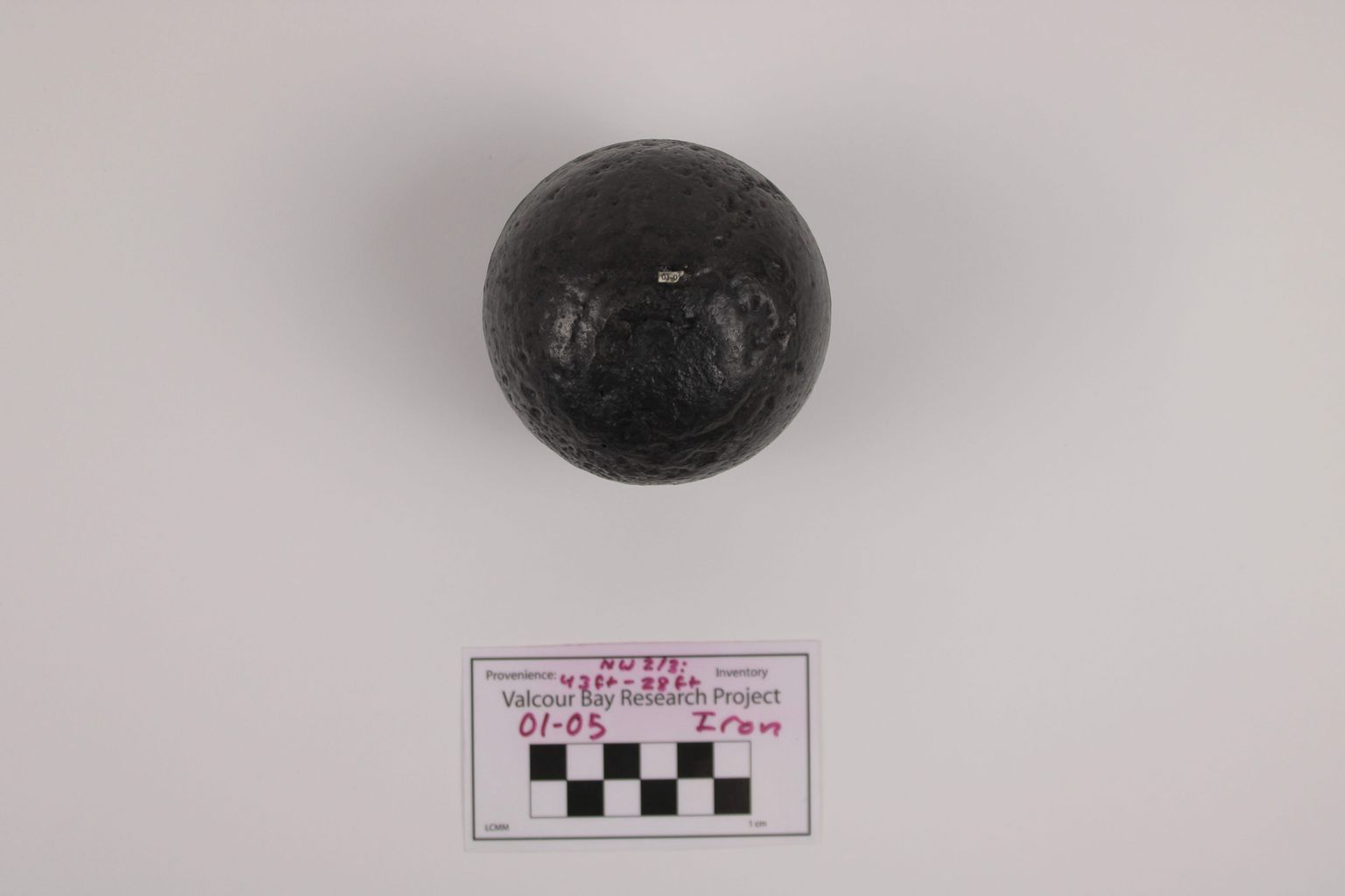 Artifact 01-05 is a cast-iron round shot. The label on this cast iron object is damaged and only the top of the "5" is visible. There is a British broad arrow cast into the shot's surface, indicating that this artifact was fired by a British vessel.Collection