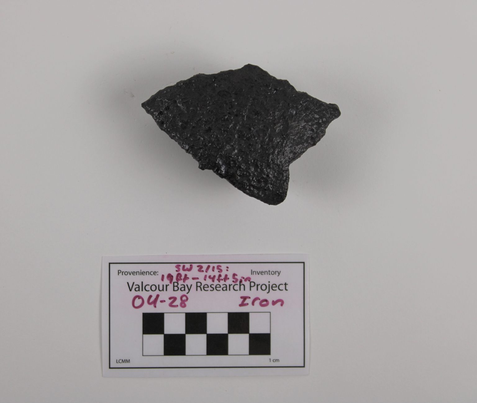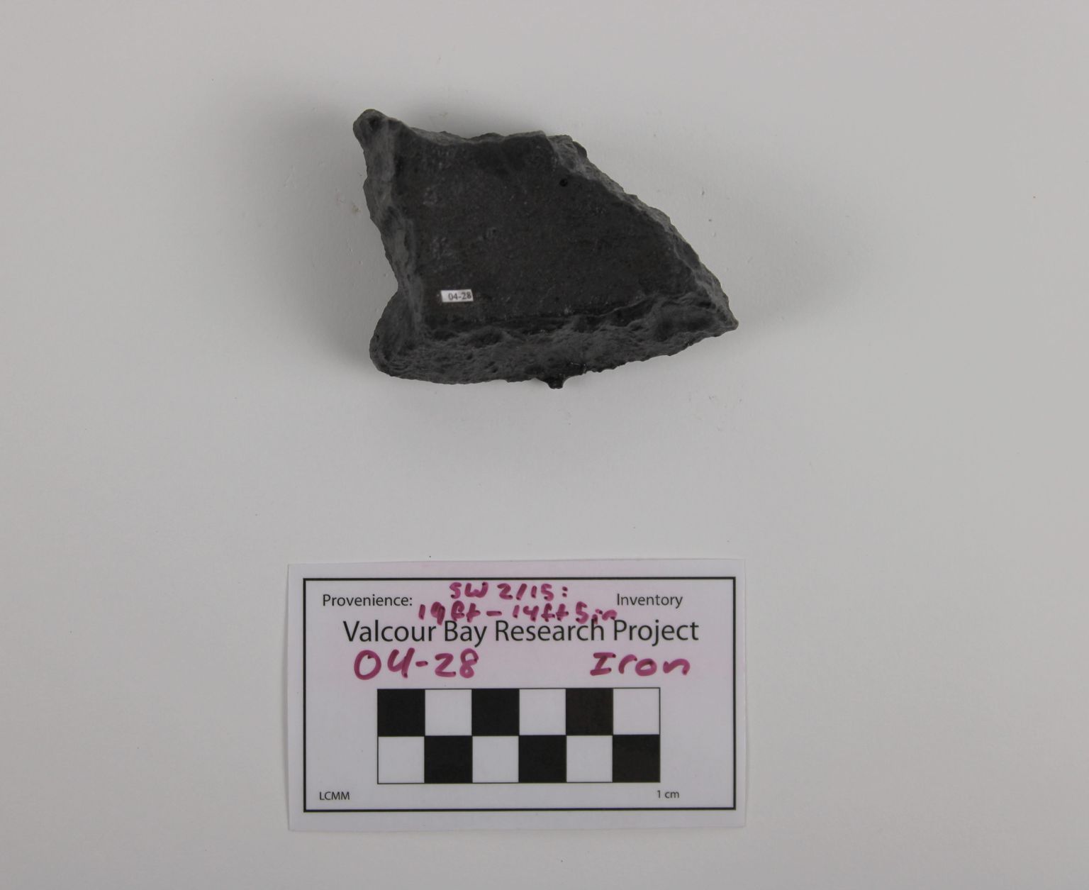 Artifact 04-28 is a fragment of a Howitzer shell. It has an irregular shape and smooth interior and minor pitting on the exterior.