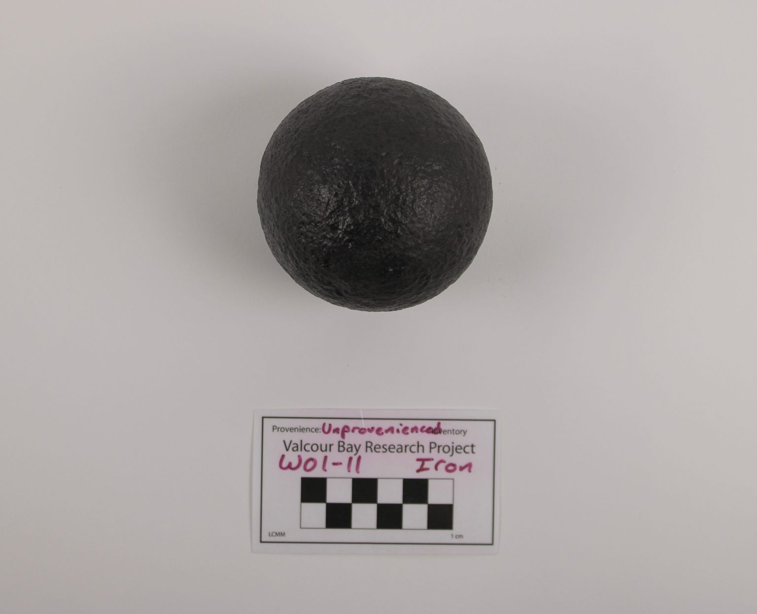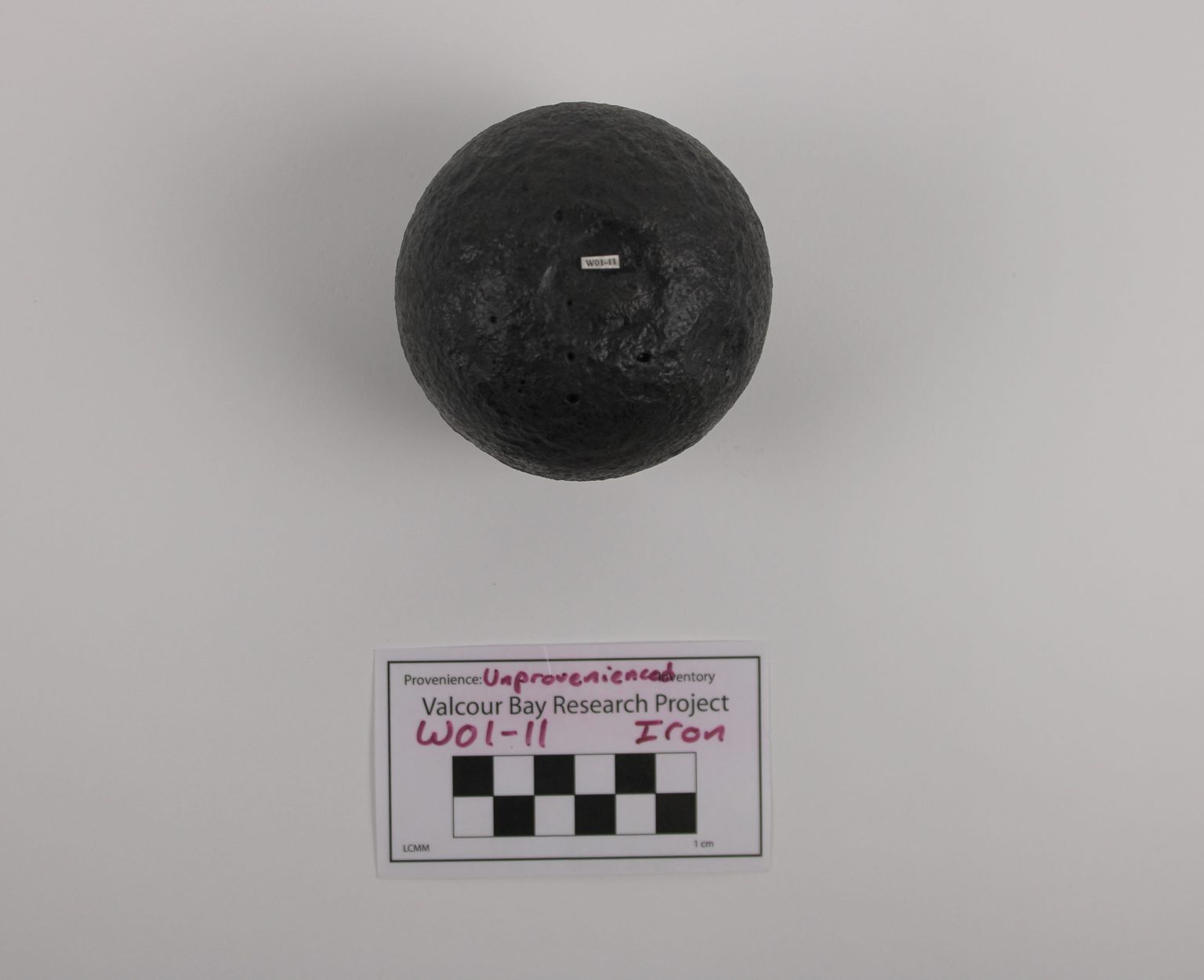 Artifact W01-11 is a 6lb round shot. There is some minor pitting and a few holes on the object's surface. There may be a British broad arrow on its surface as well, but this has not been confirmed.Collection