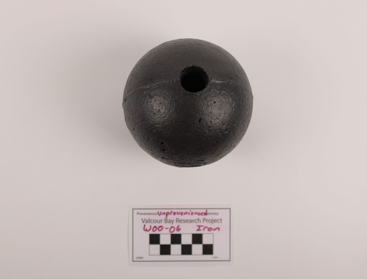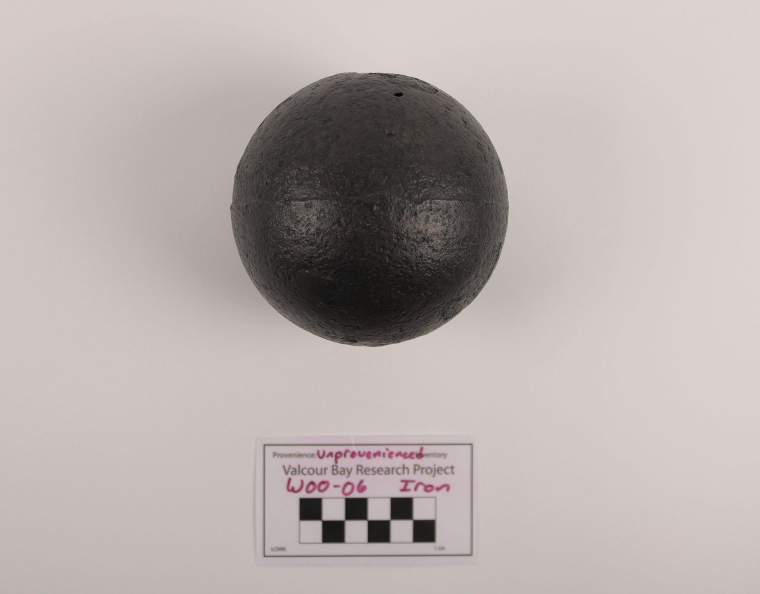 Artifact W00-06 is a 7 lb cast-iron Coehorn Mortar shell. There are some small holes along the artifact's surface, and the casting mark is partially uneven.